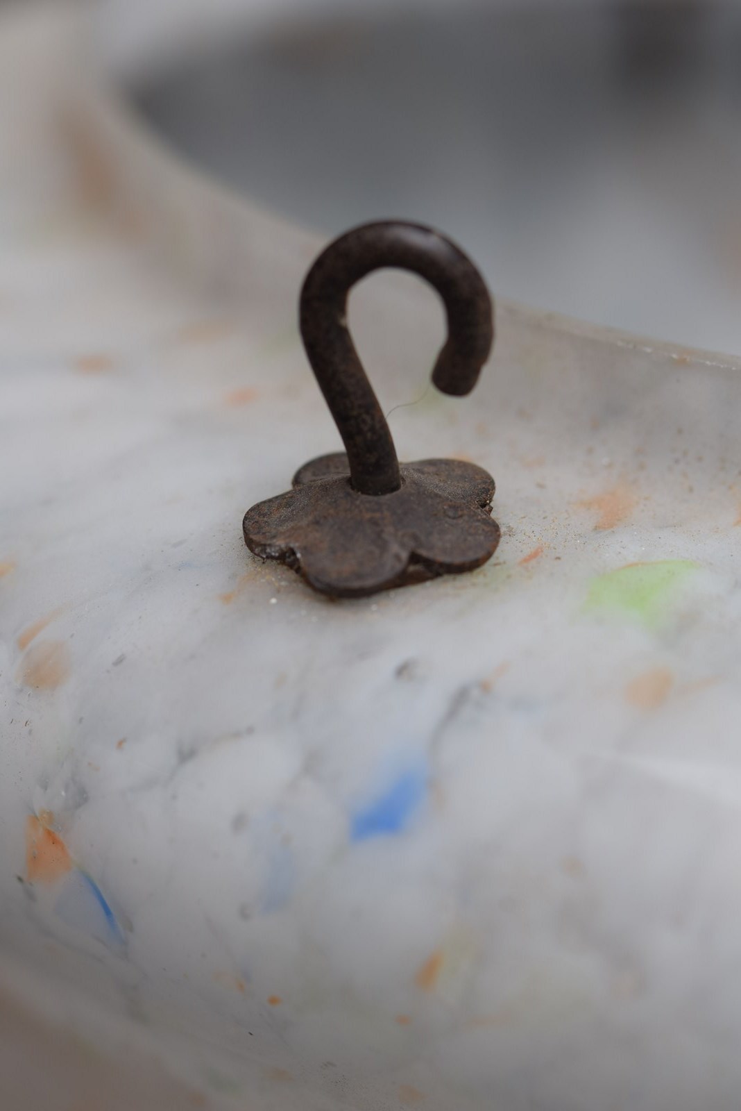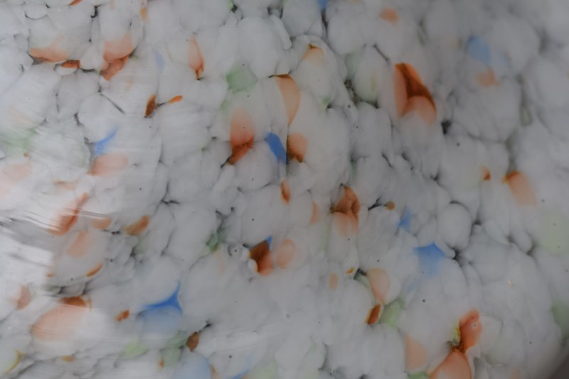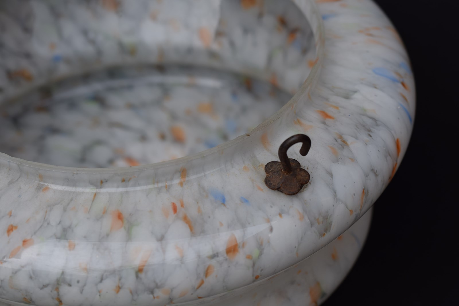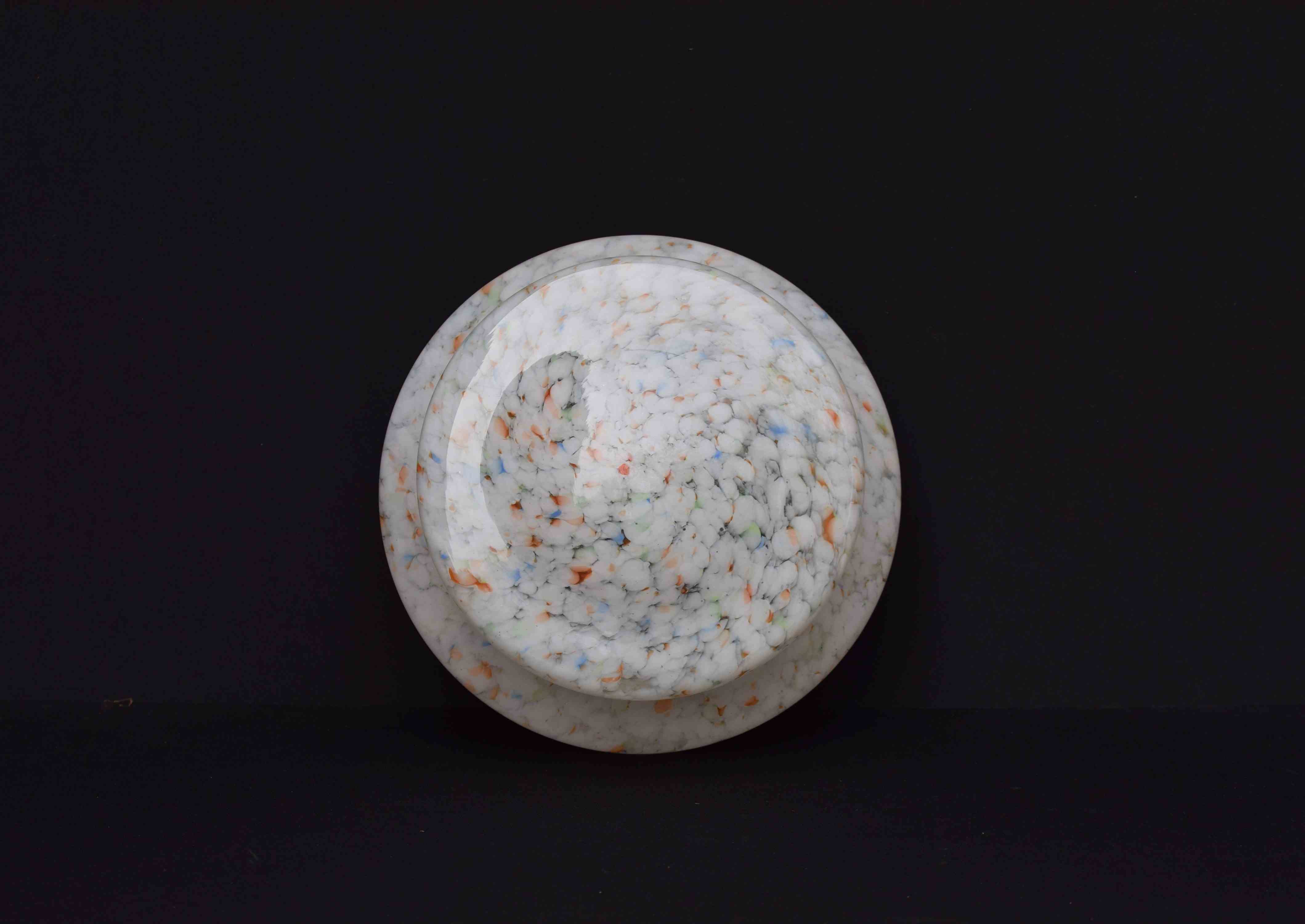 A very good condition English Art Deco period plafonnier or flycatcher glass shade. Mottled & marbled glass with whites, oranges, blues, greens etc. Supplied with the original hanging chains , no ceiling hook. Approximately 11.5 inches in diameter & 5.5 inches in depth. Sale includes delivery within the United Kingdom, it will be packed well.