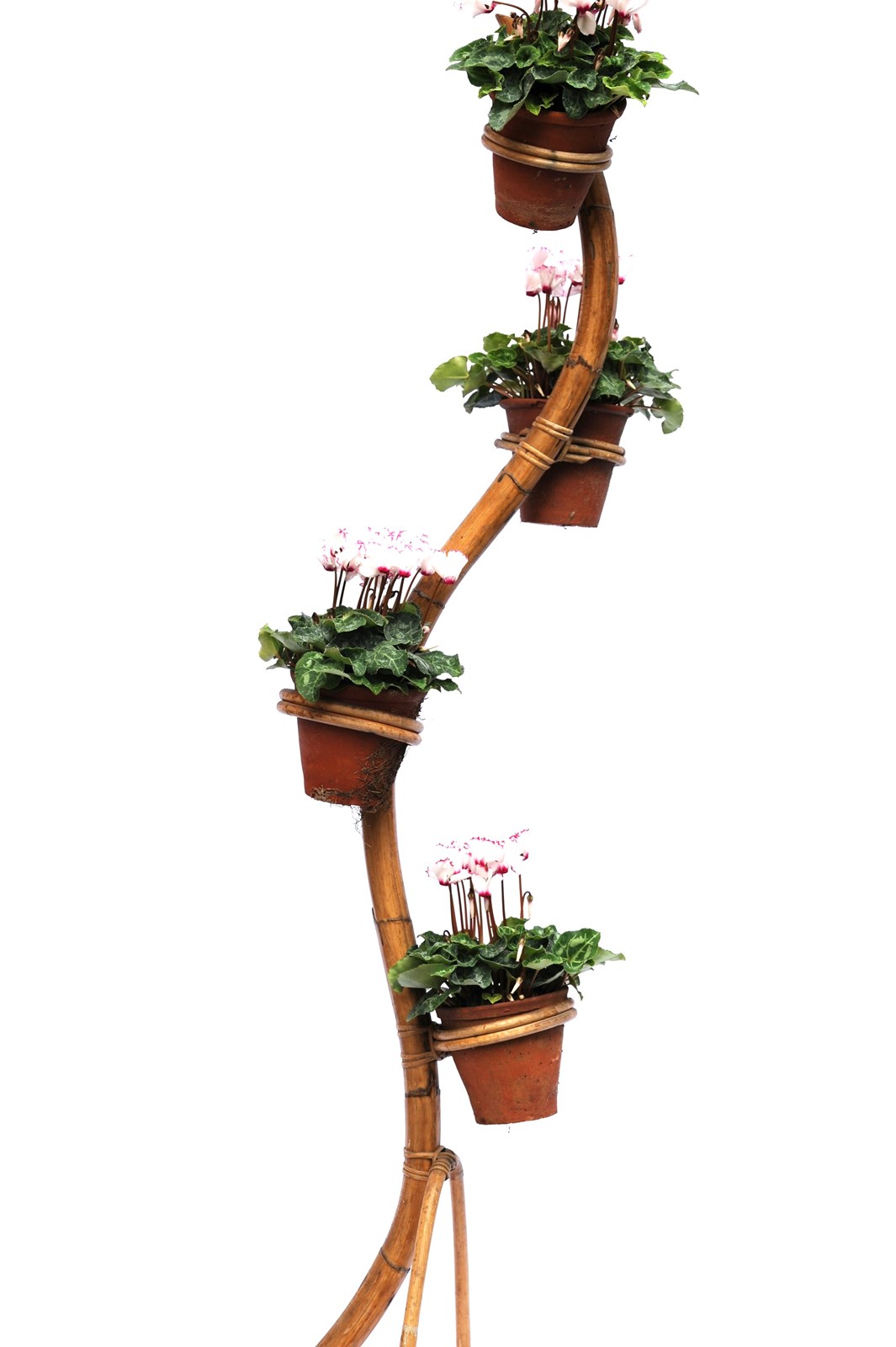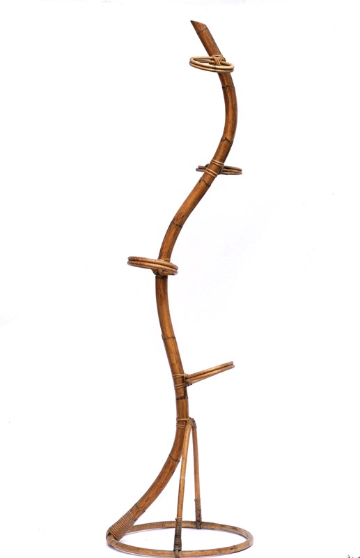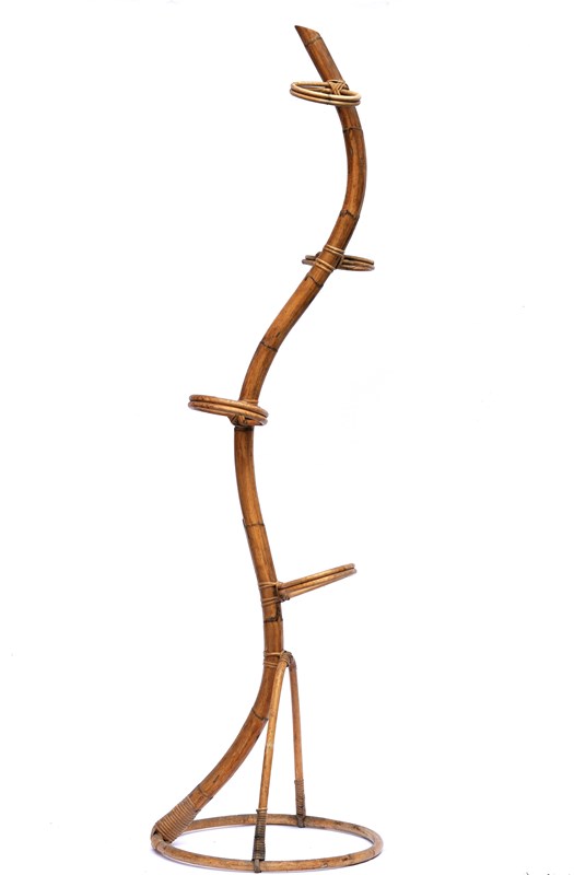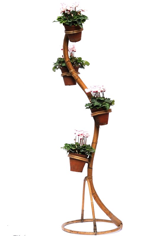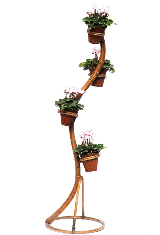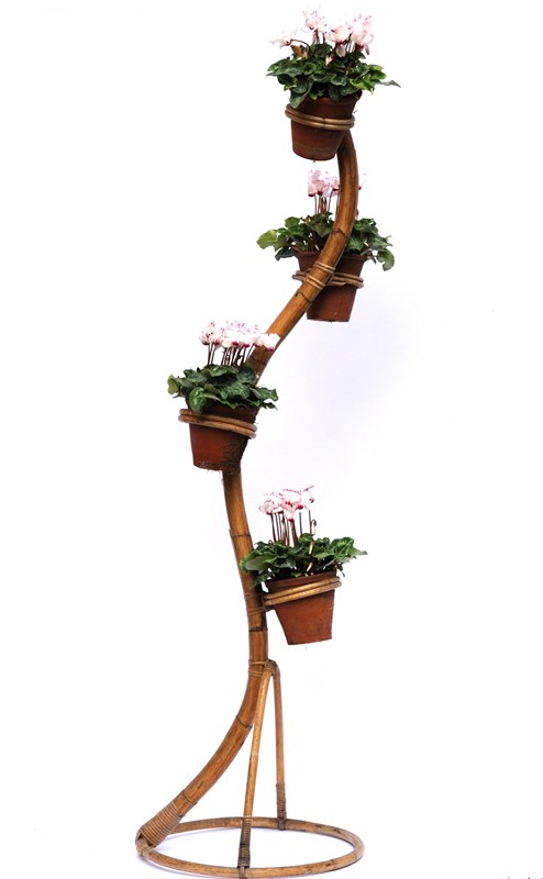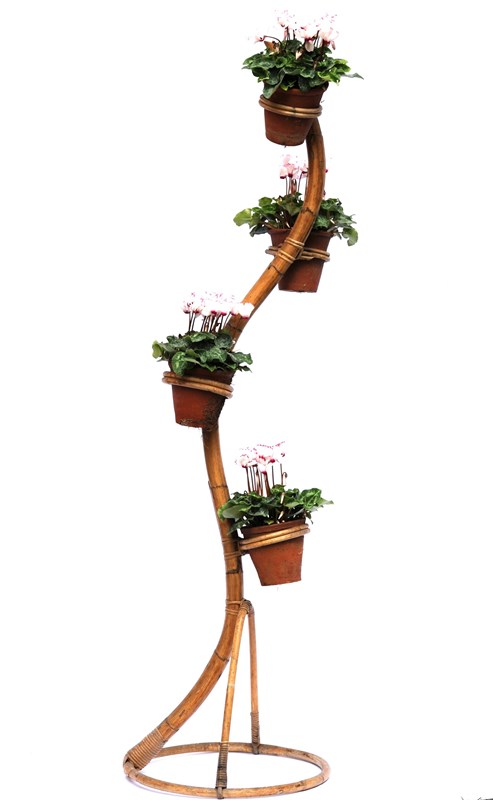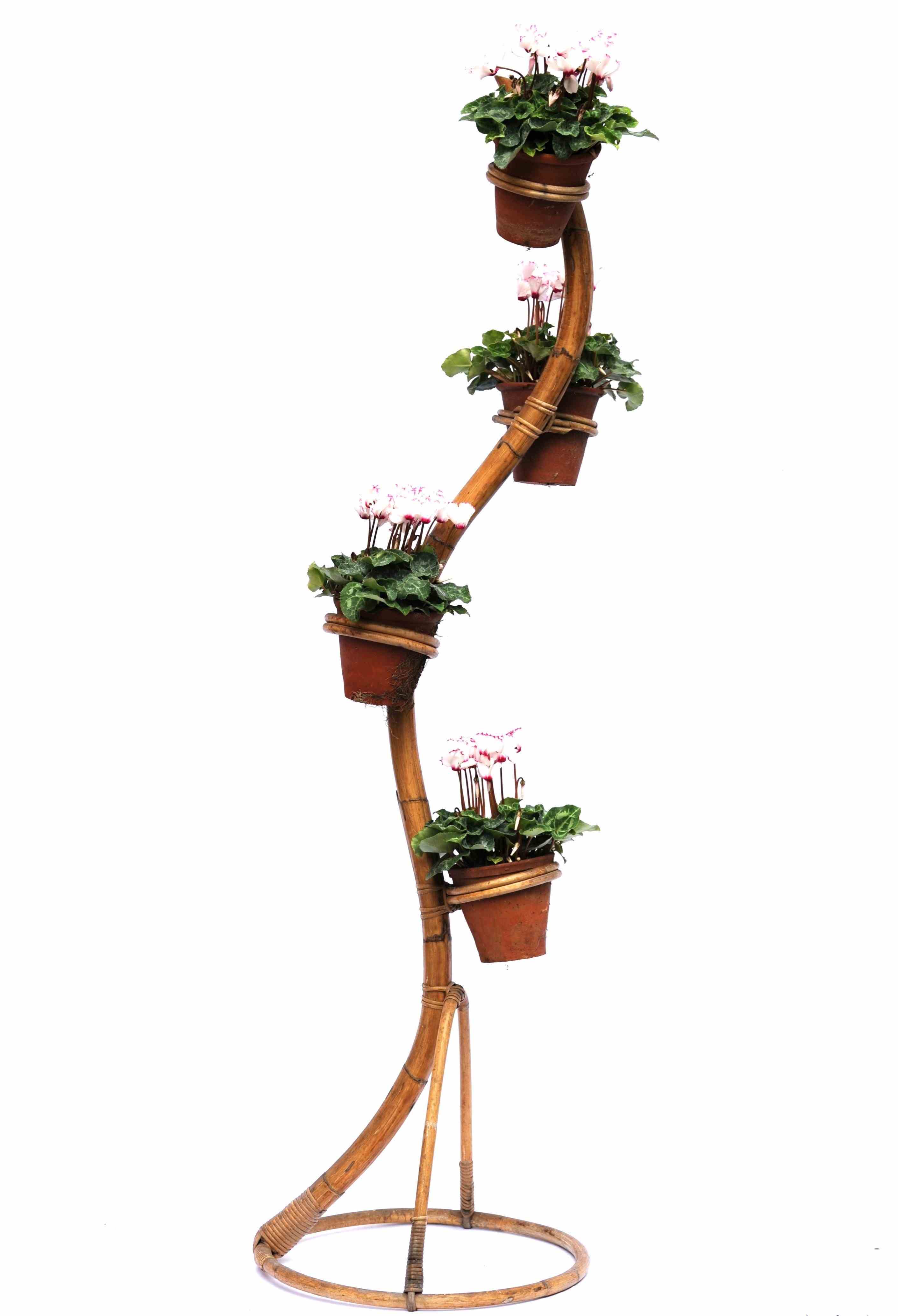 A wonderful 5 foot tall mid 20th-century bound rattan four tier plant stand. Base 17.5 inches in diameter. Pot rings, 6 inches diameter lower two, 5 inches diameter top two. Free spirited vintage look to it. Dates to circa 1960. The listed price includes delivery within the mainland of the United Kingdom. Please do not hesitate to ask any questions or request additional images. Dispatched within one week of purchase.