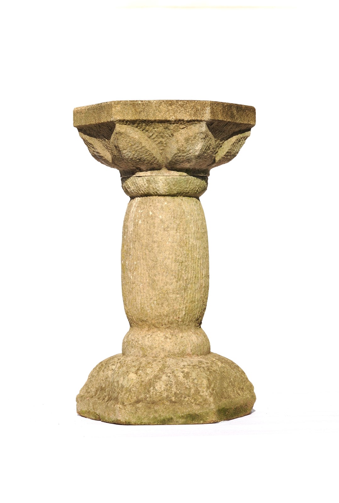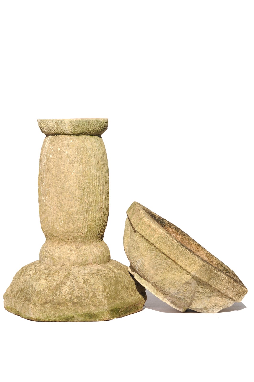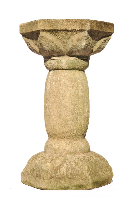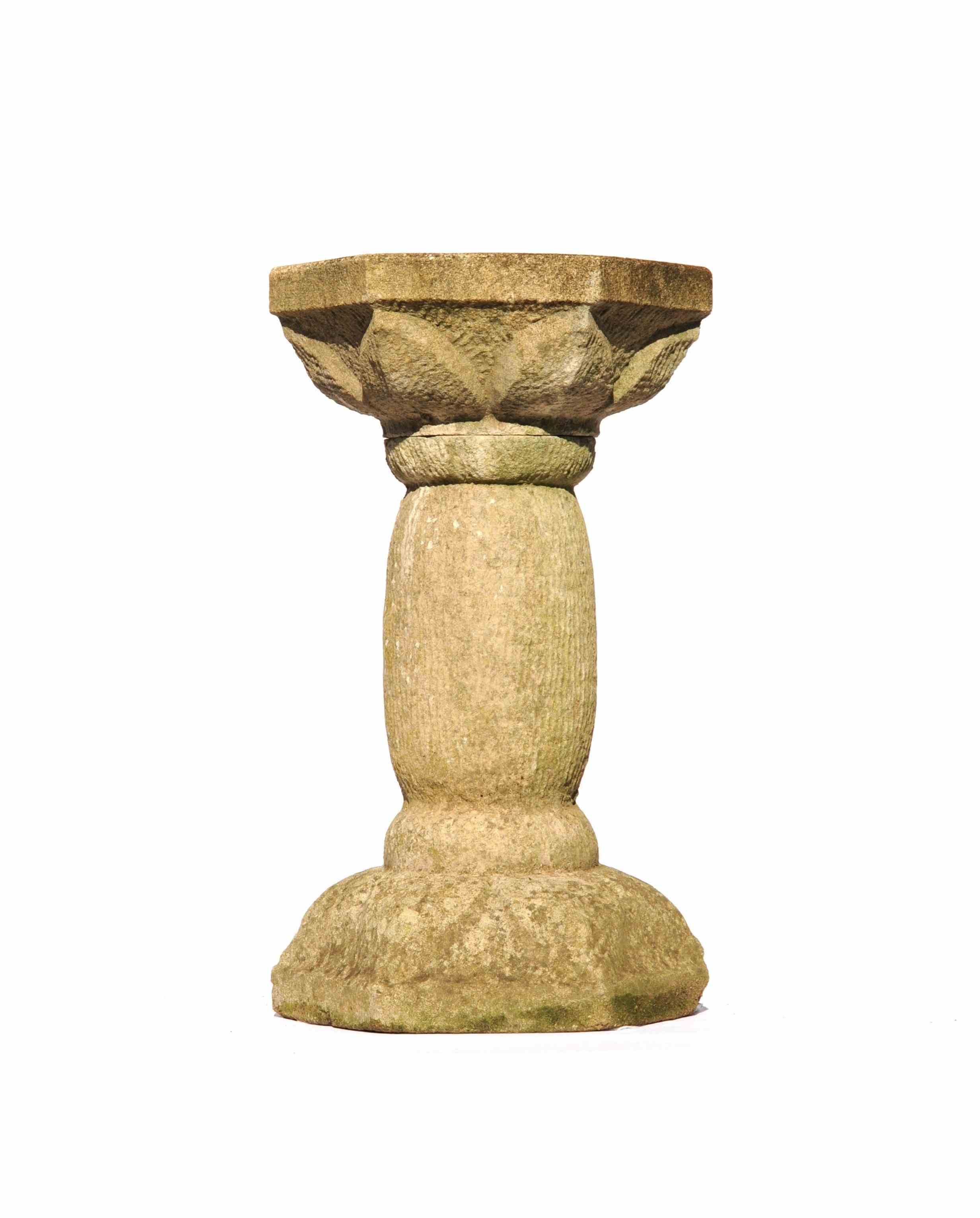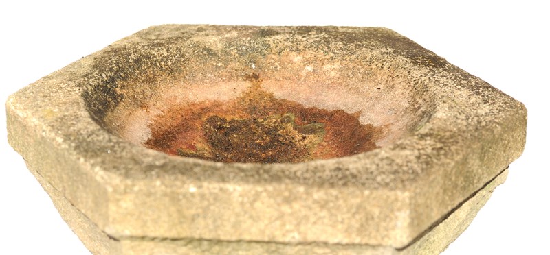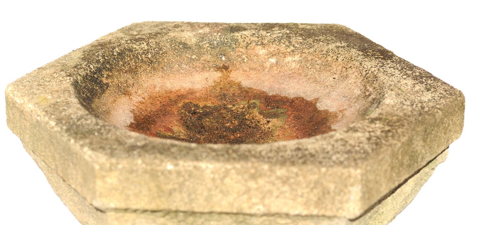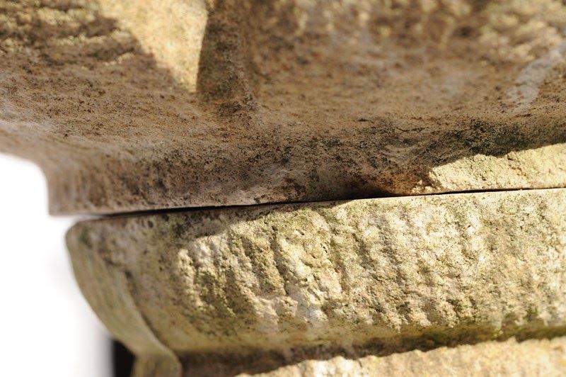 A very pretty dressed cast stone garden bird bath. Stands at 20.5 inches in height with the base & bath measuring 12 inches across, weighs around 30 kg & comes in two sections. It has a lovely garden weathered patina & natural stone colour. Some small marks & knocks as to be expected.