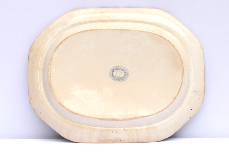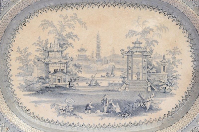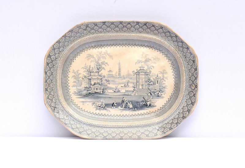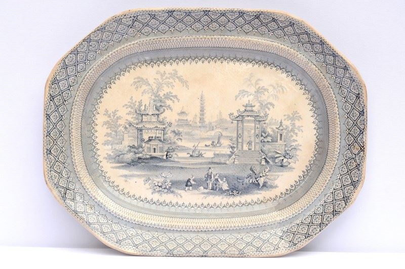 A very pretty early 19th century pale blue & white transfer print serving plate. Size: 14.5" x 11". Good condition for its age, no chips or cracks. Oriental scene. Sale includes delivery within the United Kingdom.