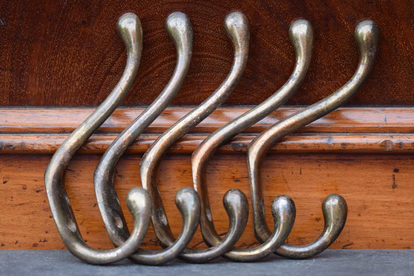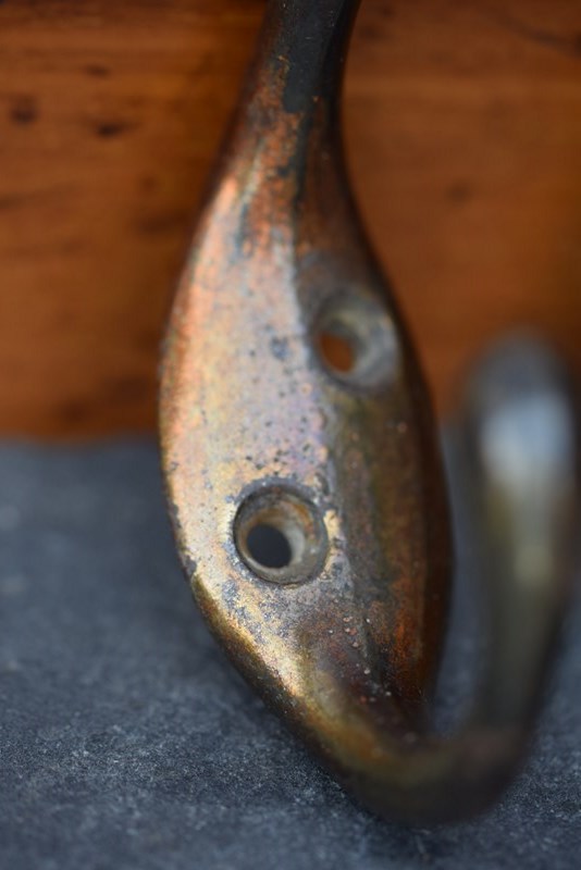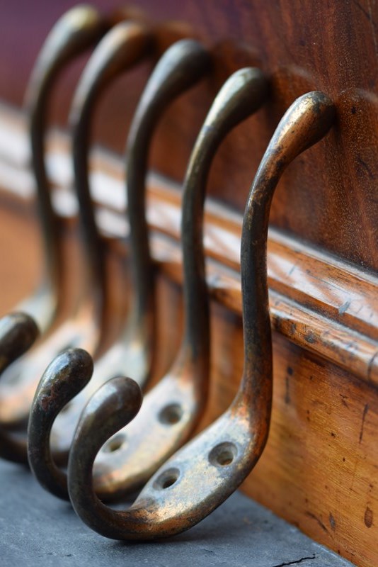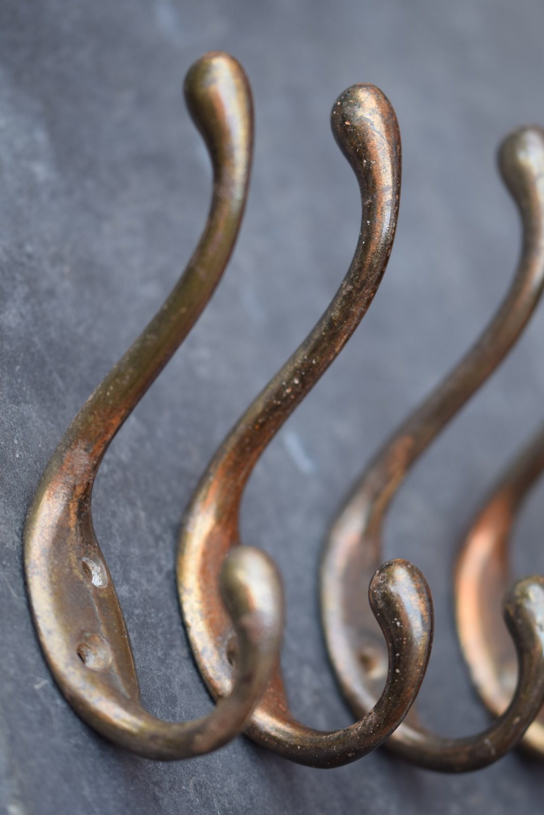 A good set of five reclaimed 1920s period coat hooks. Height 5 inches, fitted projection 3 inches. Cast iron with the time worn remains of the original oxidised brass/copper finish. Lightly cleaned & polished, ready for fitting. No screws supplied. Strong coat hooks. Sale includes UK inland tracked delivery. Returns are happily accepted.