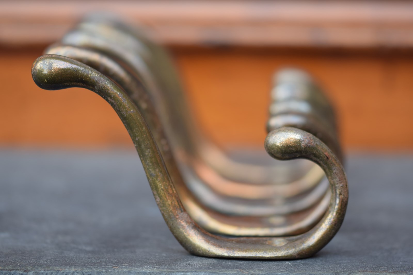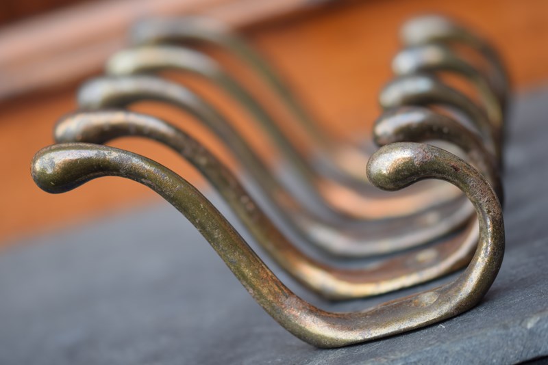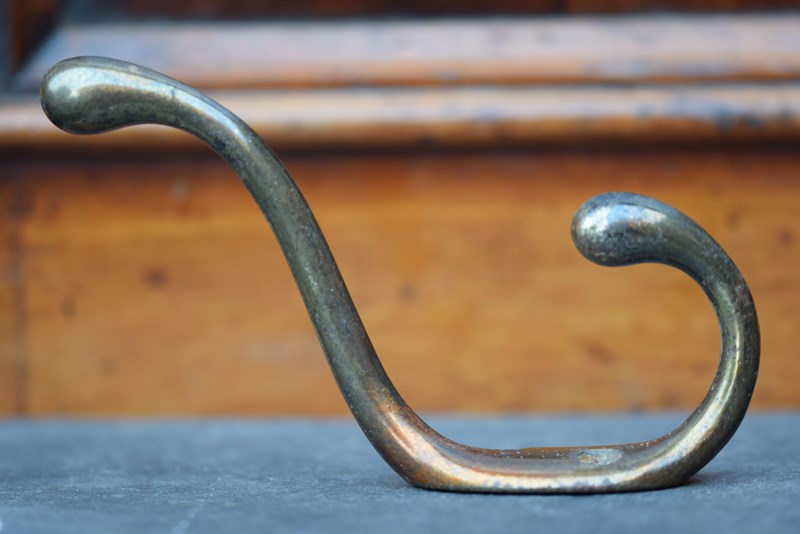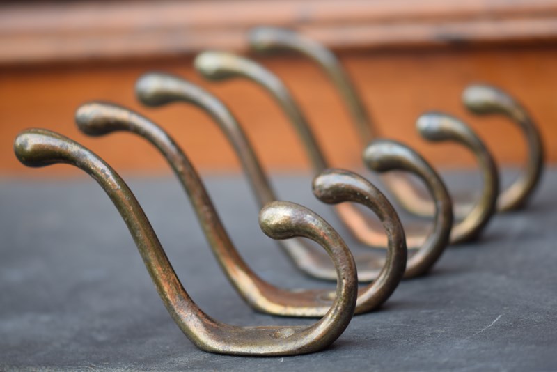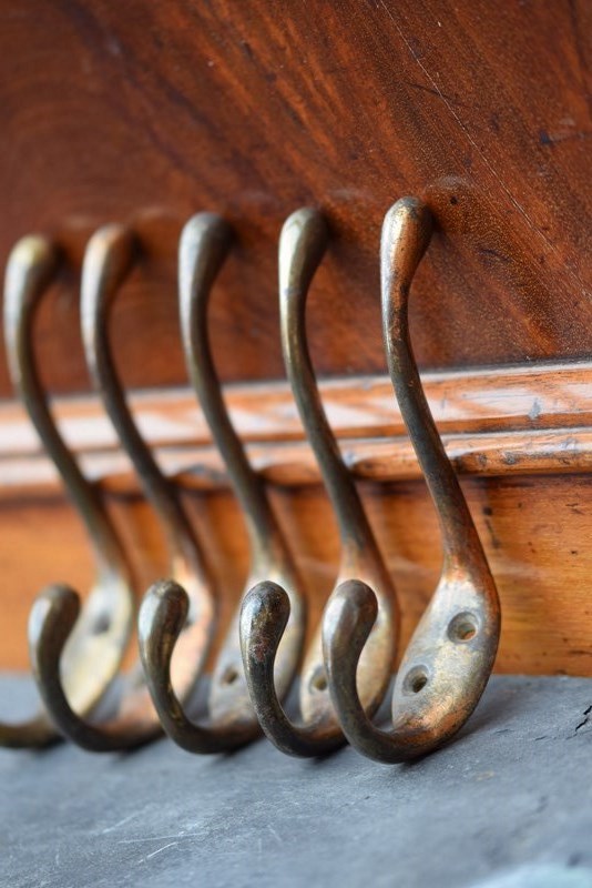 A good set of five reclaimed 1920s period coat hooks. Height 5 inches, fitted projection 3 inches. Cast iron with the time worn remains of the original oxidised brass/copper finish. Lightly cleaned & polished, ready for fitting. No screws supplied. Strong coat hooks. Sale includes UK inland tracked delivery. Returns are happily accepted.