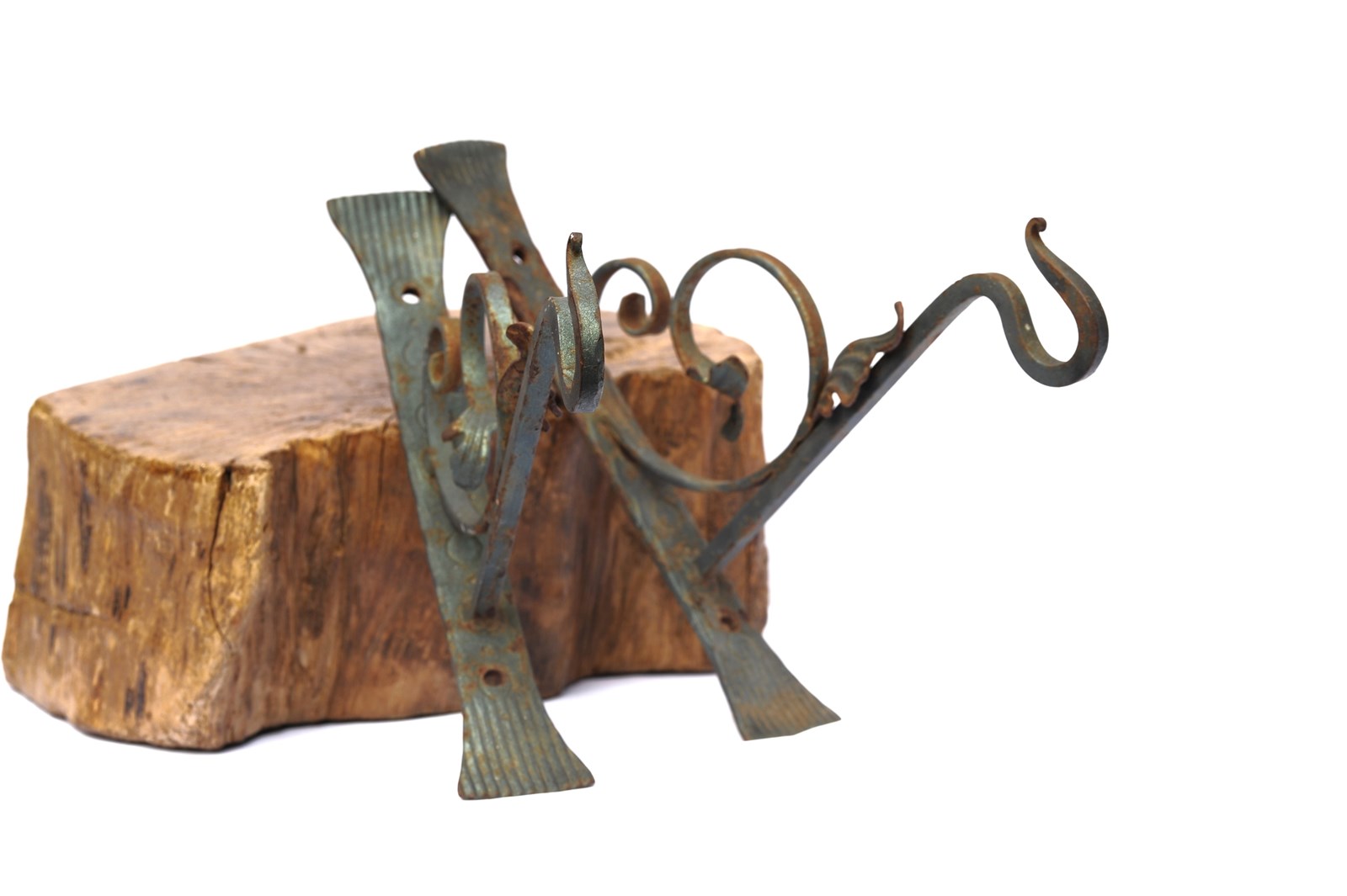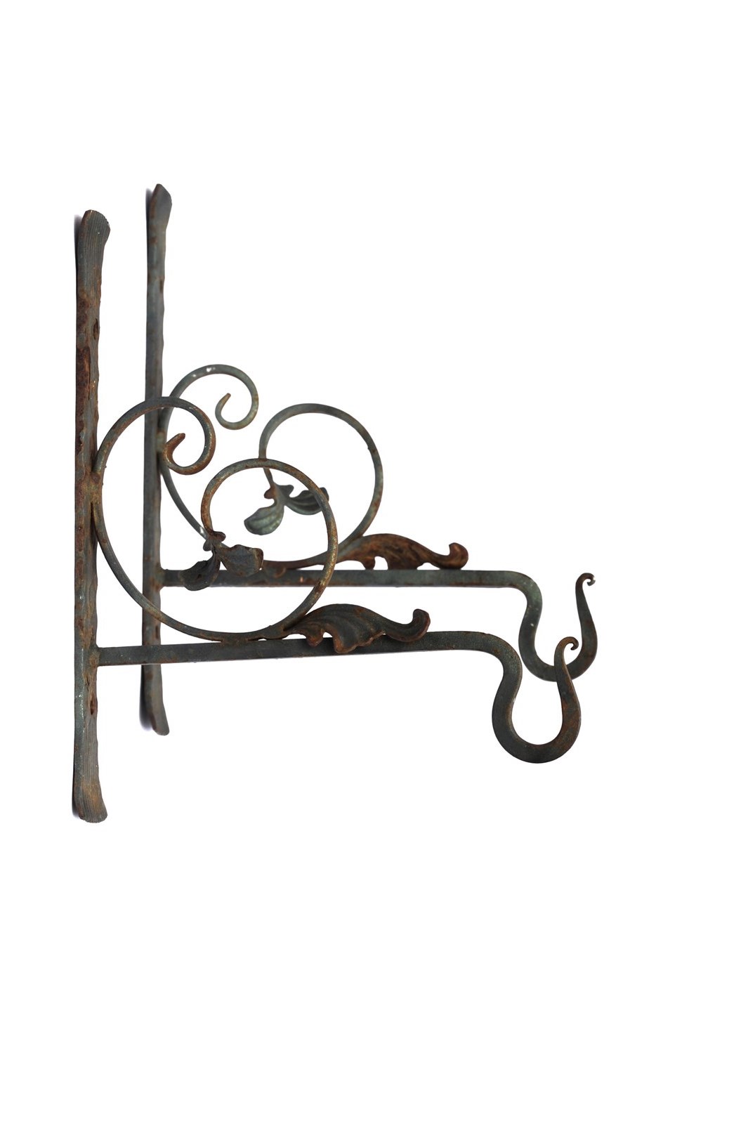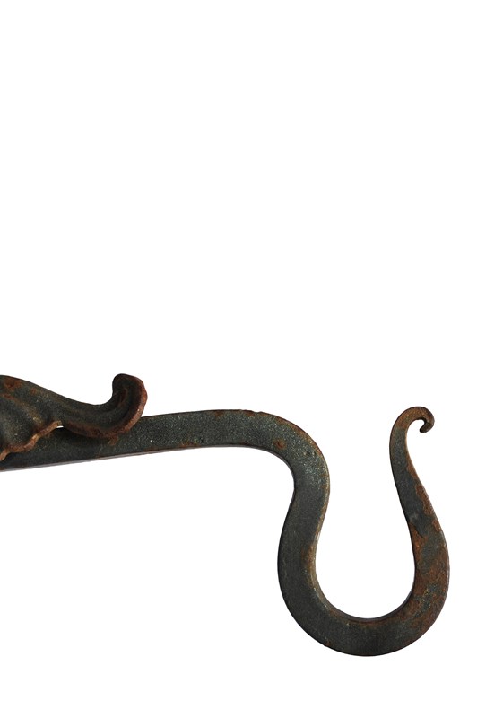 A unique beautiful pair of English Smithy made heavy & strong ornate wrought ironwork garden hanging basket brackets. These will require fixing into position with coach bolts. They are 41 cm in height, with a projection 34 cm. Heavy at approximately 2 kg each bracket. Used garden weathered condition, with a good look to them. Great brackets. Free UK inland tracked delivery.