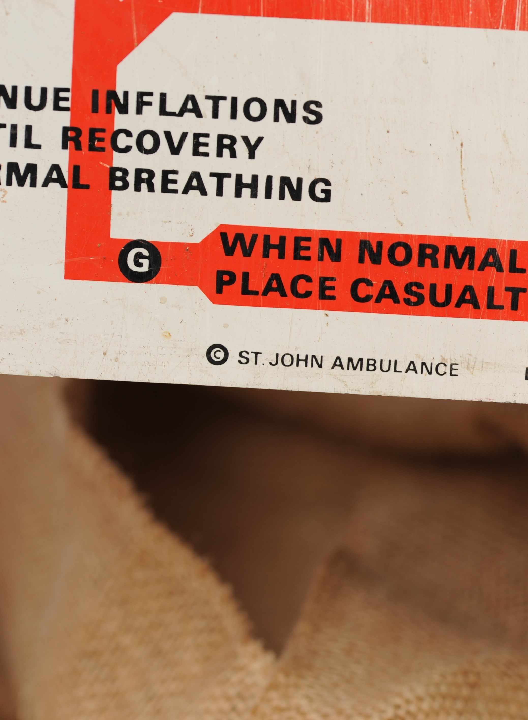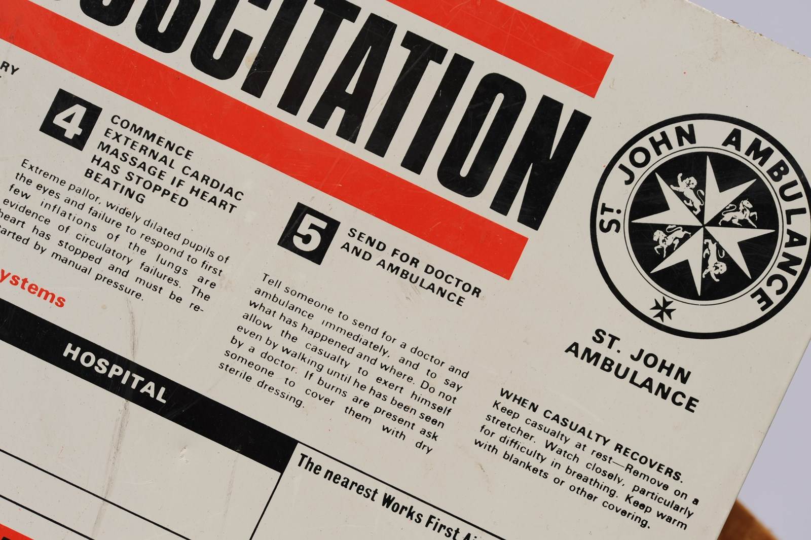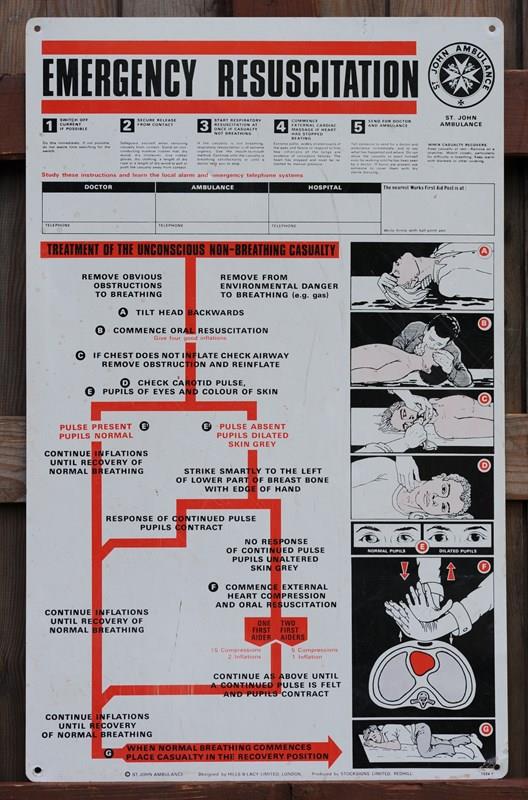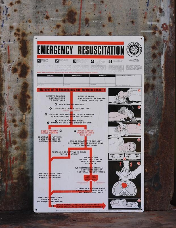 A reclaimed metal Emergency Resuscitation factory wall sign St John Ambulance 24 inches x 15 inches, one side, old factory reclaimed condition. Sale includes UK inland tracked delivery.