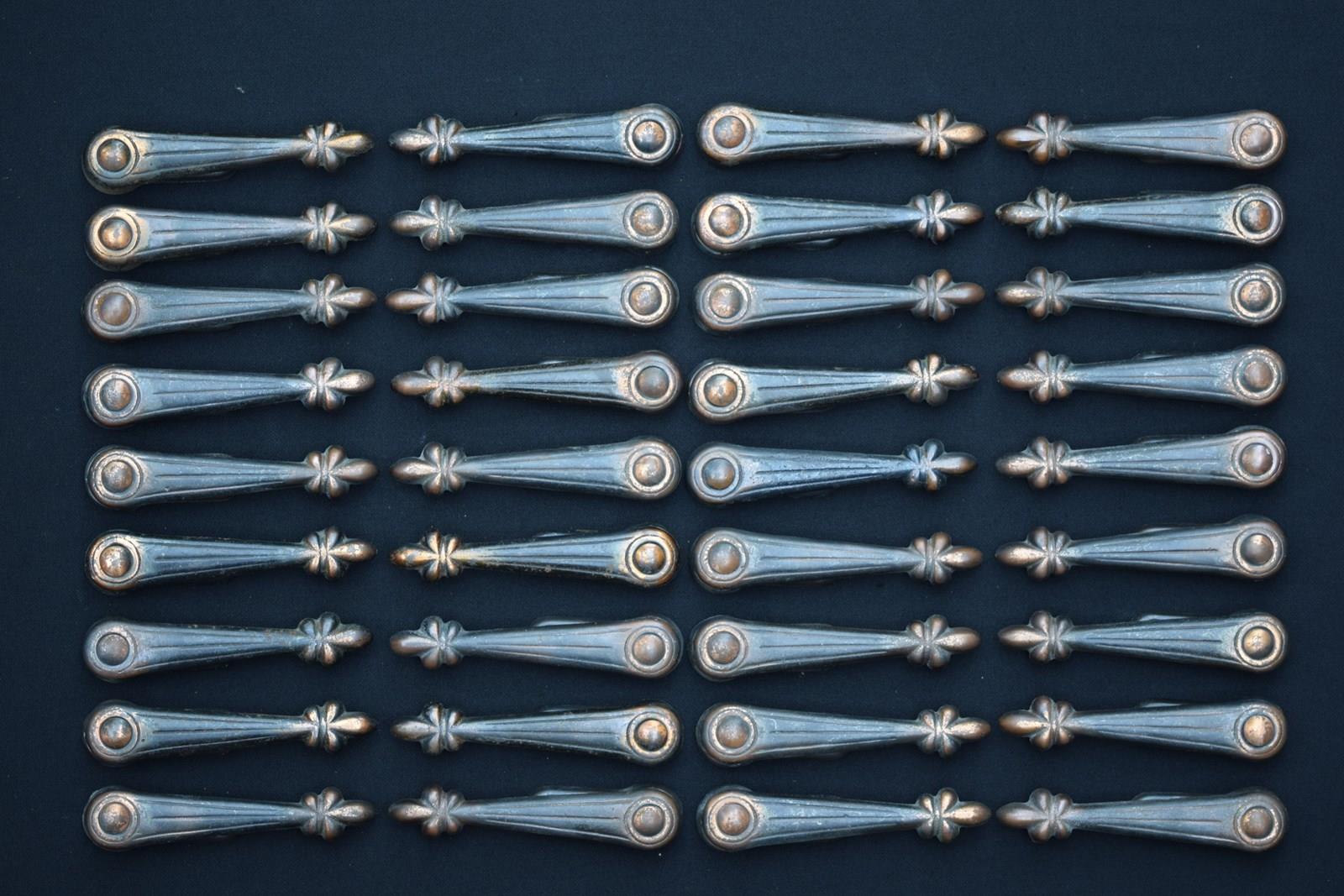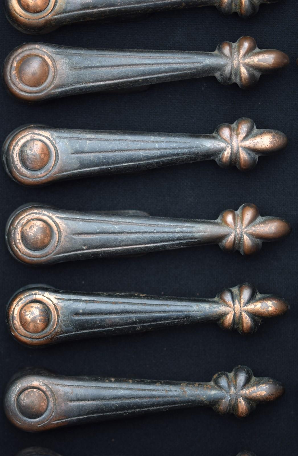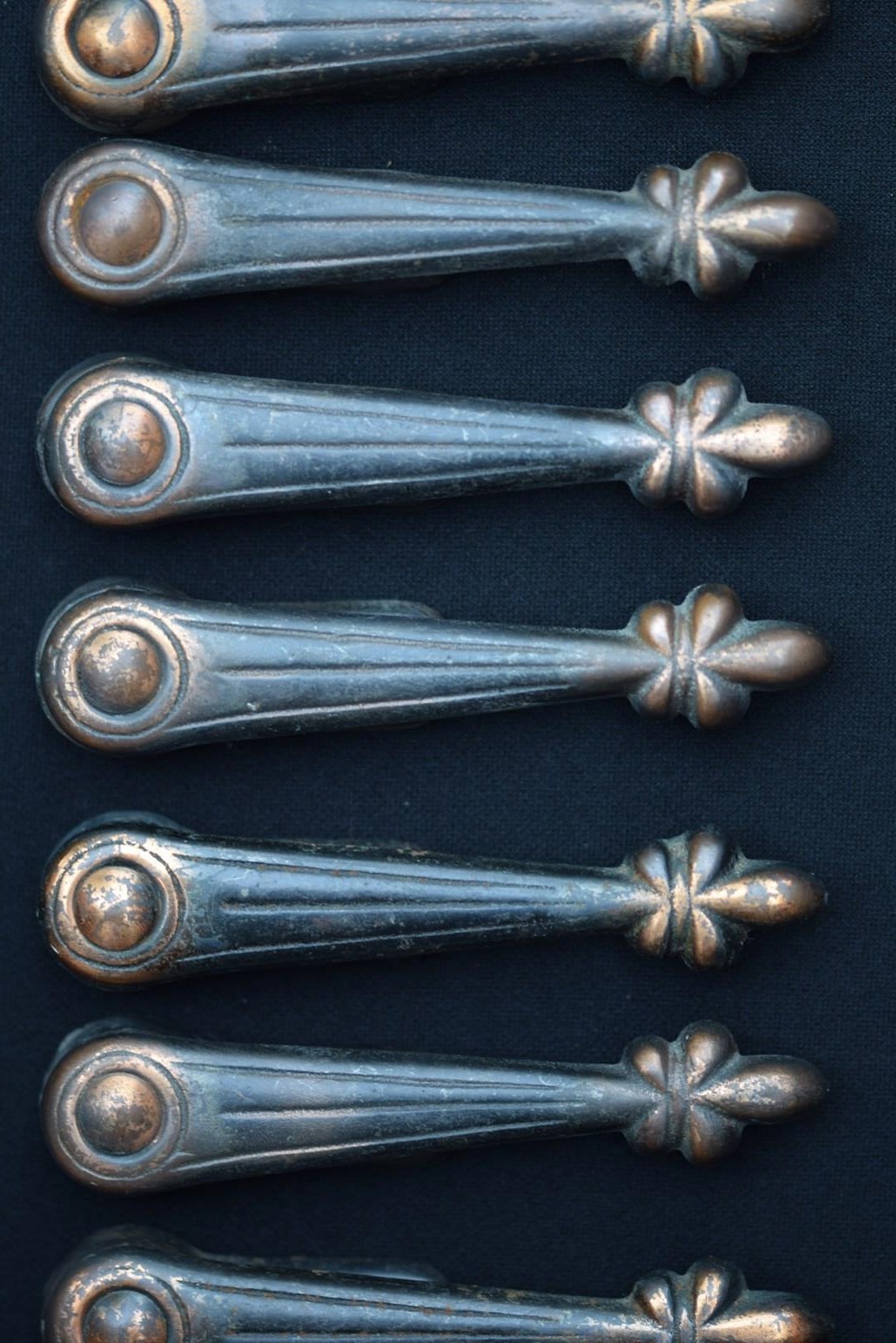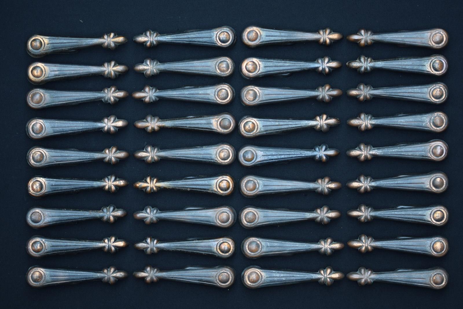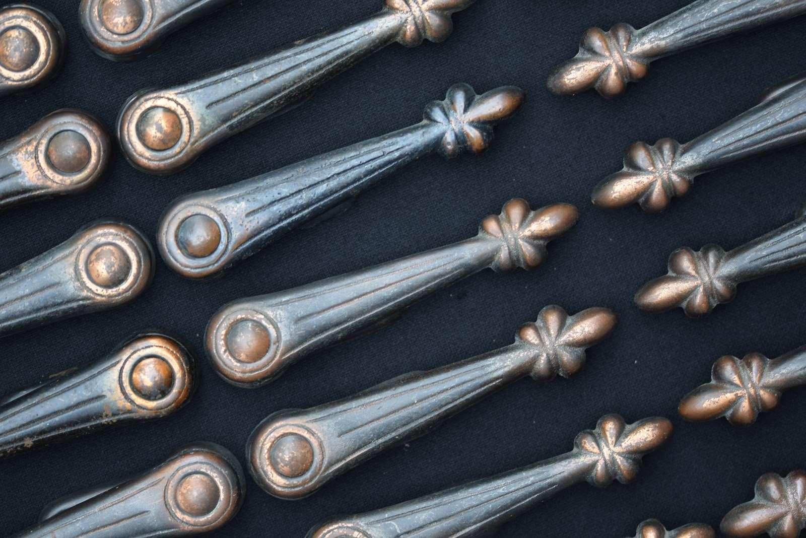 A good full set of 36 Fleur De Lys Design Stair Carpet Clips. Circa 1935. Cast iron with oxidised copper detailing. Approximately 4 inches in length. In good overall ready to fit condition, fixing screws not supplied. UK inland delivery £15. Worldwide delivery is available, please enquire for a quotation.