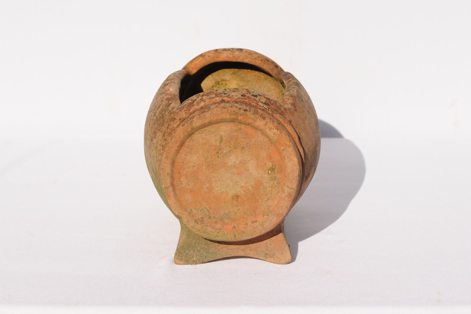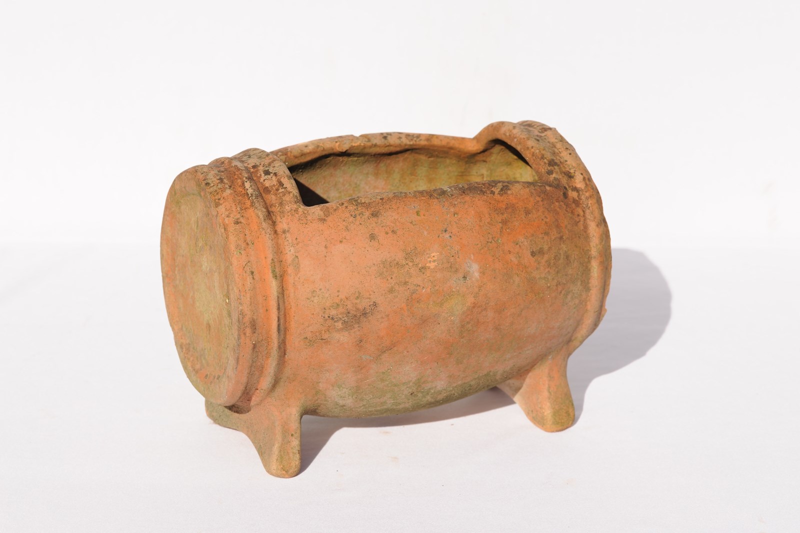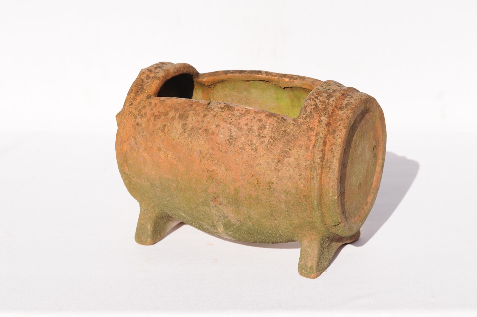 Unusual terracotta barrel planter. Garden weather beaten condition. Approximately 11.5" x 8.5" x 8" & 4.5kg in weight. Sale includes UK delivery.