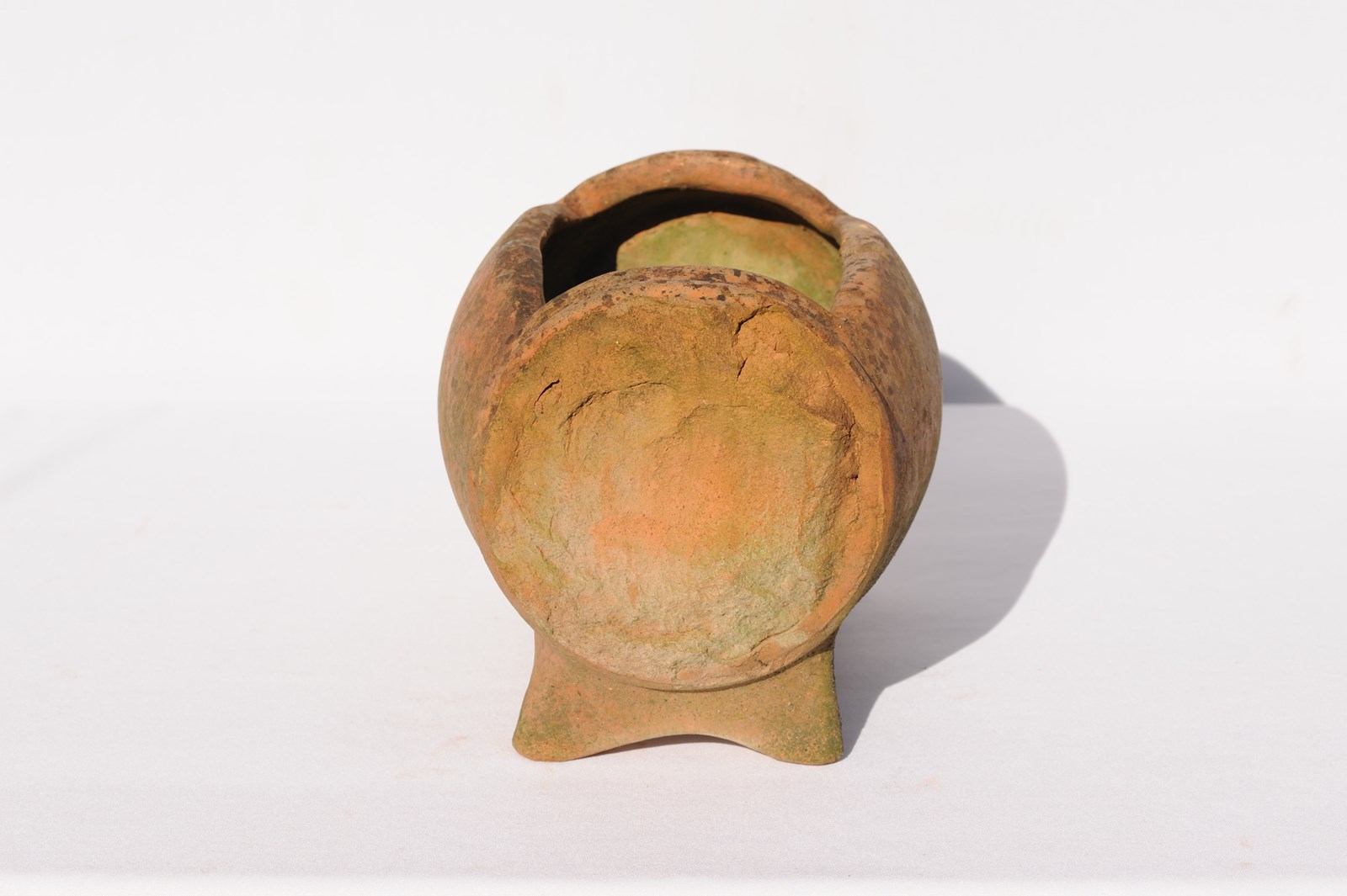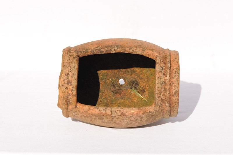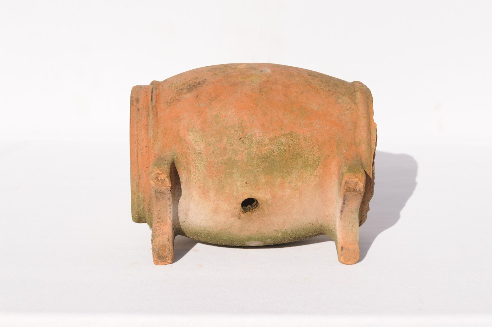 Unusual terracotta barrel planter. Garden weather beaten condition. Approximately 11.5" x 8.5" x 8" & 4.5kg in weight. Sale includes UK delivery.