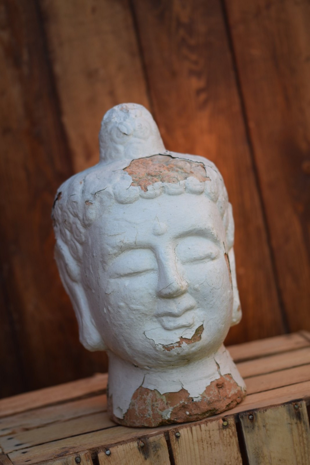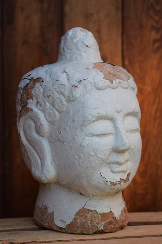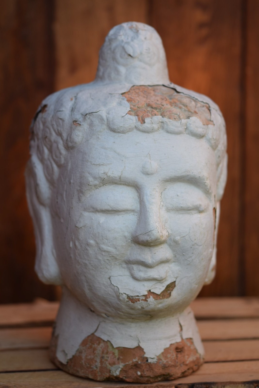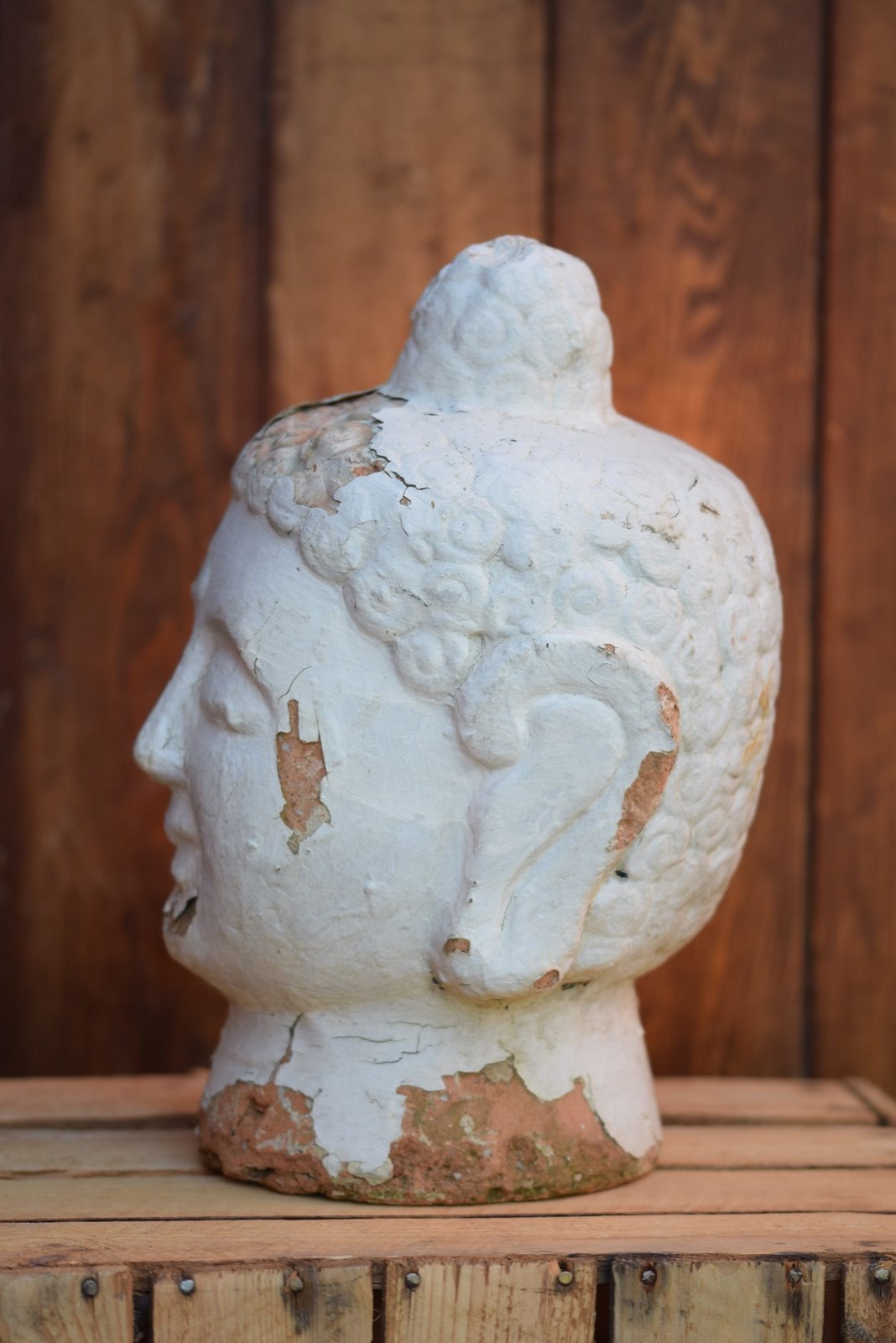 Solid terracotta buddha head. Flaking old paint & terracotta, marks, wear, weathered, knocks, damage etc. Displays well, could be used either in the home or out in the garden. Height approximately 12 inches x around 8 inches in depth & width. Please note that when packing & posting this item it is inevitable some of the loose paint & terracotta will come away. Free UK inland tracked delivery.