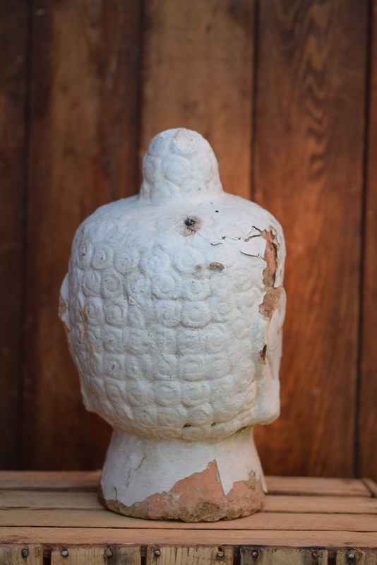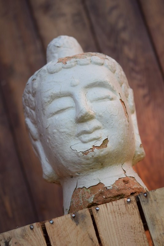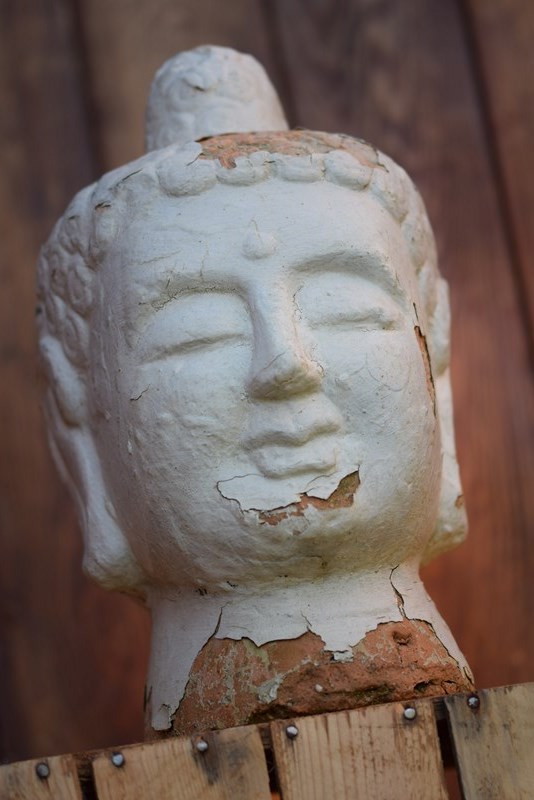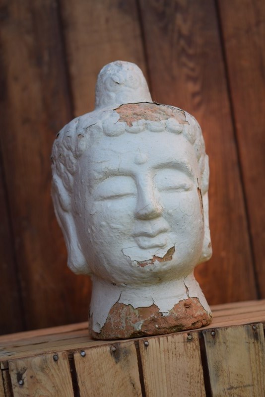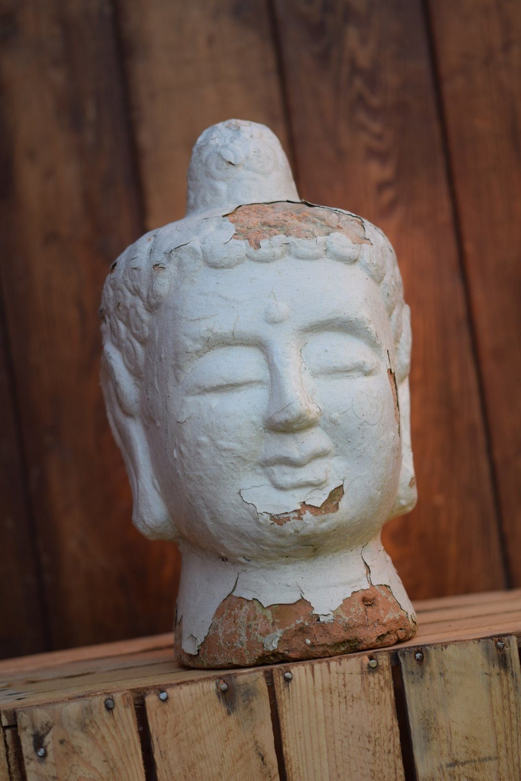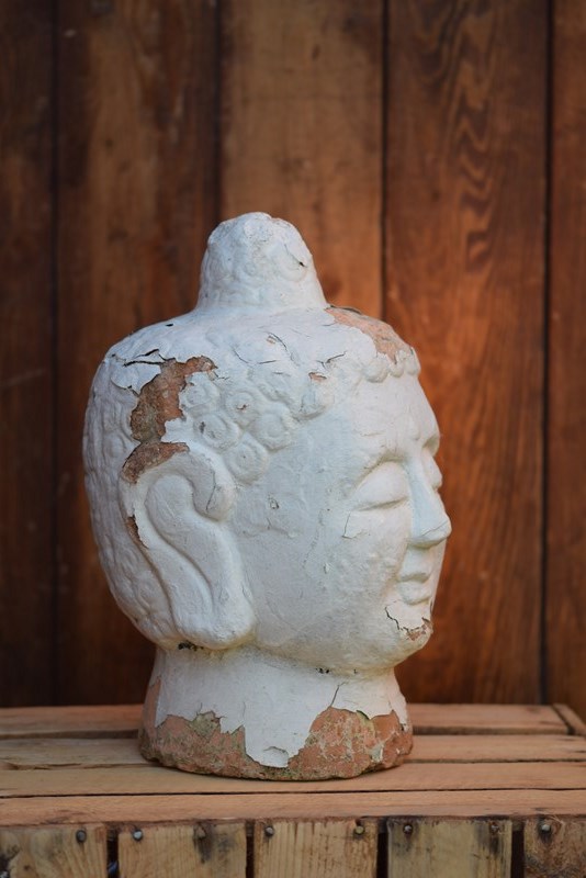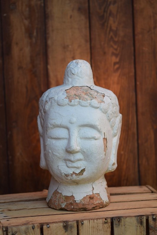 Solid terracotta buddha head. Flaking old paint & terracotta, marks, wear, weathered, knocks, damage etc. Displays well, could be used either in the home or out in the garden. Height approximately 12 inches x around 8 inches in depth & width. Please note that when packing & posting this item it is inevitable some of the loose paint & terracotta will come away. Free UK inland tracked delivery.