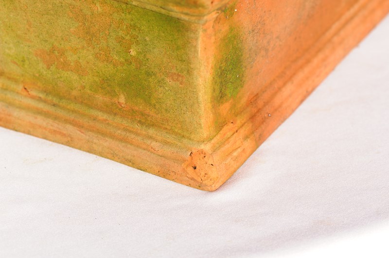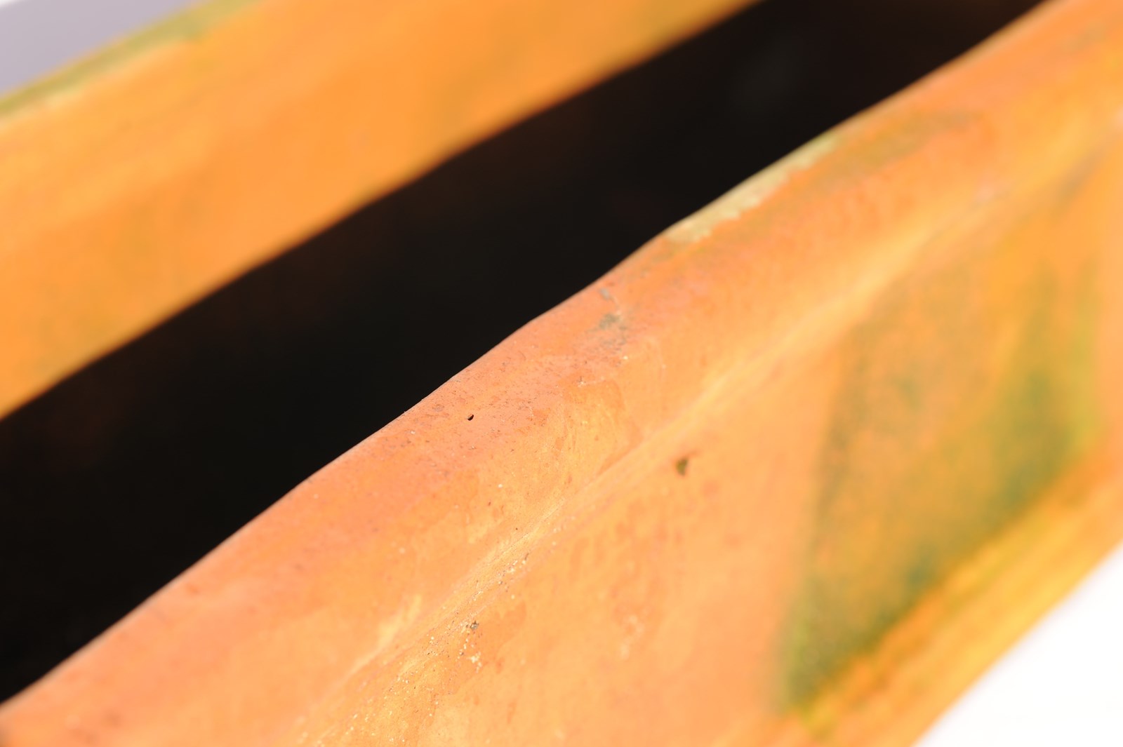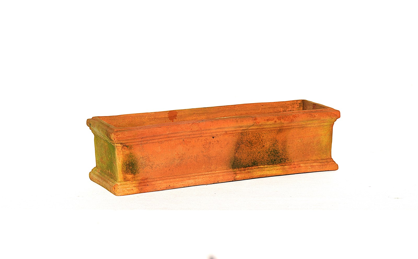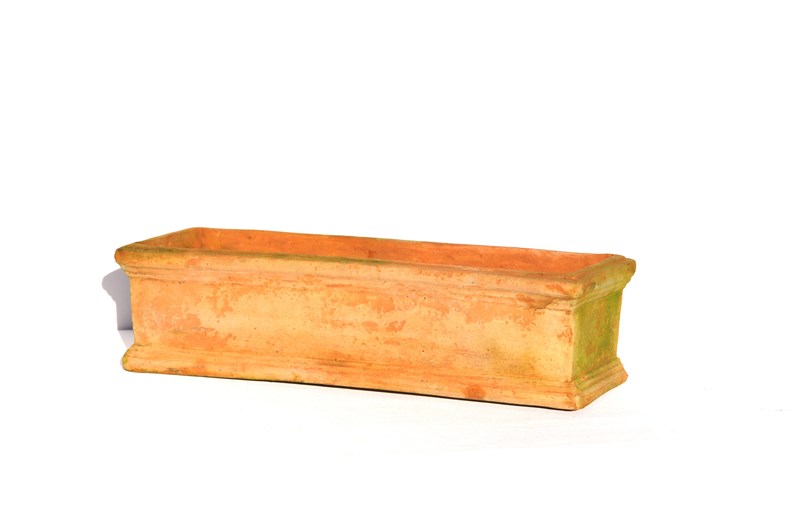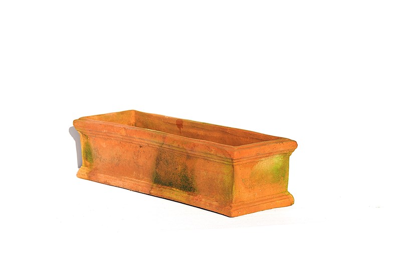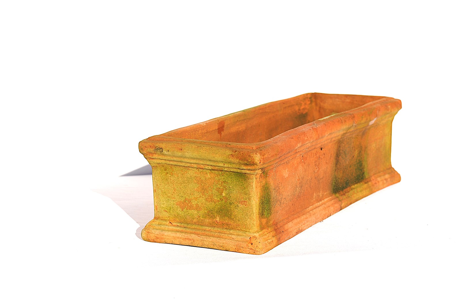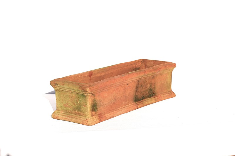 An oblong or windowsill planter in terracotta. Garden weathered. Good overall condition, couple of little edge chips, no cracks or major damage. Length 22.5 inches, depth 7.5 inches, height 6 inches. An attractive planter. Sale includes delivery within the United Kingdom.