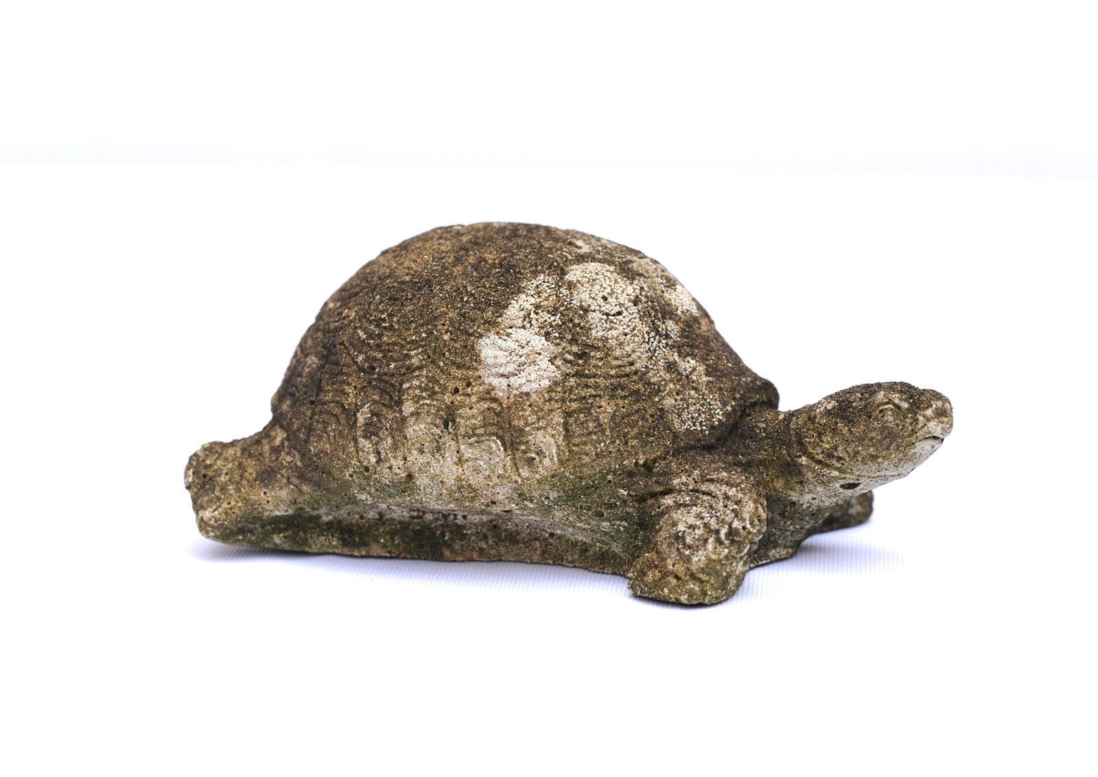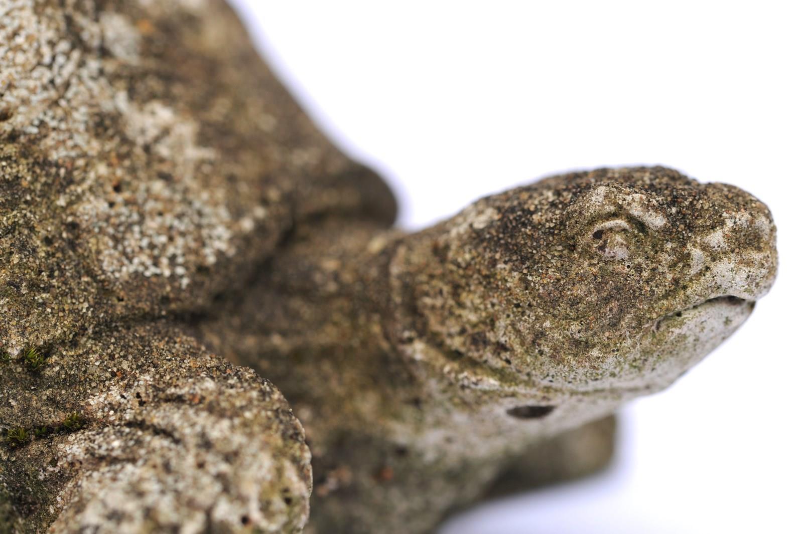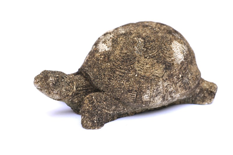 A small mid 20th century cast stone study of a Tortoise. English garden weathered condition with fine detailing. Width 6 inches. Sale includes UK inland tracked delivery