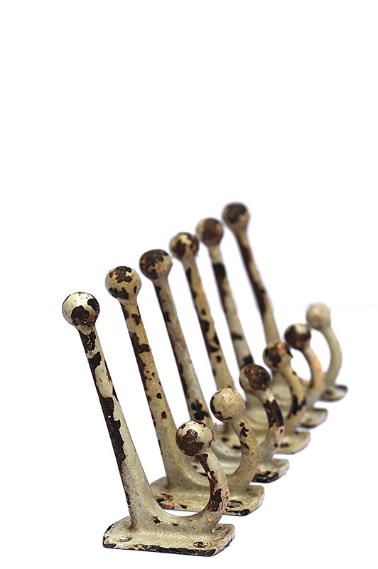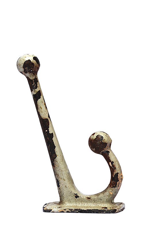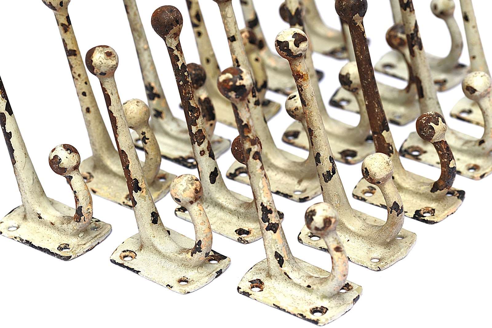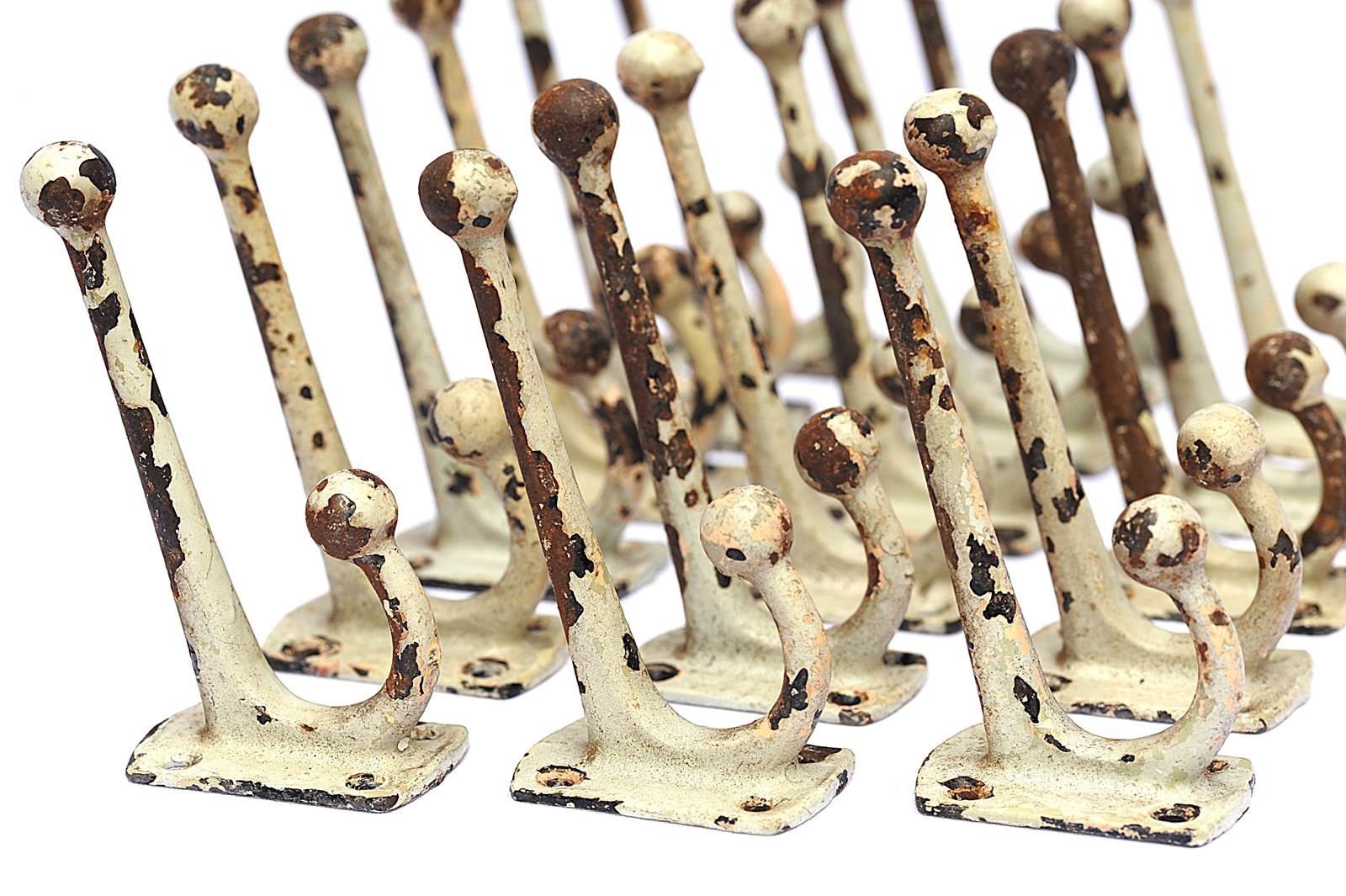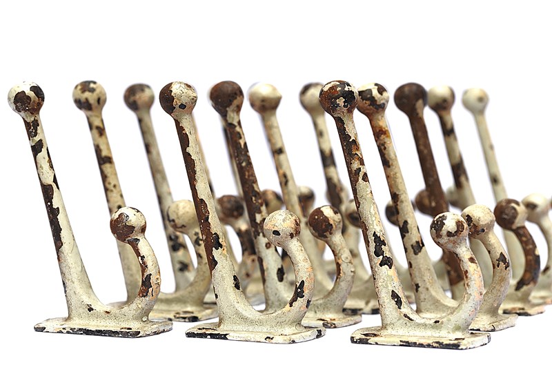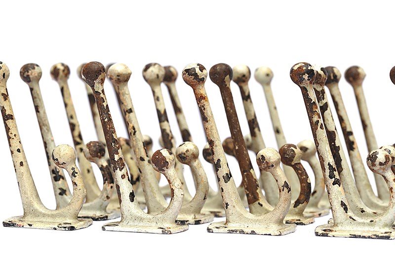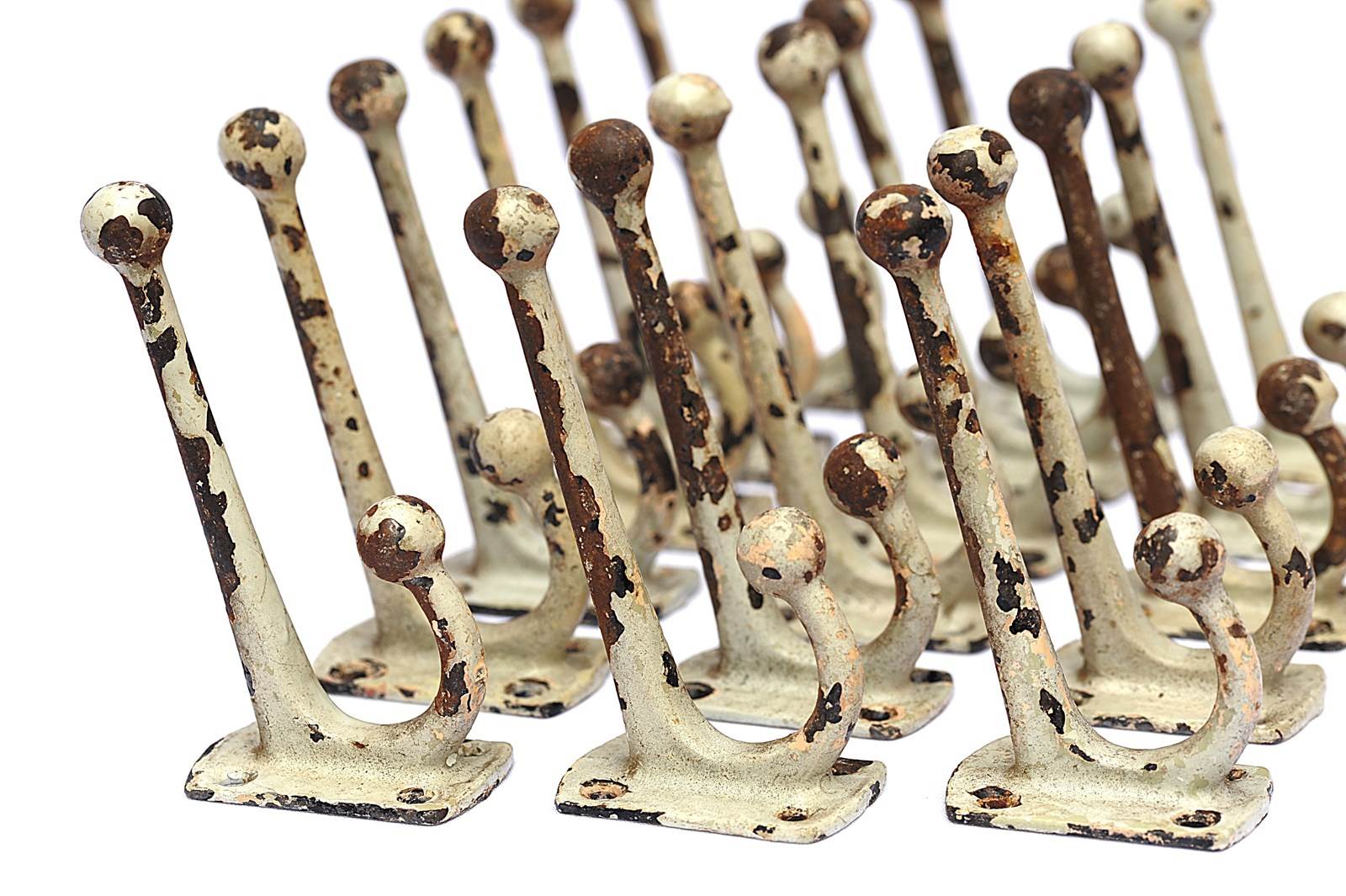 Untouched old reclaimed English circa 1900 cast iron coat hooks in numerous layers of old original time worn paint. Twenty four hooks are currently available, priced individually per hook at £15 each (minimum order 3 hooks), price includes delivery within the United Kingdom.