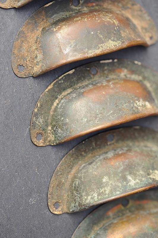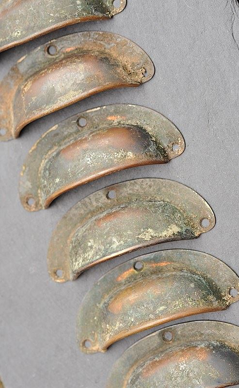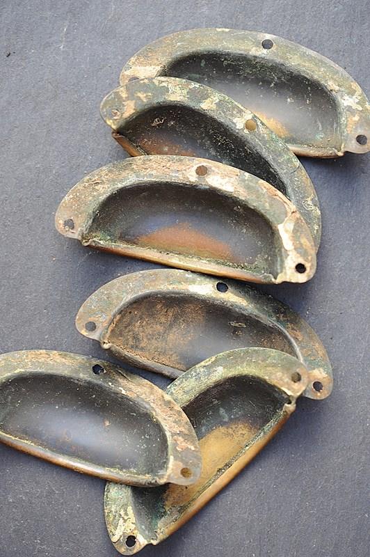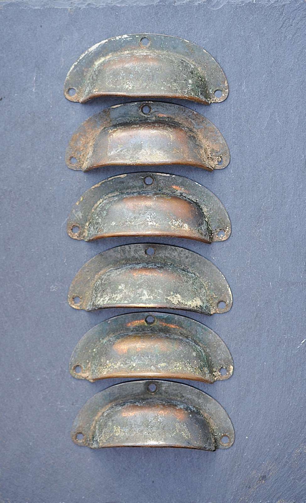 Six Edwardian c1910 Cup Handles. Untouched old condition. Matching set. Base metal is brass & underneath the untouched time aged patina the surface finish is part oxidised copper. Width 97 mm x 40 mm Height. Each handle is re-usable with no major damage. Good look of age to them. Fit them & leave as is or could be polished up. No screws are supplied. Sale is for the set of six handles & includes delivery within the United Kingdom. Returns are happily accepted.