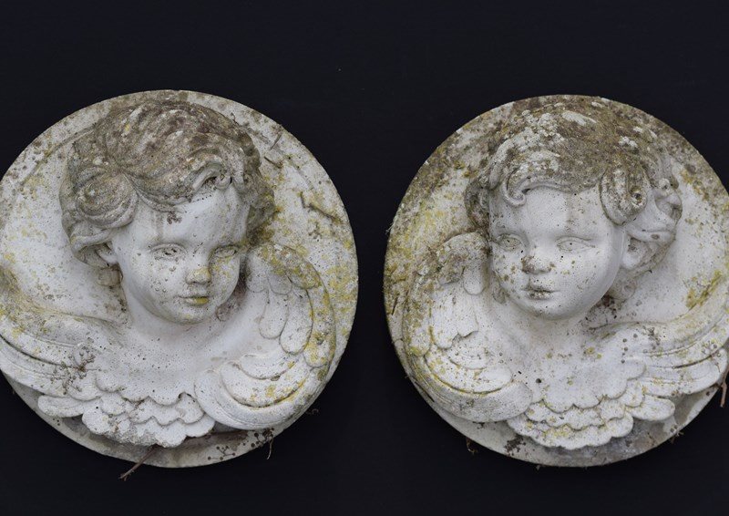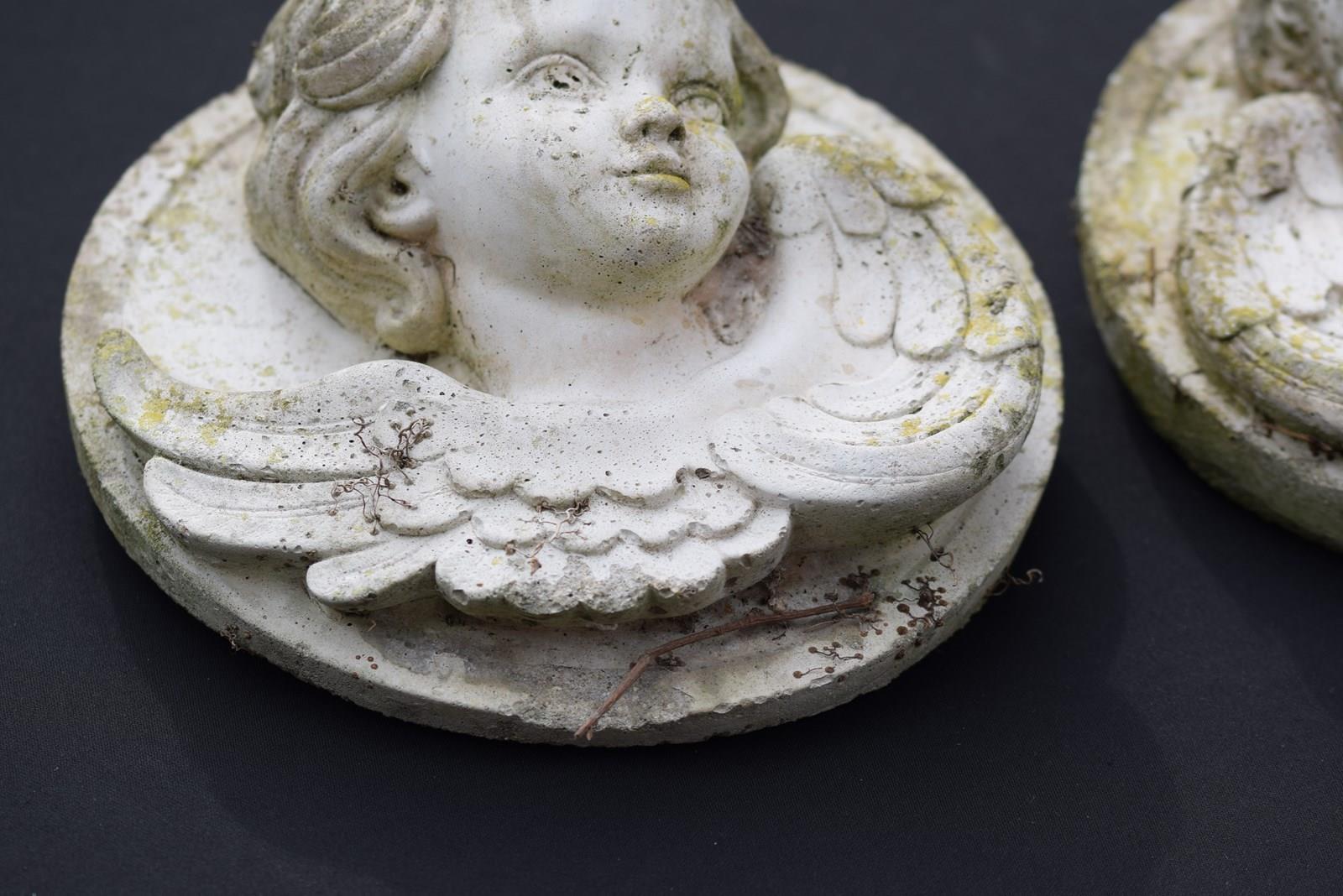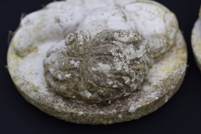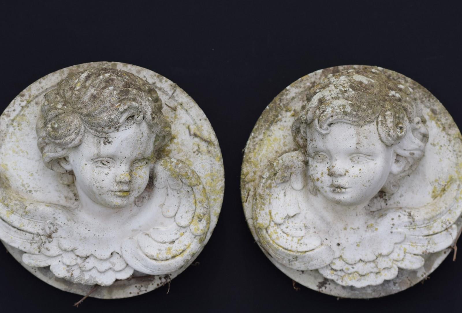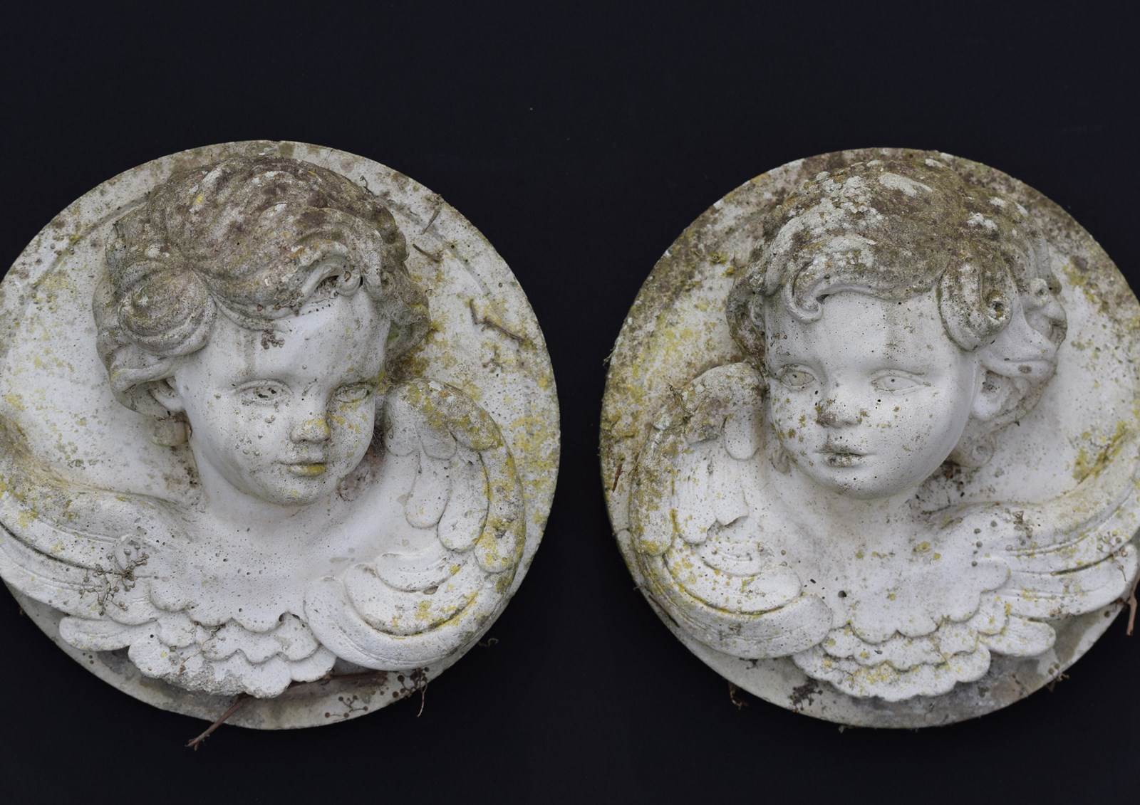A pair of serene English garden weathered cast composite stone Garden Wall Plaques depicting facing Cherubs. Well modeled with good definition. Hanging ties to the back. Each approximately 10 inches in diameter with a projection of 4 inches and 5 kilograms in weight. Sale is for the pair & includes UK inland tracked delivery. Dispatched within 3 to 4 days after purchase.