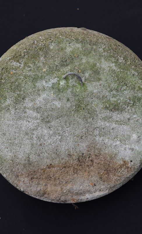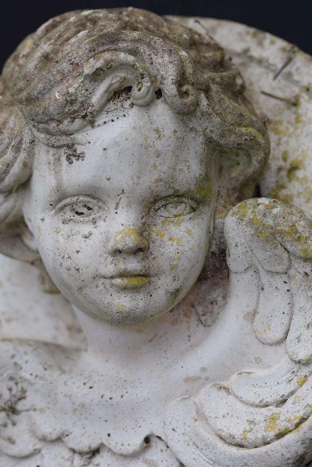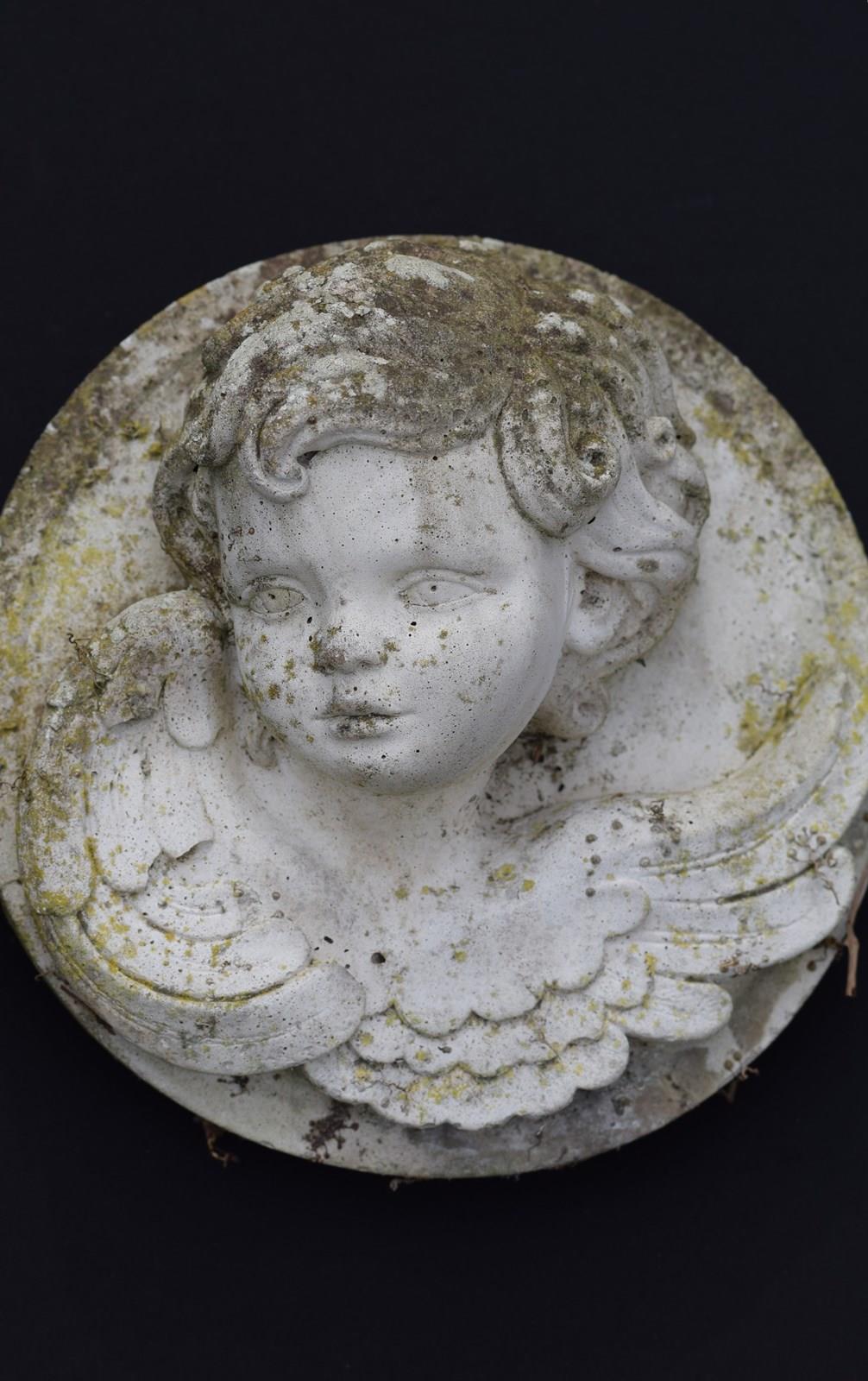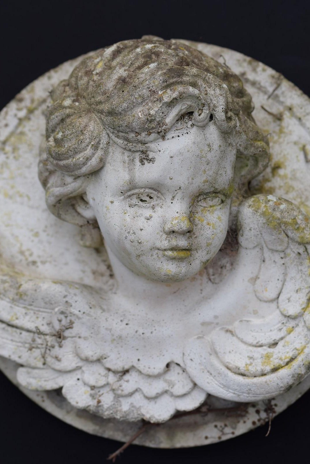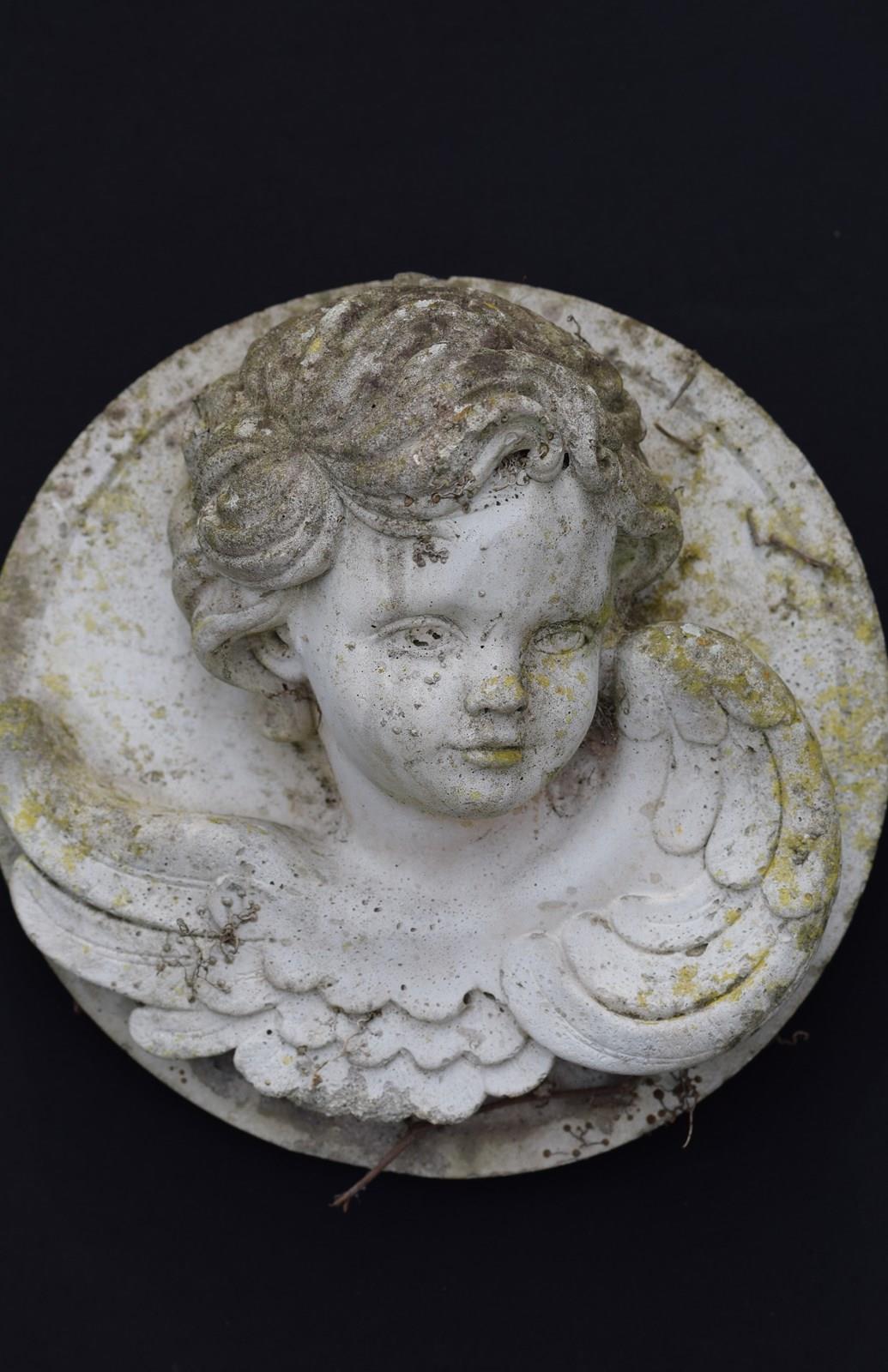 A pair of serene English garden weathered cast composite stone Garden Wall Plaques depicting facing Cherubs. Well modeled with good definition. Hanging ties to the back. Each approximately 10 inches in diameter with a projection of 4 inches and 5 kilograms in weight. Sale is for the pair & includes UK inland tracked delivery. Dispatched within 3 to 4 days after purchase.