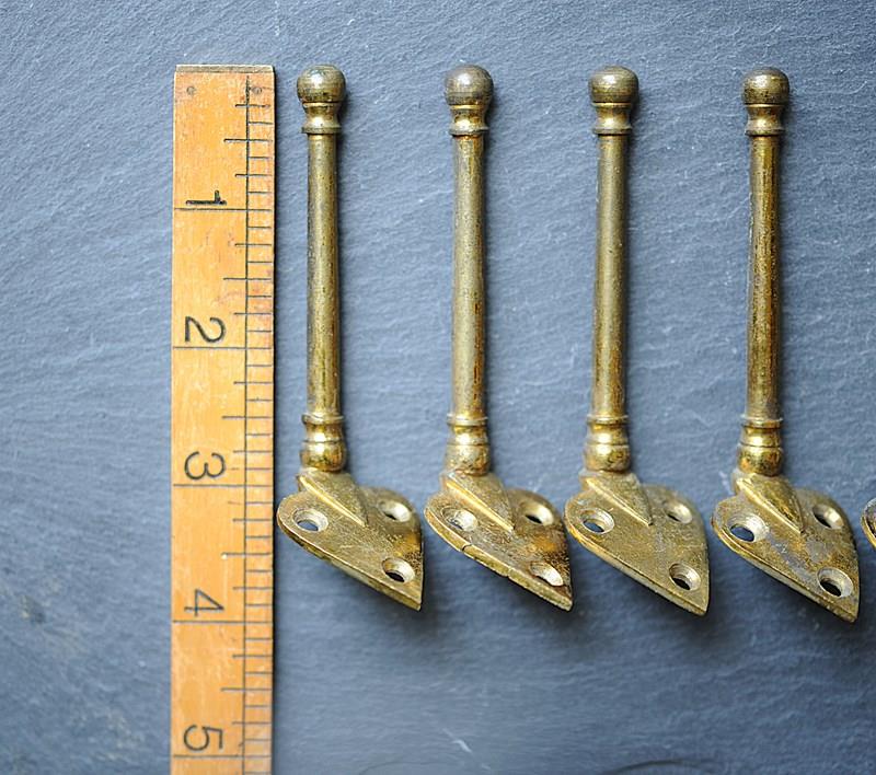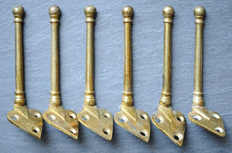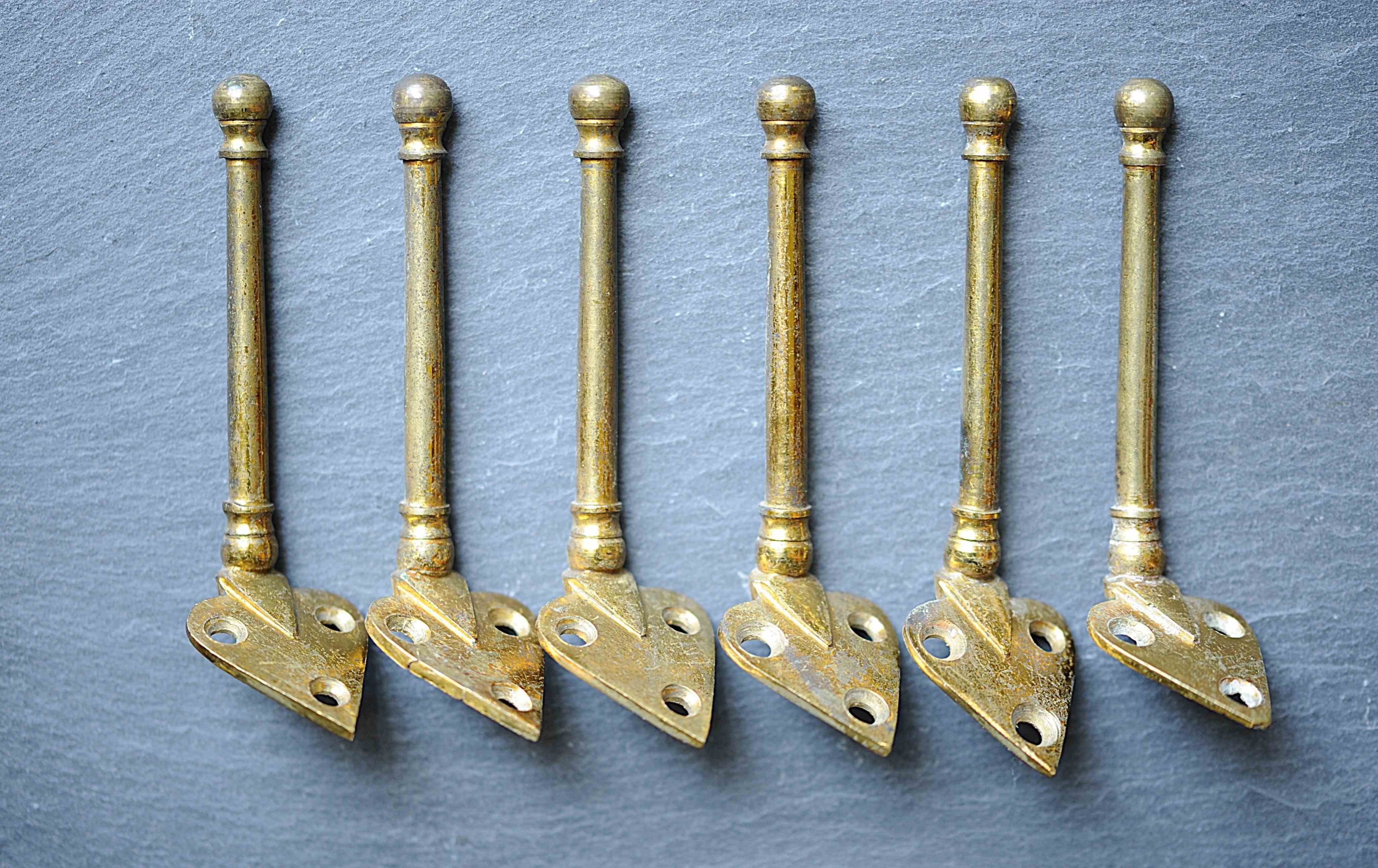 A set of six small size English Arts & Crafts period C.F.A Voysey style brass hooks. Length approximately 3 inches. Weight 35 grams per hook. Date to the latter years of the 19th century. These were originally taken out of a small Arts & Crafts period wardrobe which was sadly too badly damaged to save. A rare size & seldom seen hook. Sale is for the set of six & includes delivery within the United Kingdom. Condition: old untouched, original, marks, knocks & use wear. No screws supplied. Worldwide delivery is available please enquire for a delivery quotation.