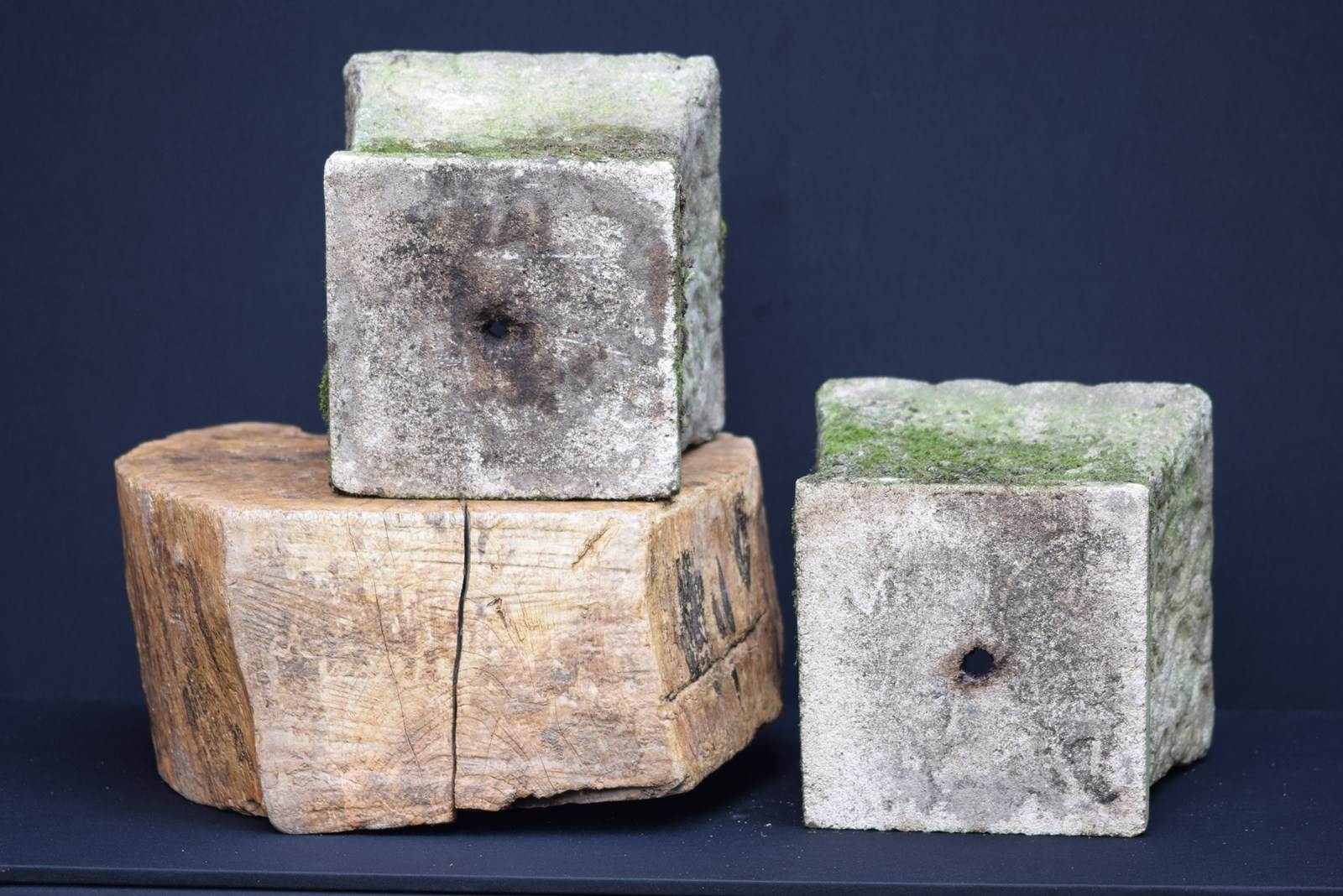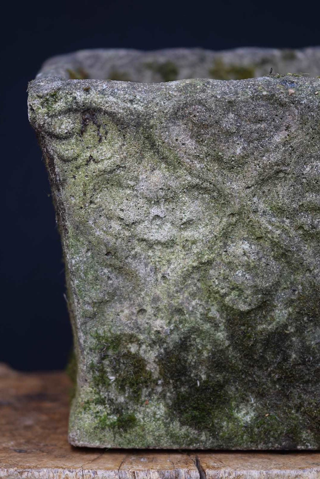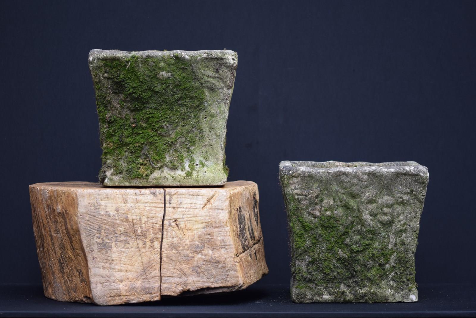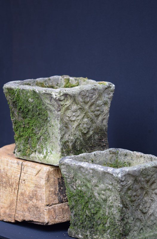A pair of beautifully weathered cast stone planters with moss on. Approximately 9.5" in height, the tops are 10" x 10", the bases 8.5" x 8.5" and 11 kg in weight per planter. Under the weathering & moss there is a Tudor Rose type design pattern. Delivery is available, please enquire for a quotation.