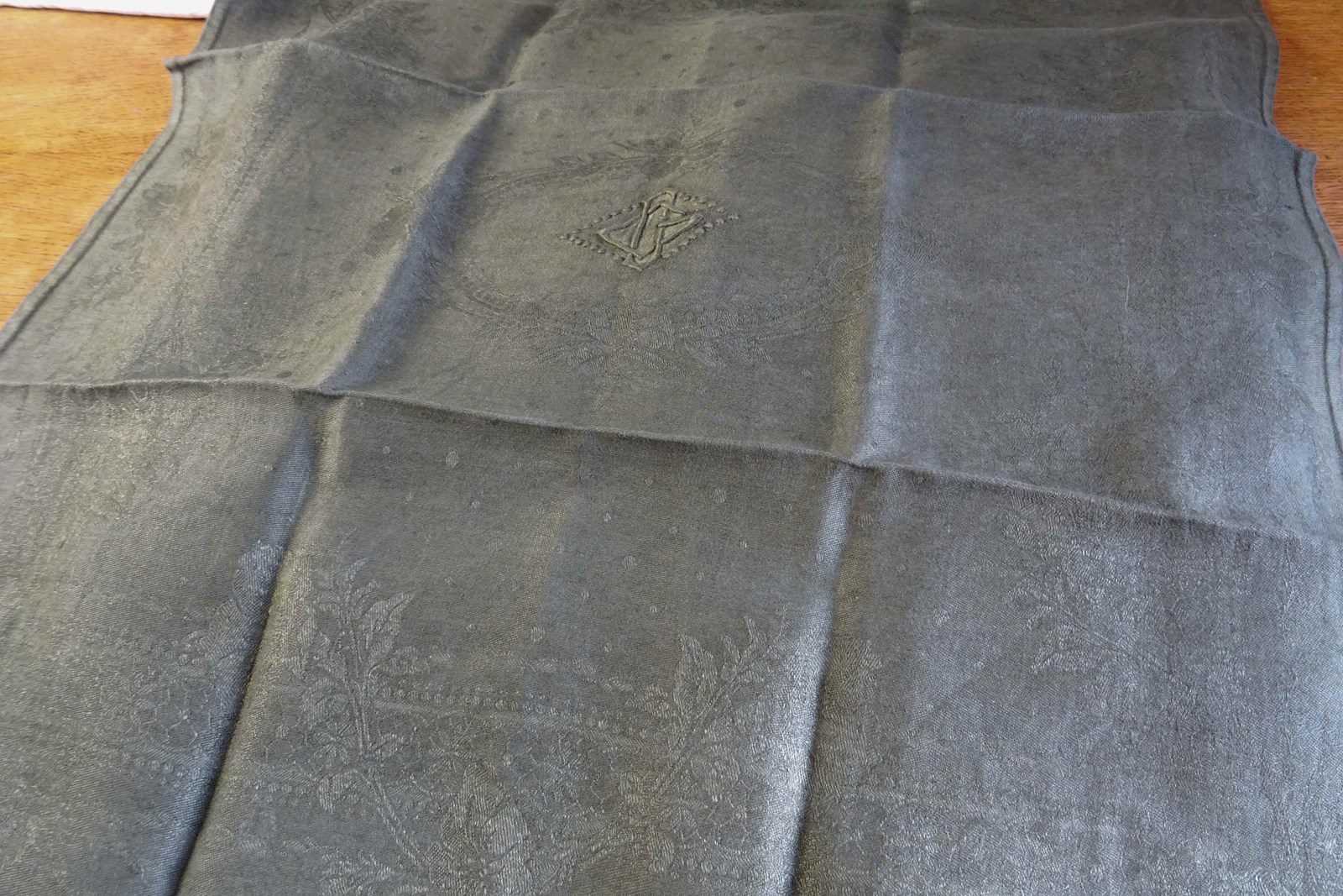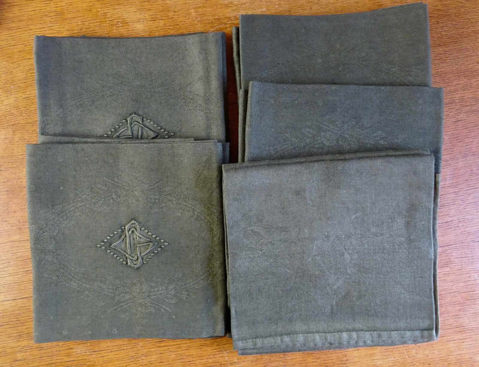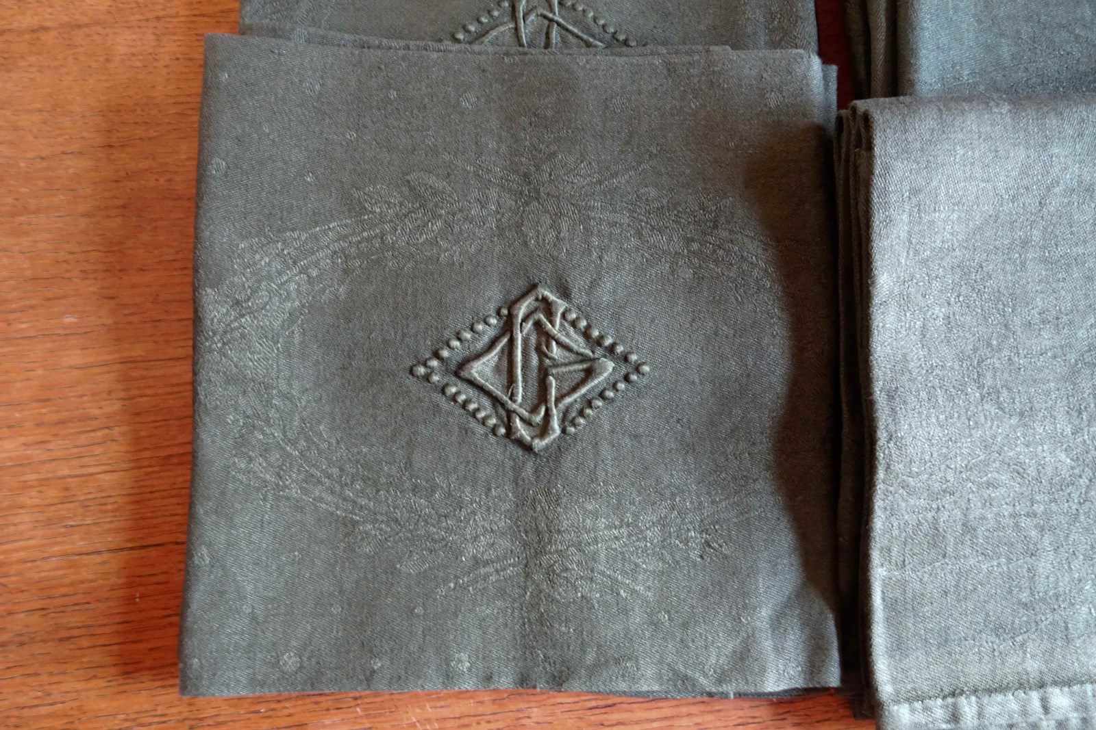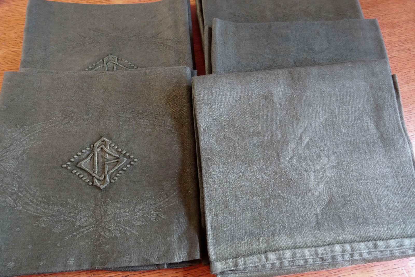 A set of 12 stylish vintage French linen damask napkins. Excellent quality linen with a flamboyant pattern to the damask. I have hand dyed this set in a rich, warm dark olivey green (colour looks a little grey/cooler shade on my screen). I love to dye damask, it really brings the wonderful patterns of the weave alive.