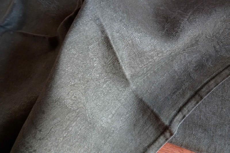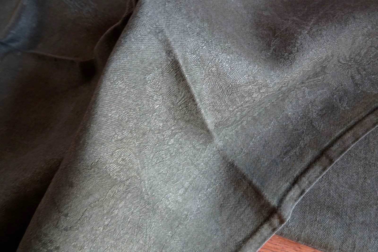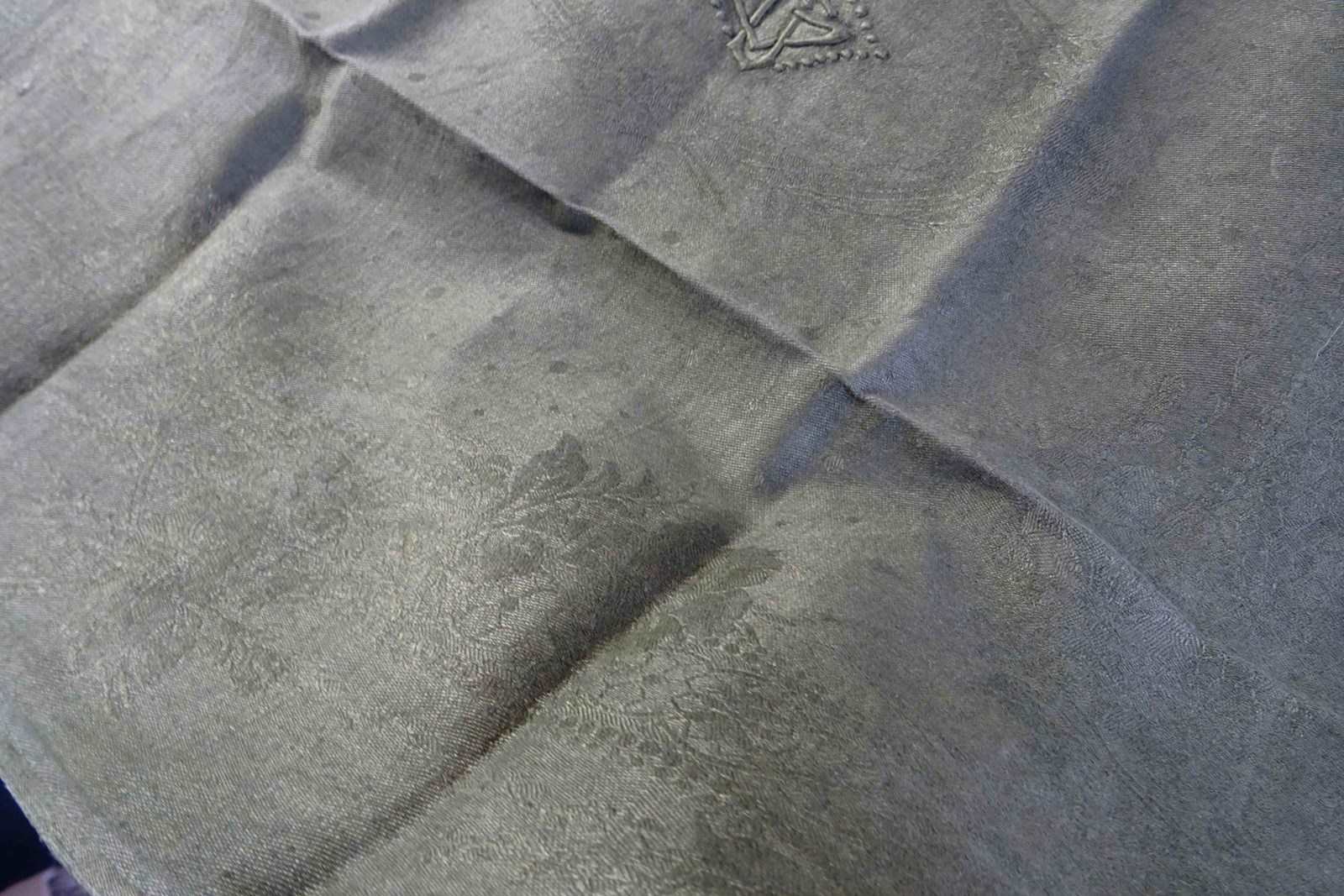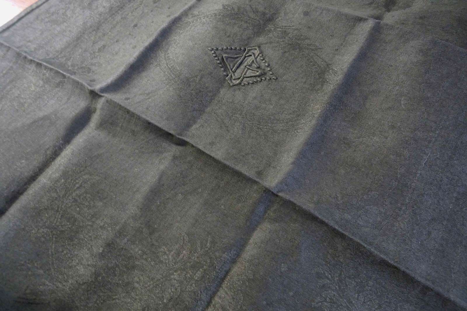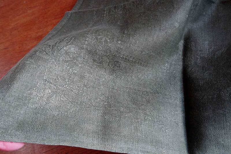 A set of 12 stylish vintage French linen damask napkins. Excellent quality linen with a flamboyant pattern to the damask. I have hand dyed this set in a rich, warm dark olivey green (colour looks a little grey/cooler shade on my screen). I love to dye damask, it really brings the wonderful patterns of the weave alive.