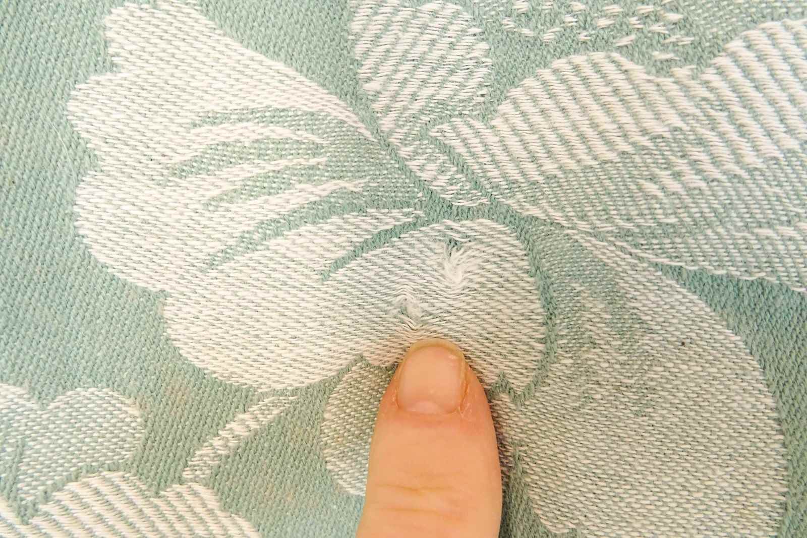I always suggest a wash before use to freshen up but it's not 100% necessary. A cotton ticking, sturdy but soft to the touch. One mark as shown but I can't see anything else. A few little snags like the one shown.