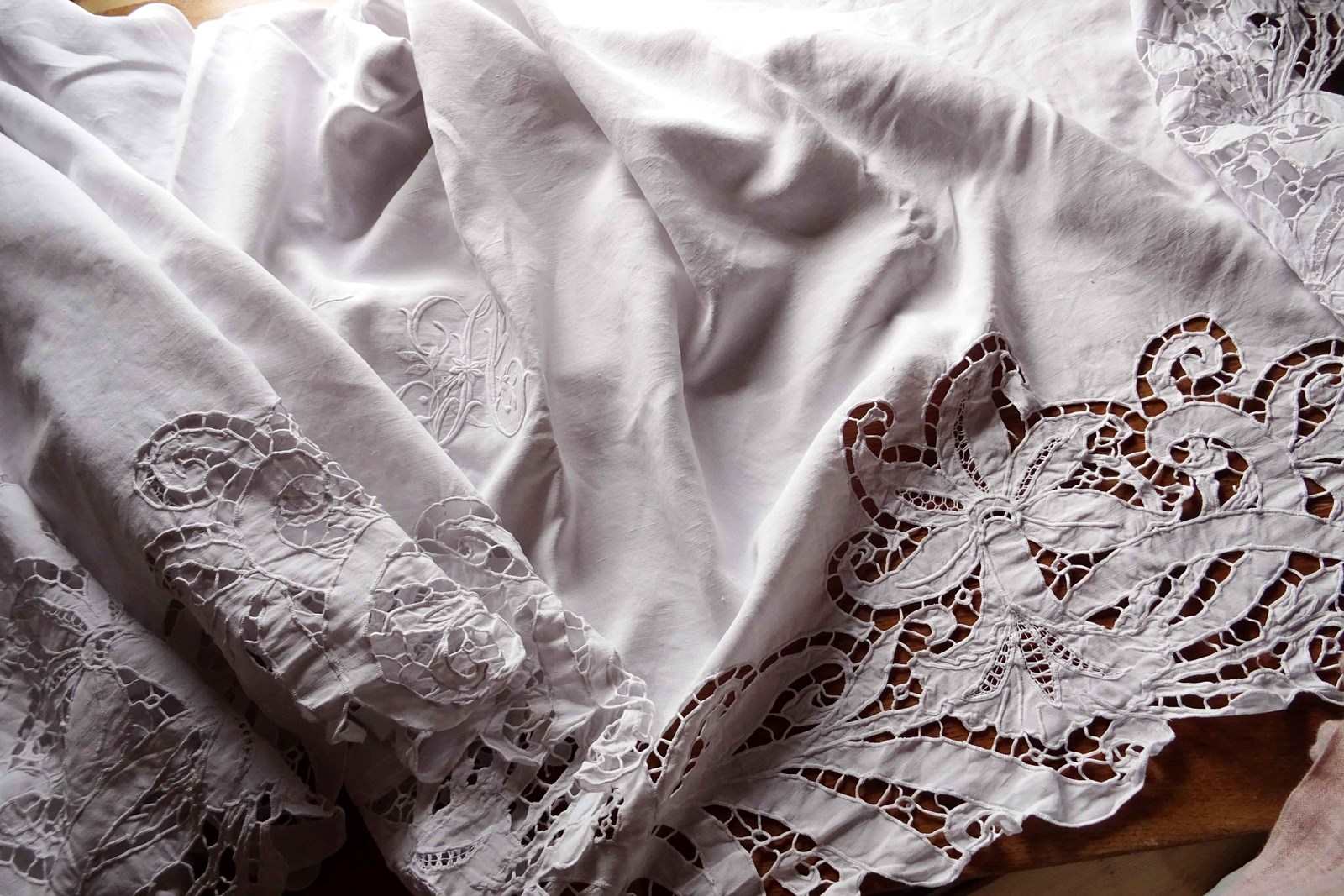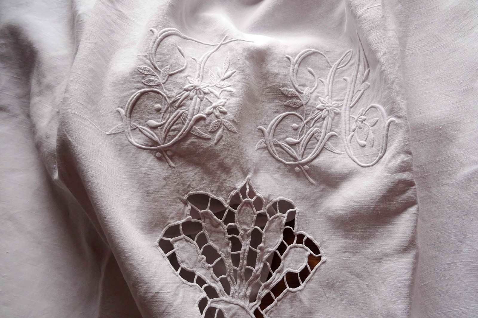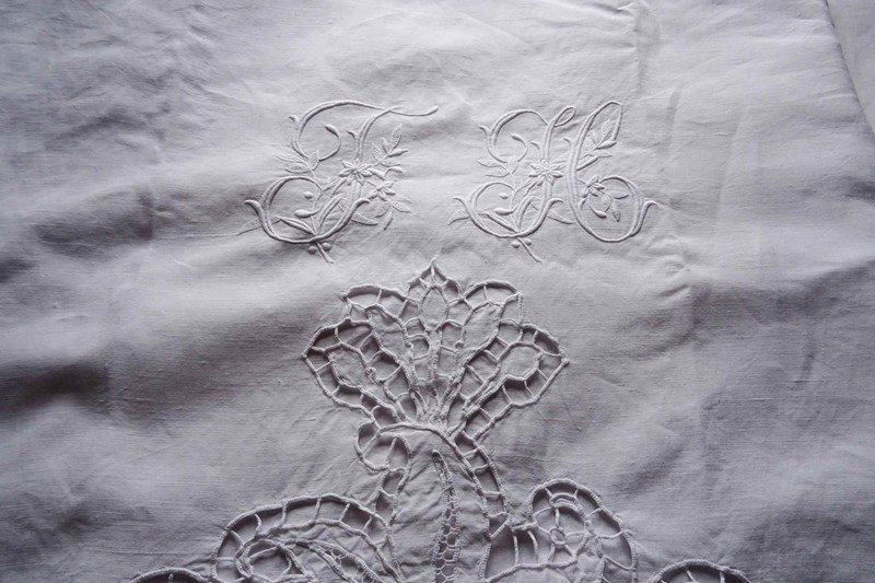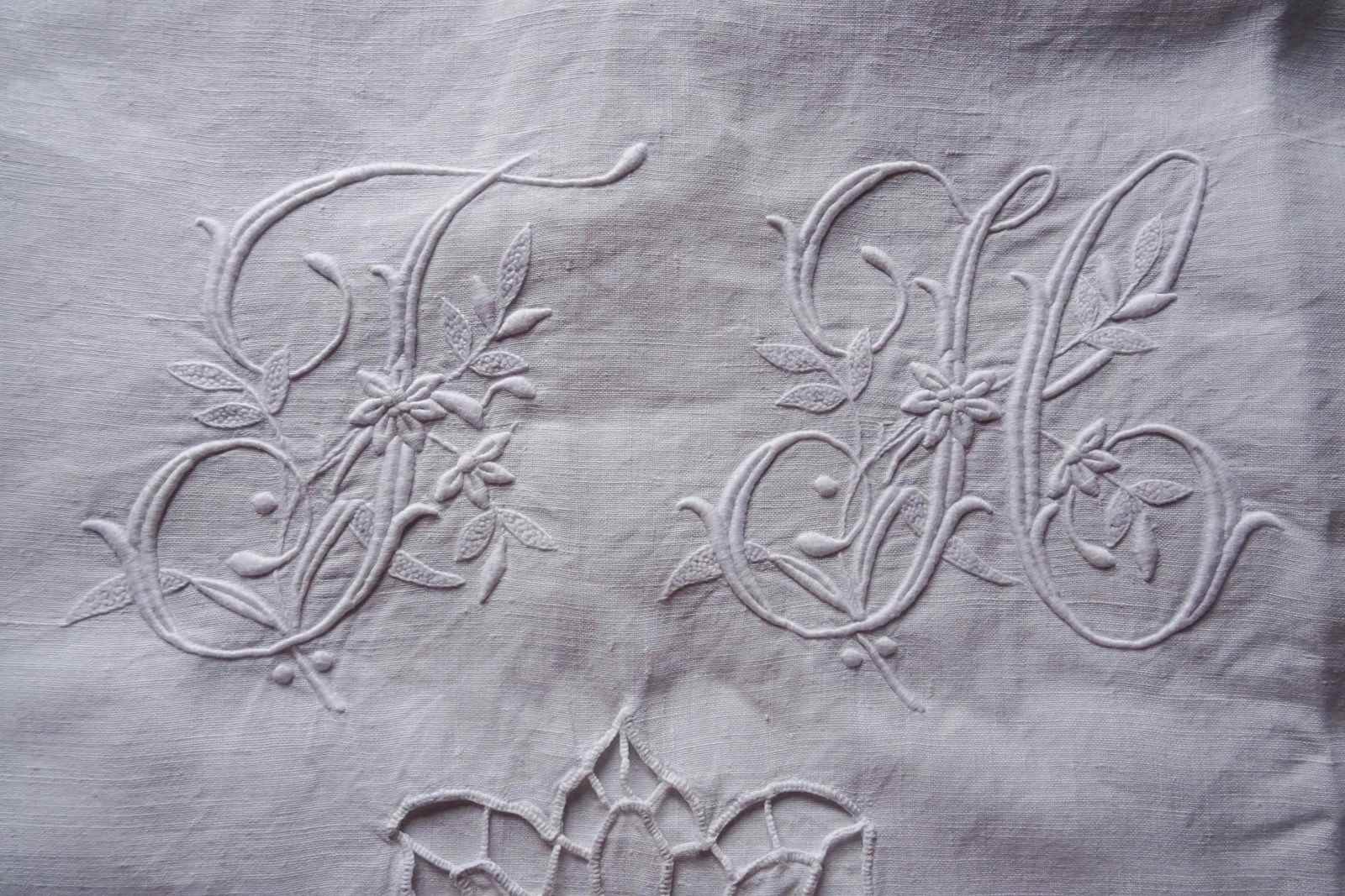 Large central monogram of the letters FH or JH above a deep cutwork border; all stitched by hand. One tiny hole and one tiny darn but generally strong and suited to everyday use. No marks to speak of.