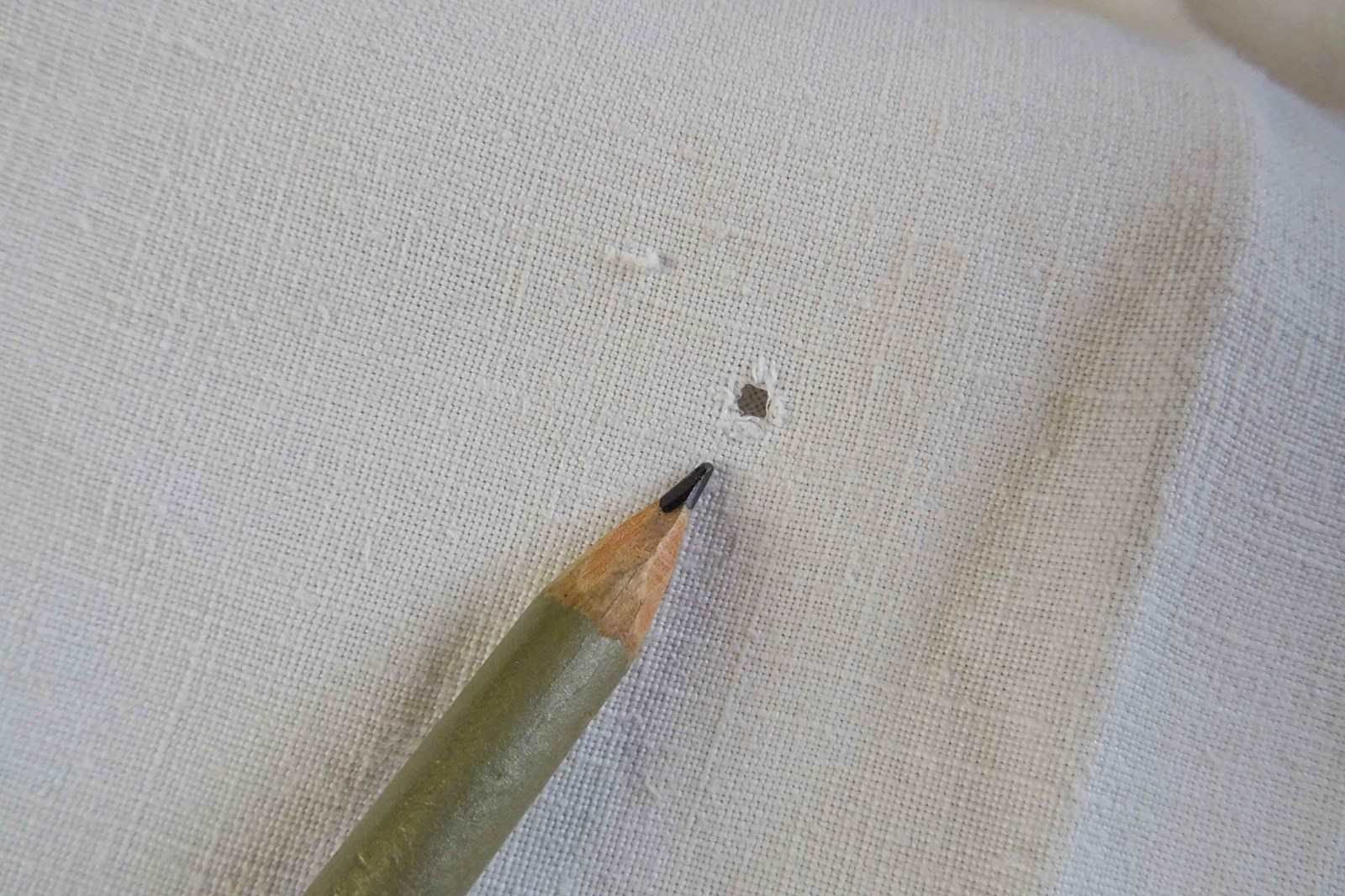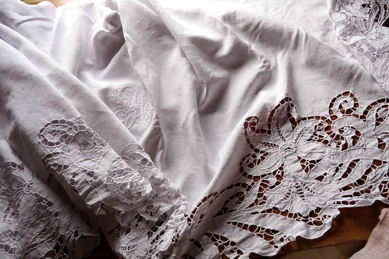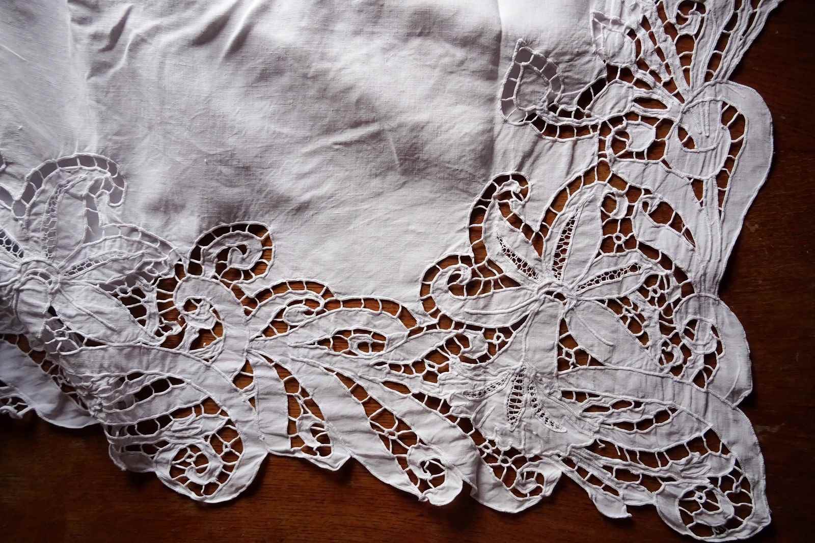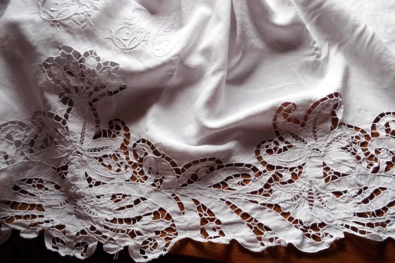 Large central monogram of the letters FH or JH above a deep cutwork border; all stitched by hand. One tiny hole and one tiny darn but generally strong and suited to everyday use. No marks to speak of.