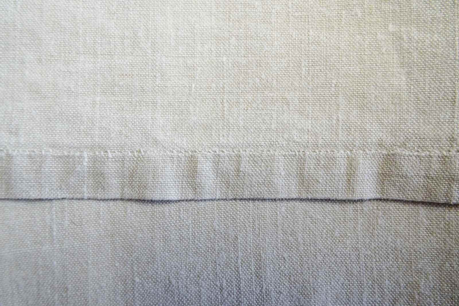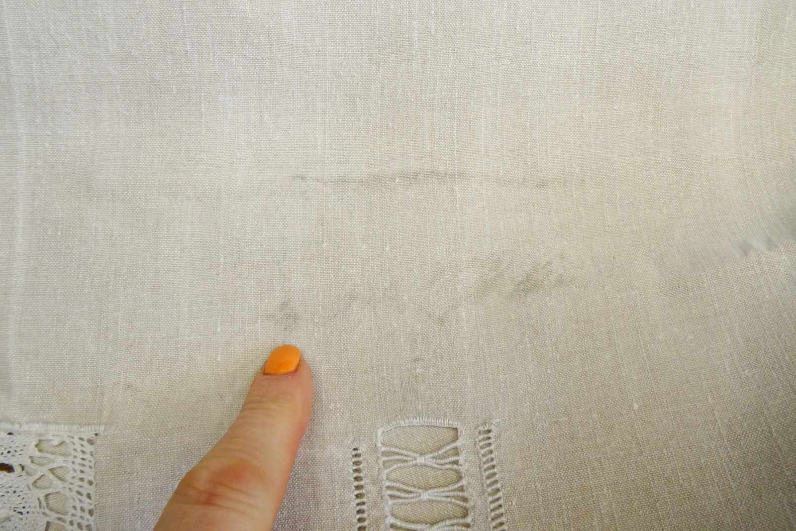 An unused piece with no damage or wear, it is in excellent condition. The colour is a putty-beige-off white which will lighten as the sheet is laundered. Just a couple of marks in the body of the sheet which should fade out as the sheet is soaked and washed.