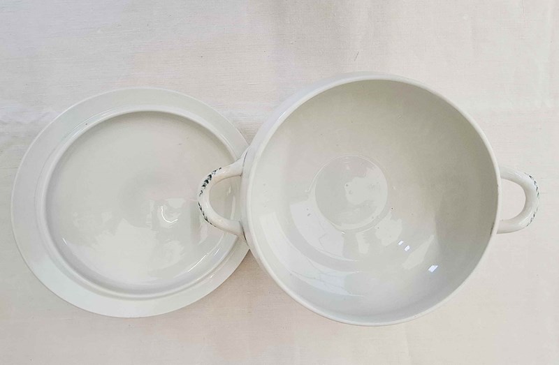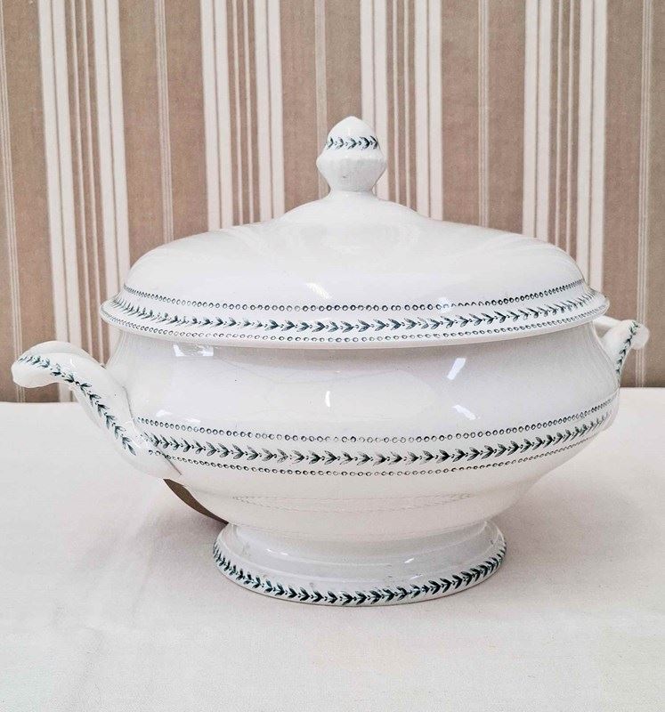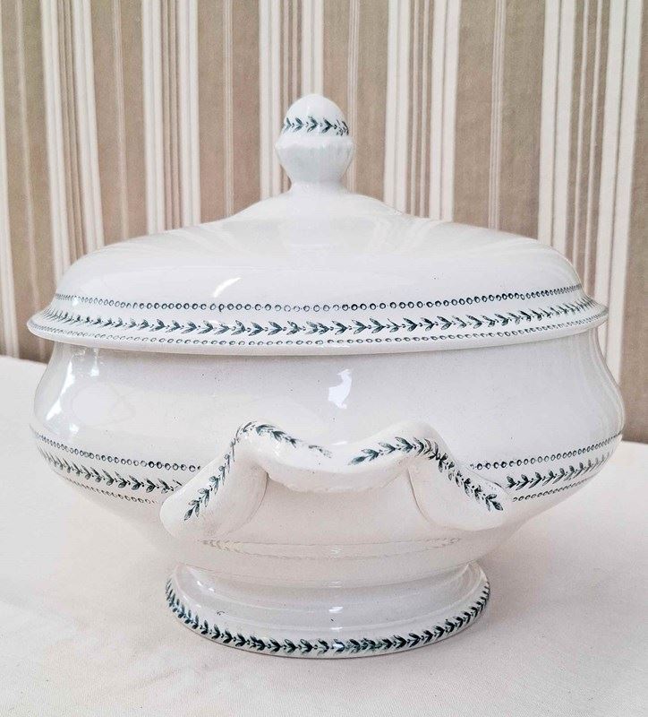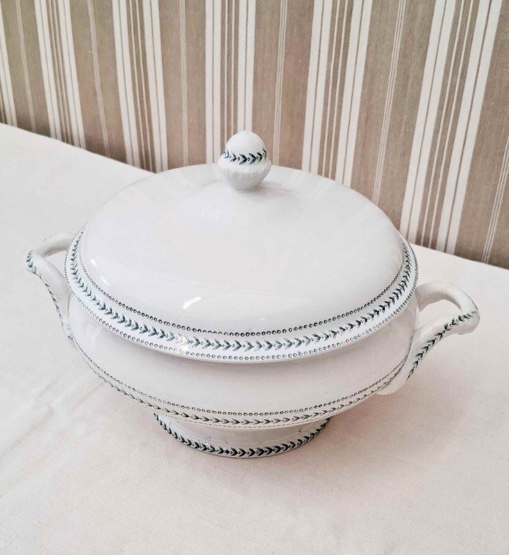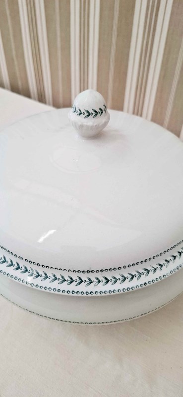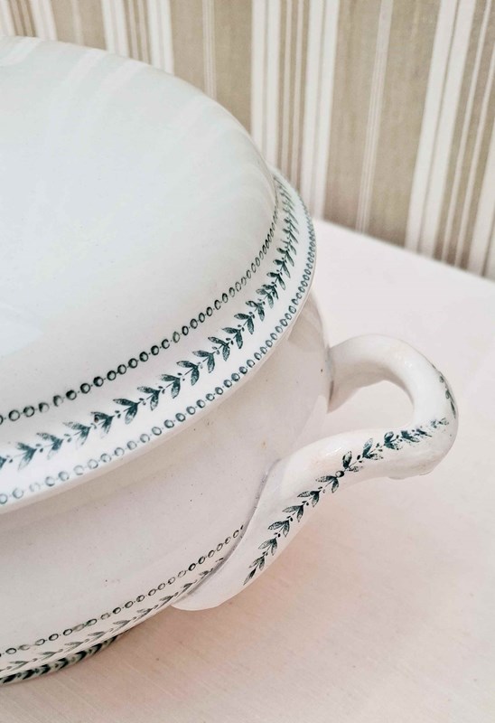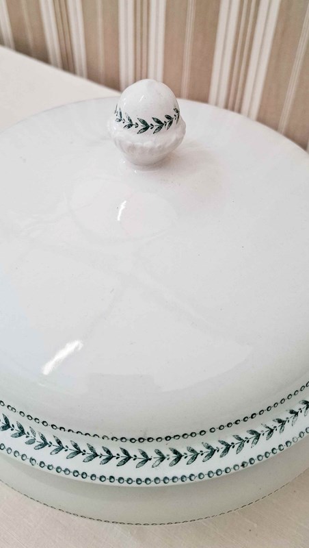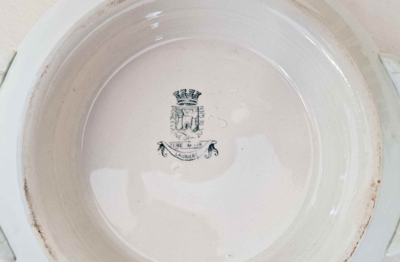 This piece is in the simple but very stylish "Lauriers" pattern by Gien which was manufactured between 1886 and 1938. This piece is early 1900s.