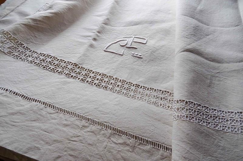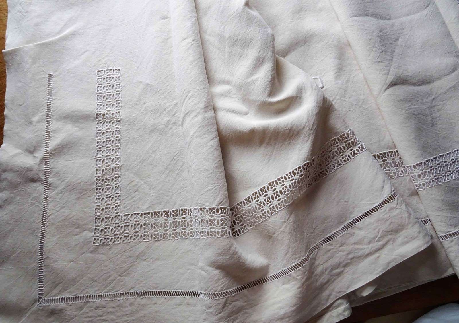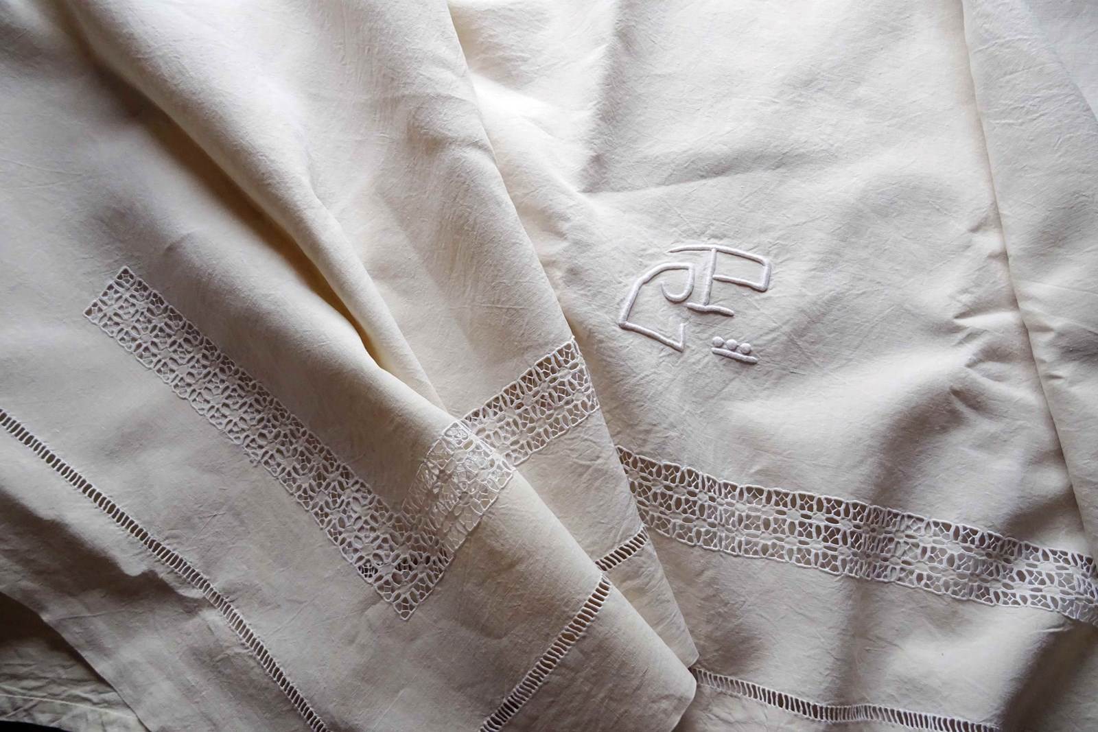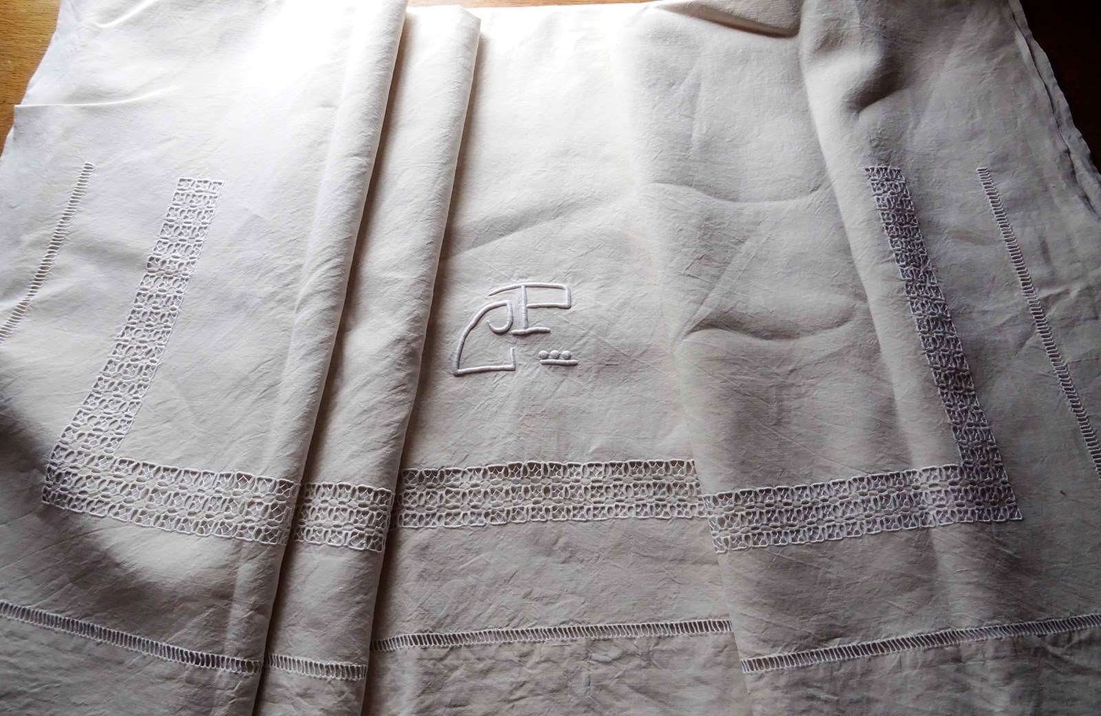 This is fabulous, the fabric is gorgeous and the workmanship intricate and well executed - just look at that deep band of drawn thread work, it will have taken 100s of hours to complete. The decoration continues all around the return of the sheet and frames the central monogram of the letters CP.