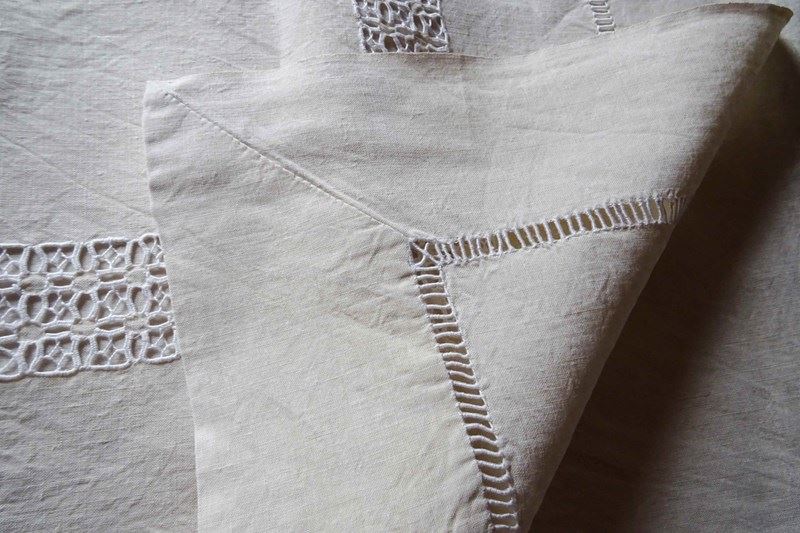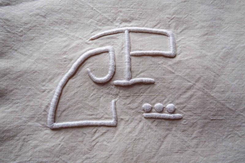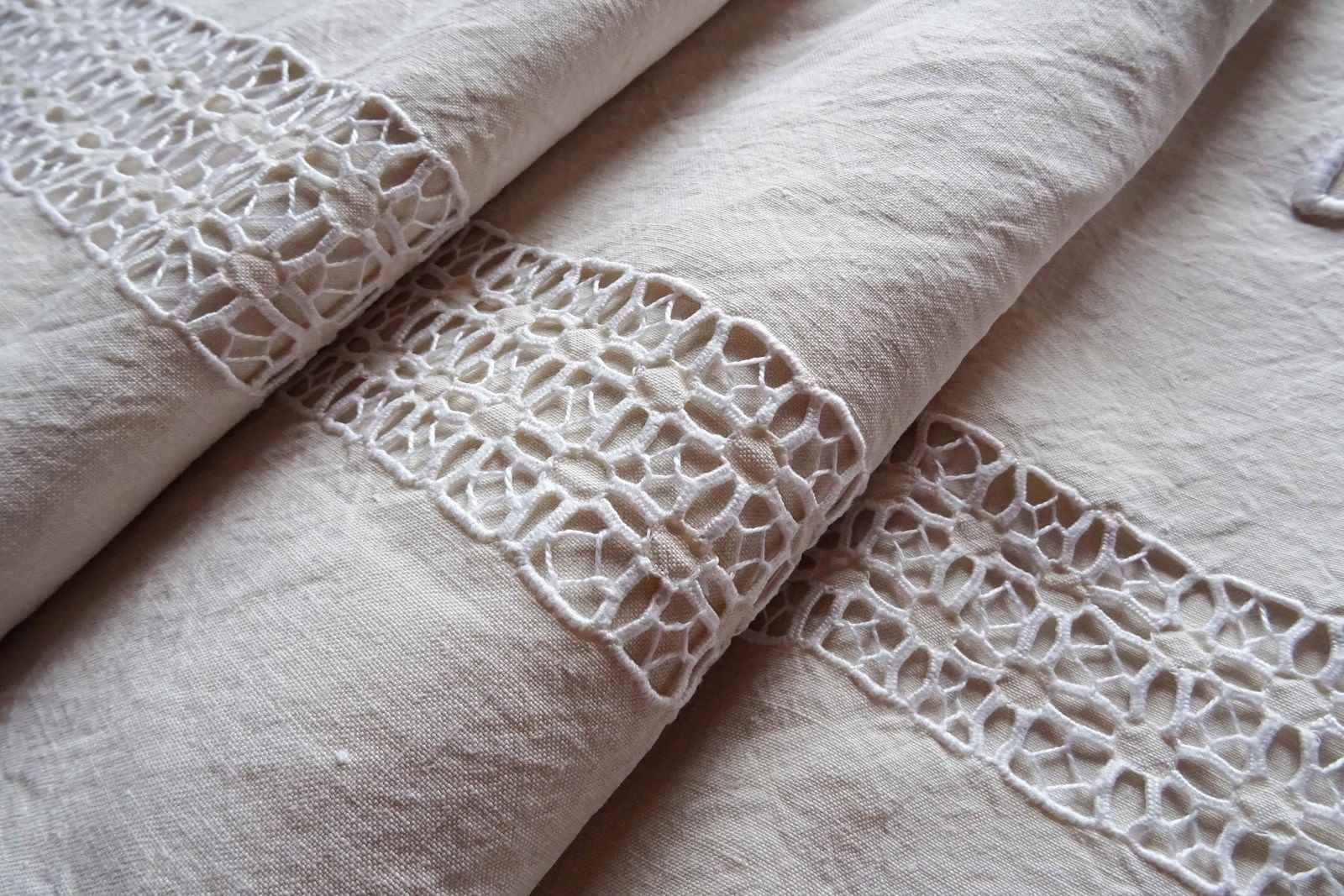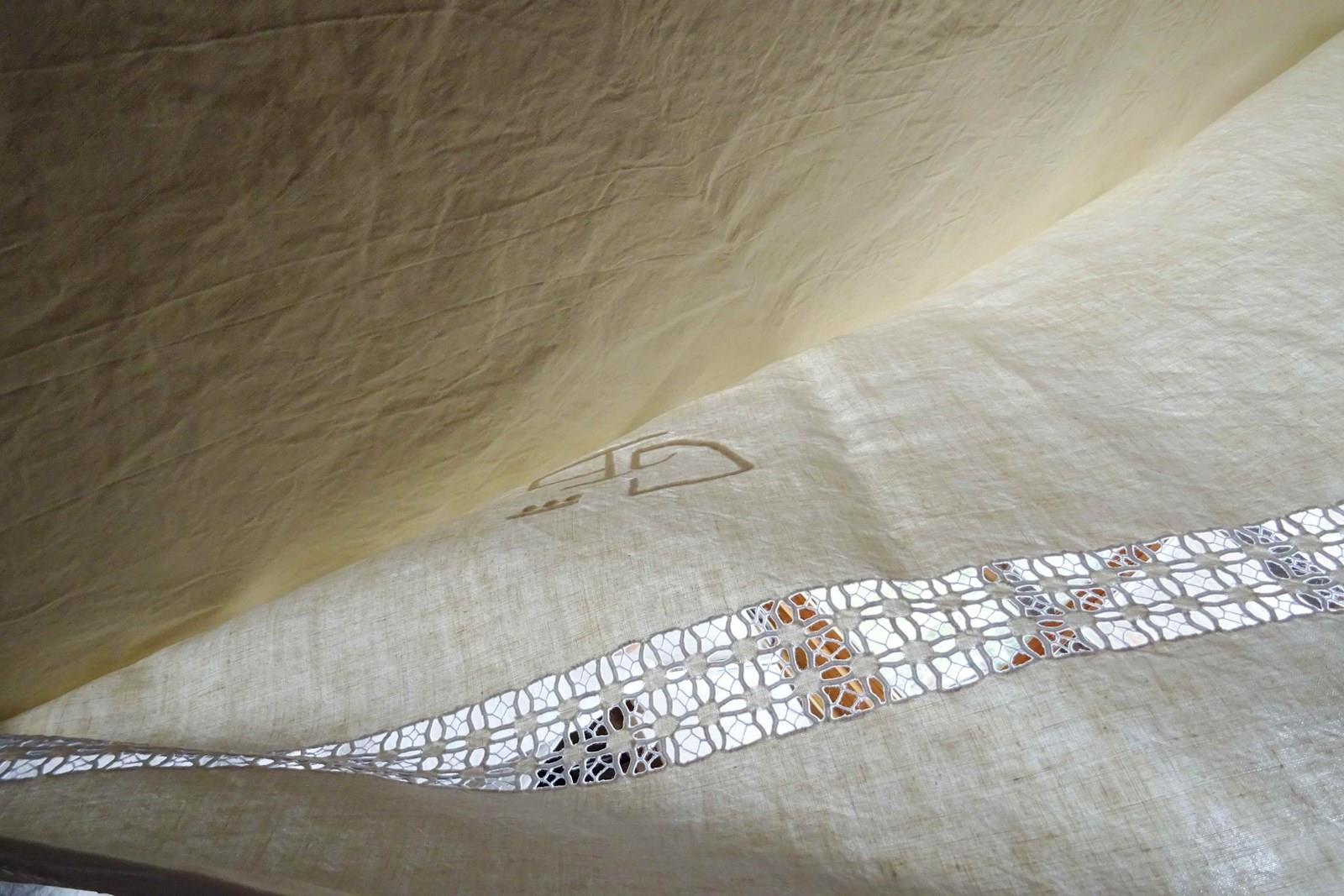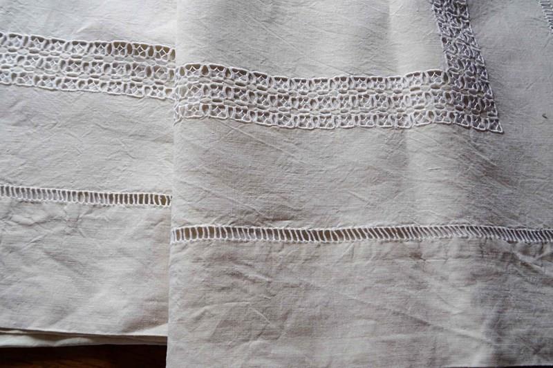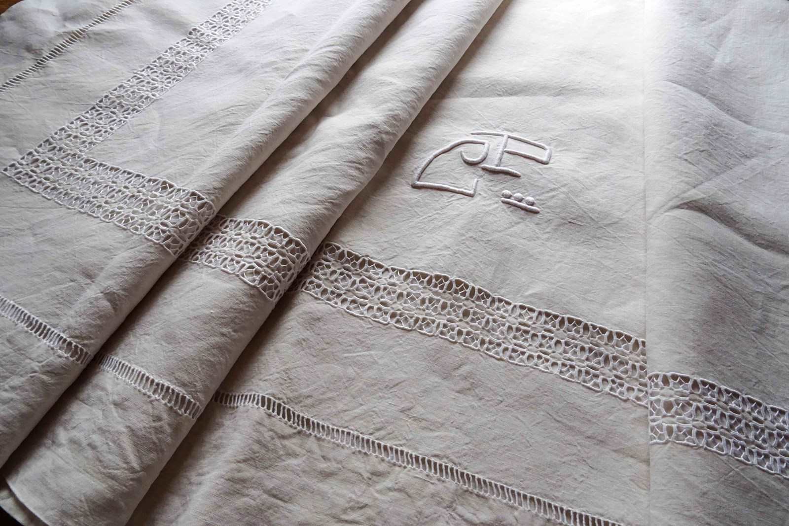 This is fabulous, the fabric is gorgeous and the workmanship intricate and well executed - just look at that deep band of drawn thread work, it will have taken 100s of hours to complete. The decoration continues all around the return of the sheet and frames the central monogram of the letters CP.