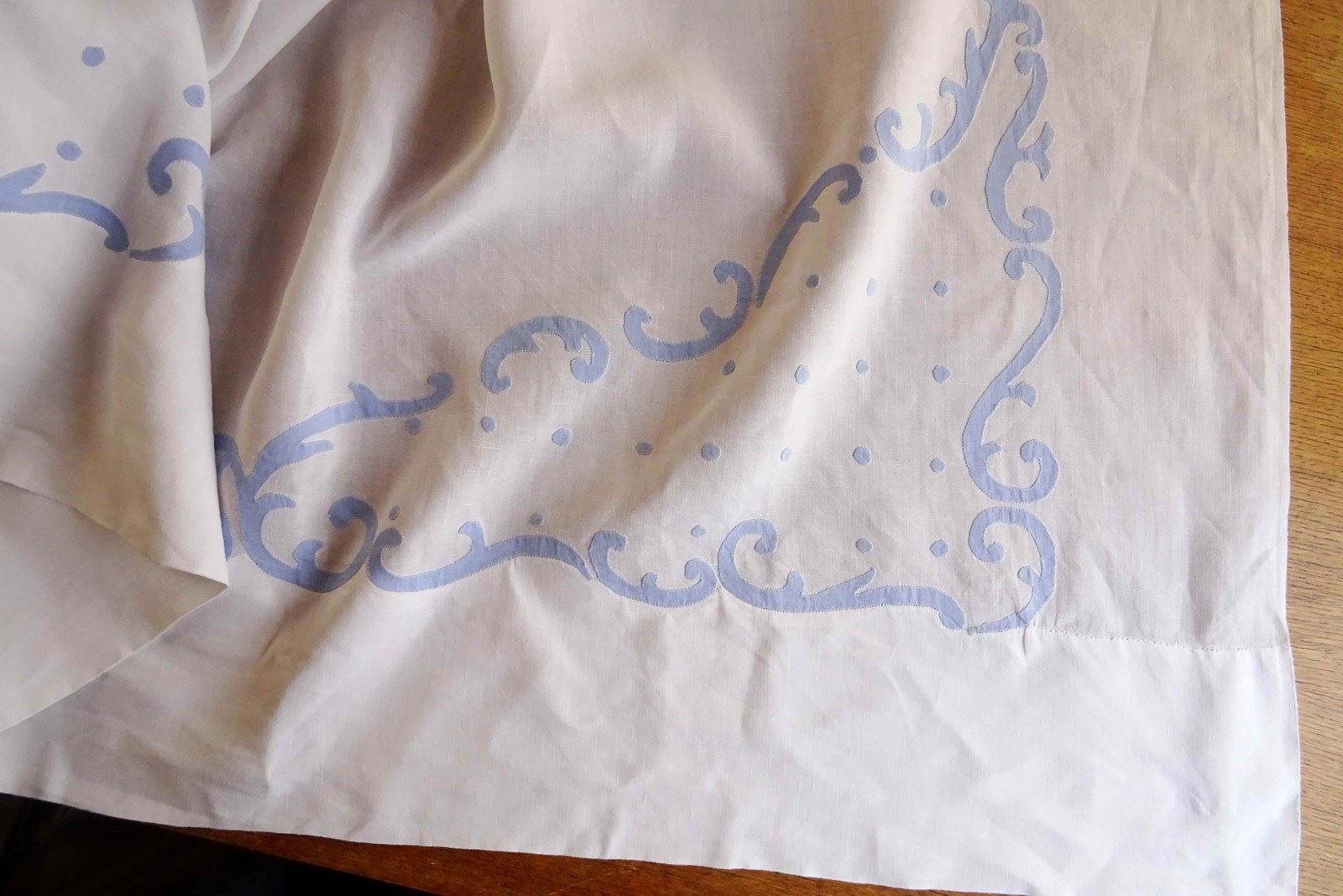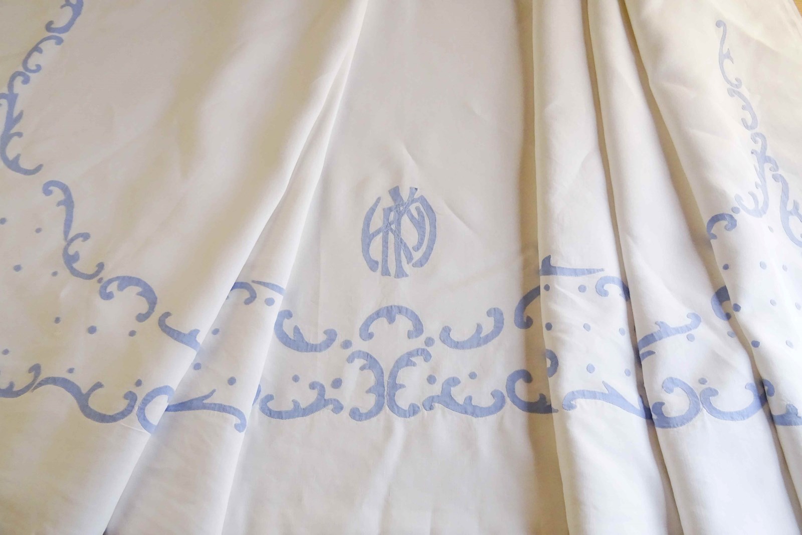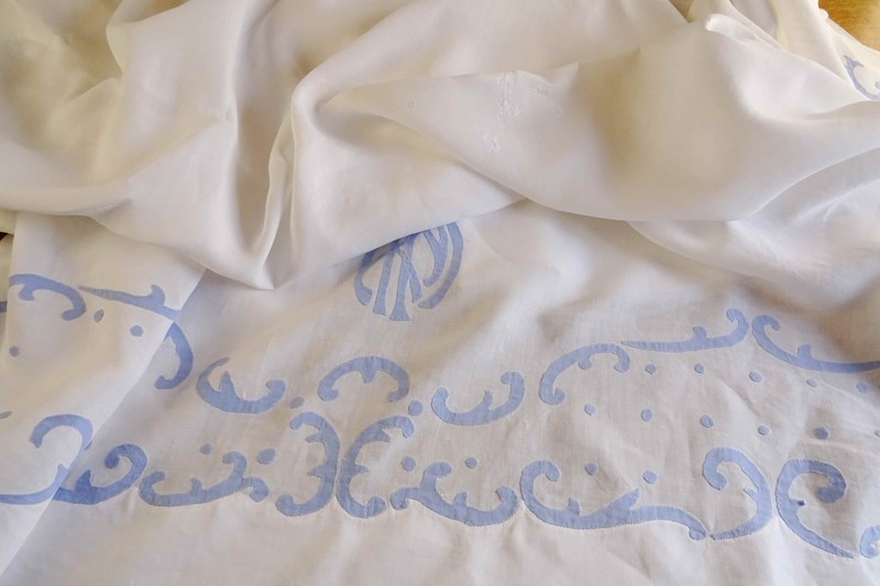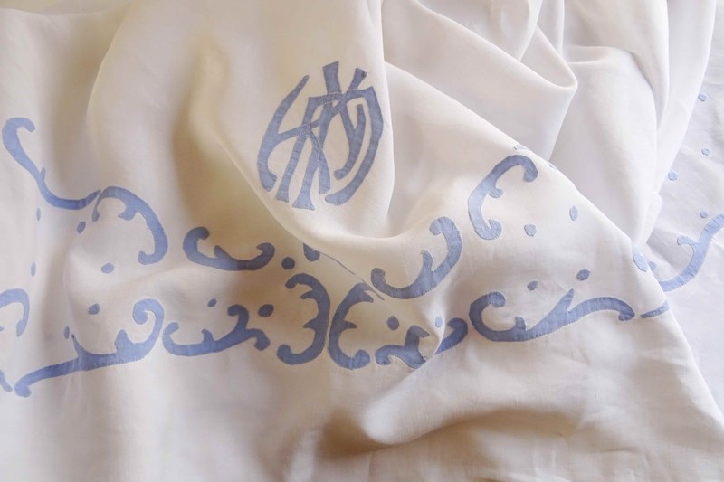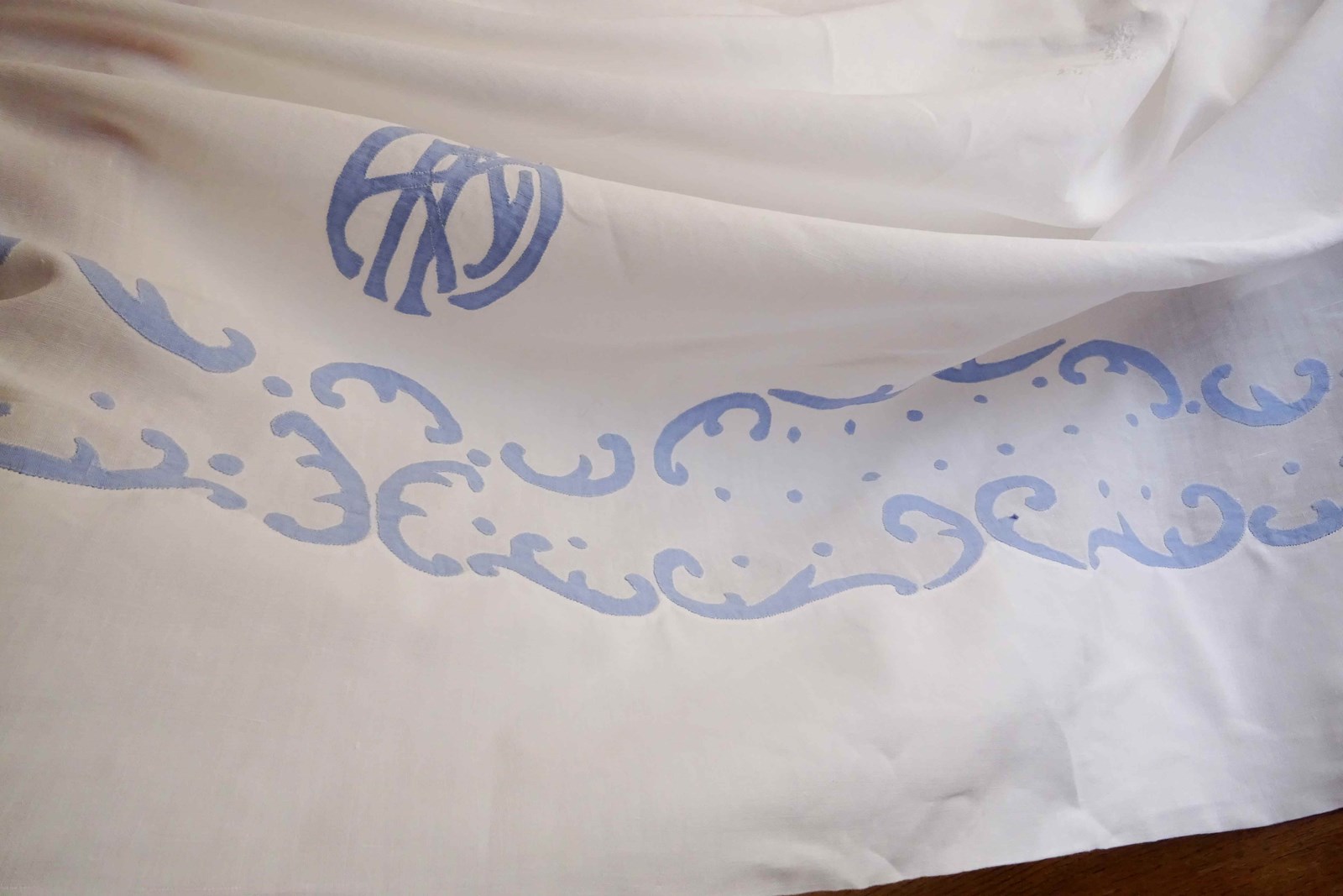 A fine white pure linen sheet with applique decoration and monogram. This sheet has one of my favourite details, something that speaks of a top quality piece - the bottom hem is finished with a very fine drawn thread hem which takes considerably longer to create than just a standard turned hem. And yet it would most likely only be seen by the maid.