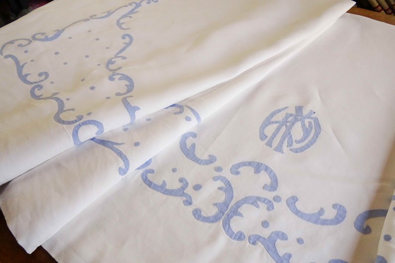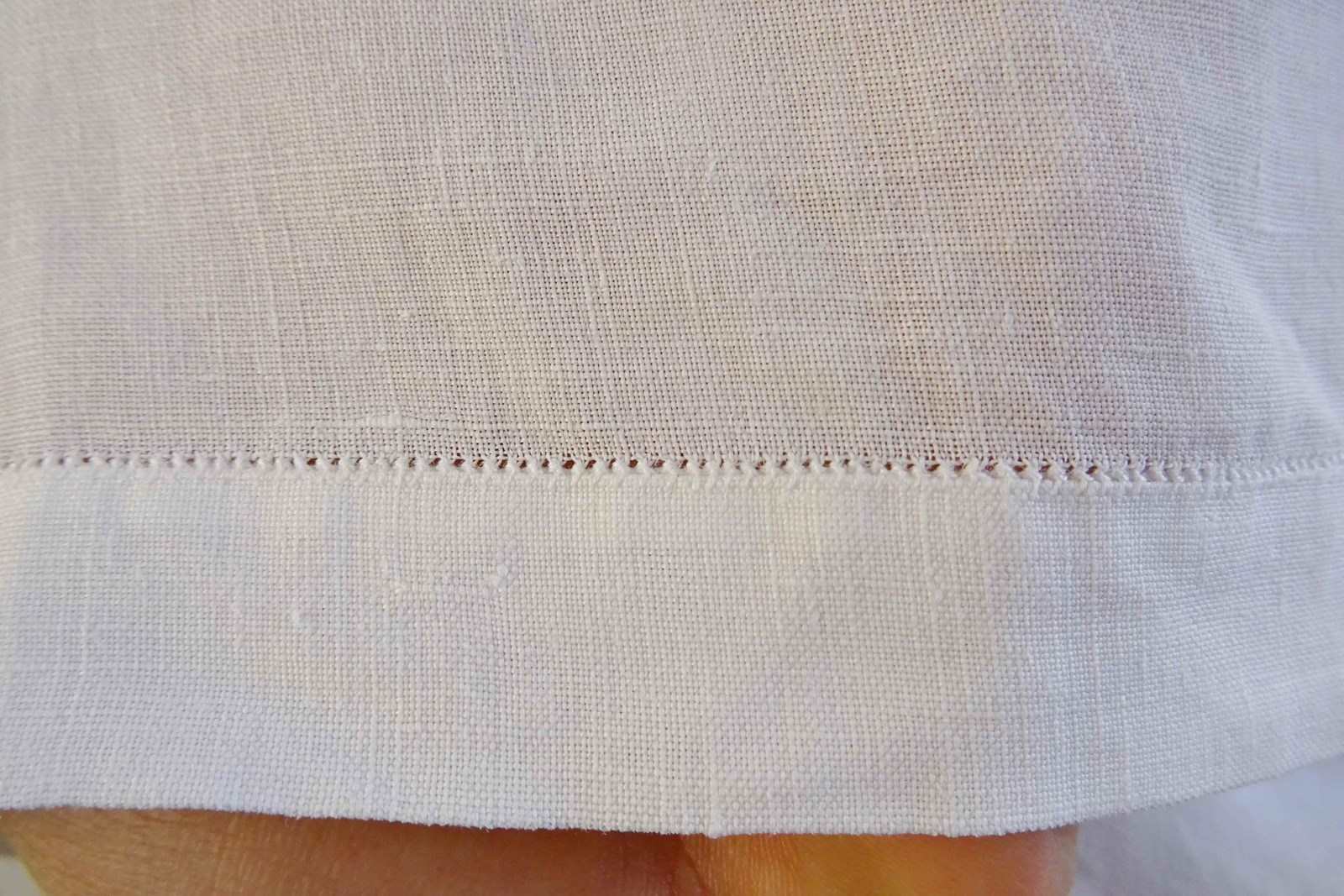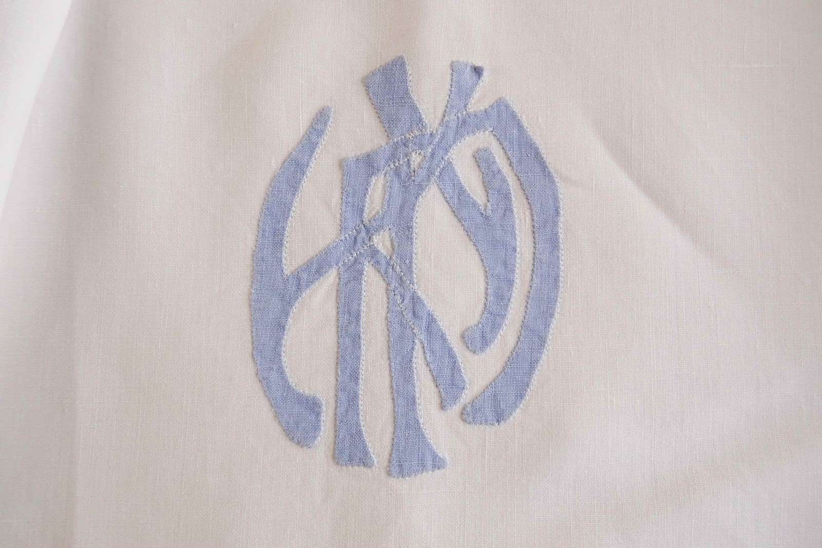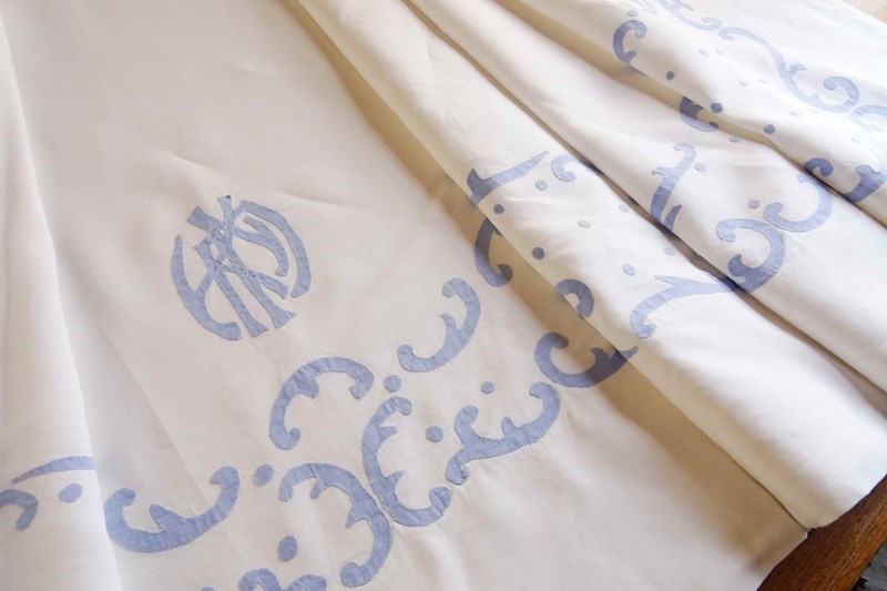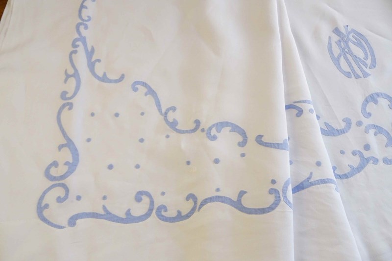A fine white pure linen sheet with applique decoration and monogram. This sheet has one of my favourite details, something that speaks of a top quality piece - the bottom hem is finished with a very fine drawn thread hem which takes considerably longer to create than just a standard turned hem. And yet it would most likely only be seen by the maid.