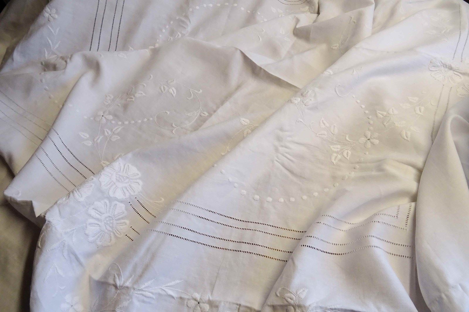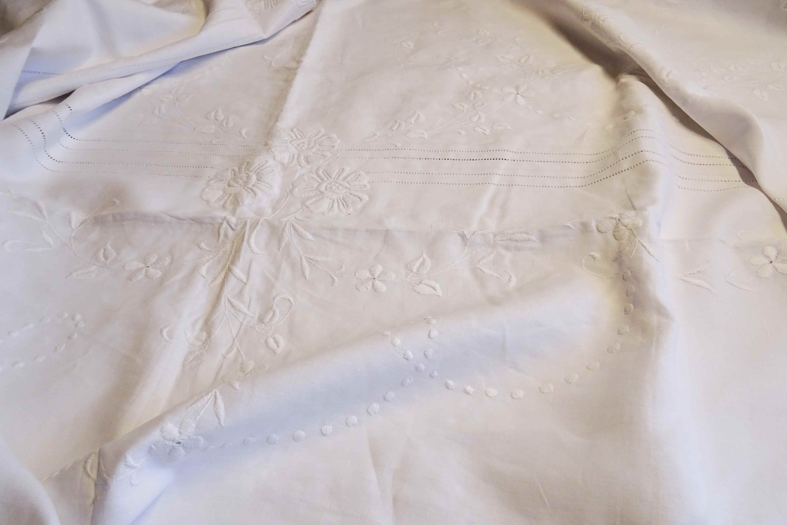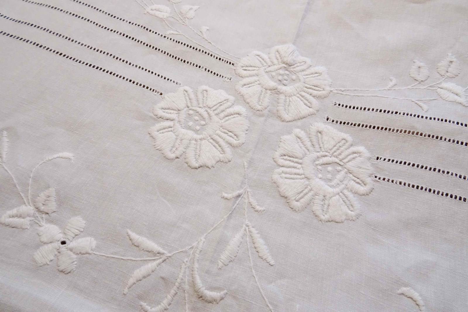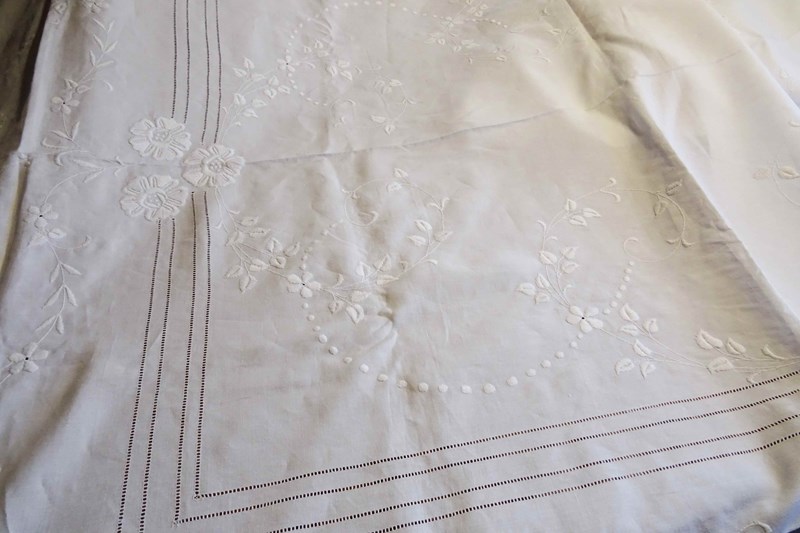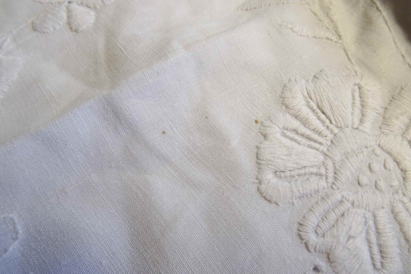 A huge, beautiful vintage French white linen bedspread with such pretty embroidered decoration. These lovely summery bedspreads make fabulous voile curtains, the linen will filter the light beautifully, really showcasing the decoration.