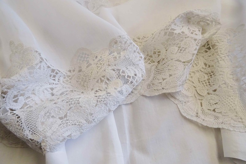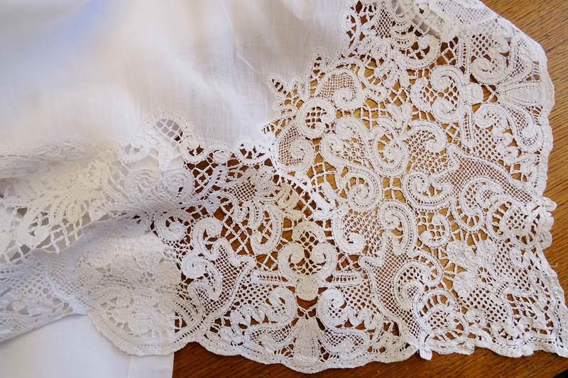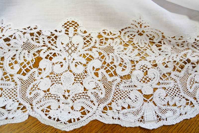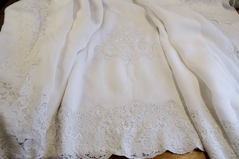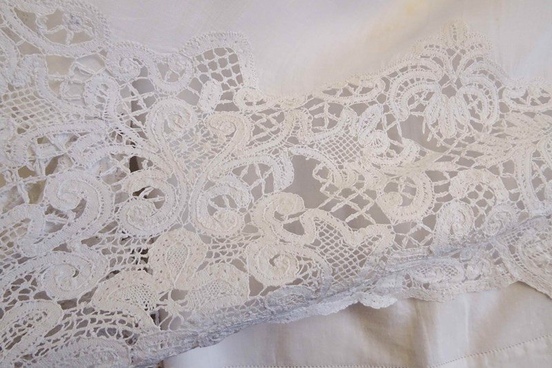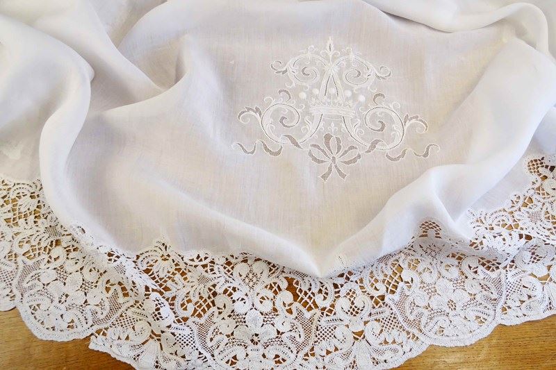 Enormous Fine Linen Sheet With "A" Monogram And Lace Border