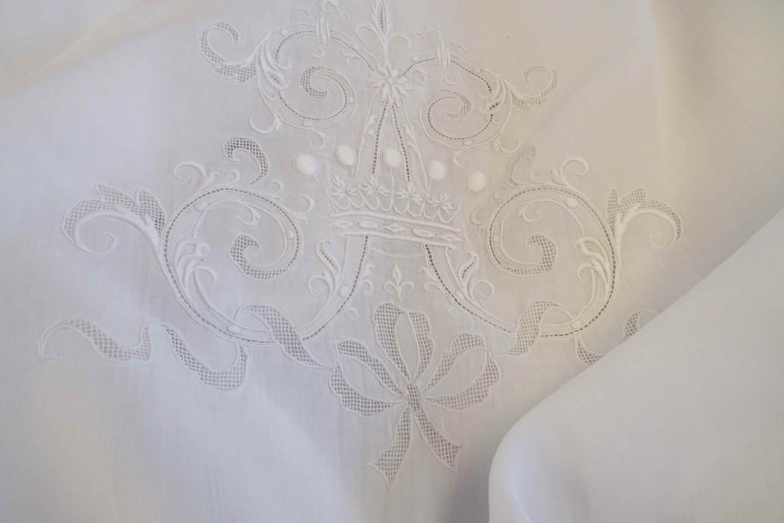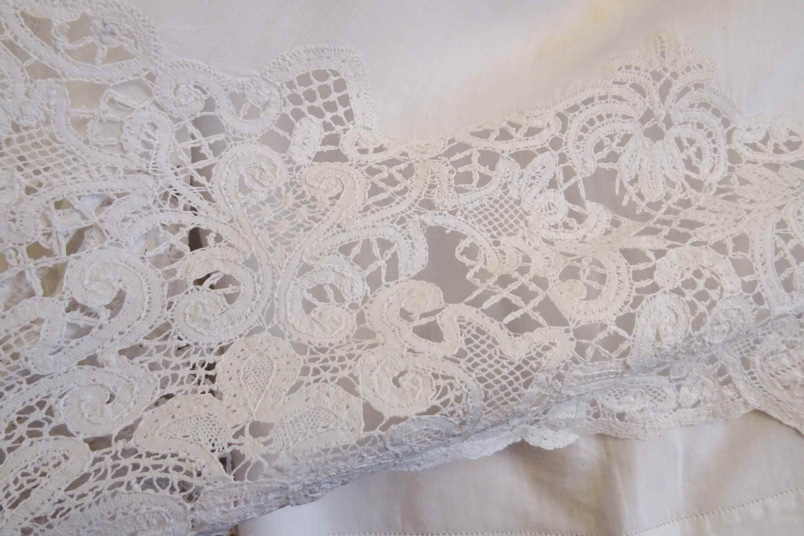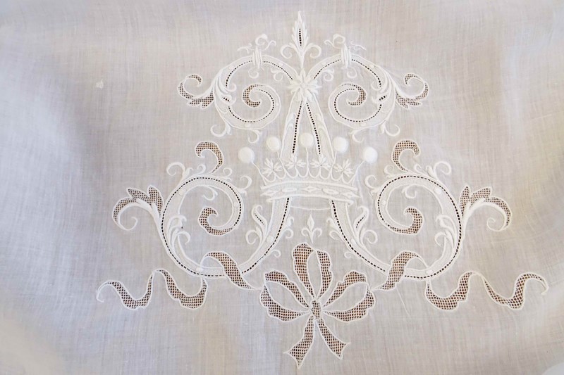 This sheet will have been so very expensive when it was new, it is quite the creation and it is absolutely enormous. A very fine top quality pure white linen with huge intricately worked monogram of the letter A with five point coronet of a vicomte and drawn threadwork ribbon surrounded by a deep lace panel. This is really glamour all the way!