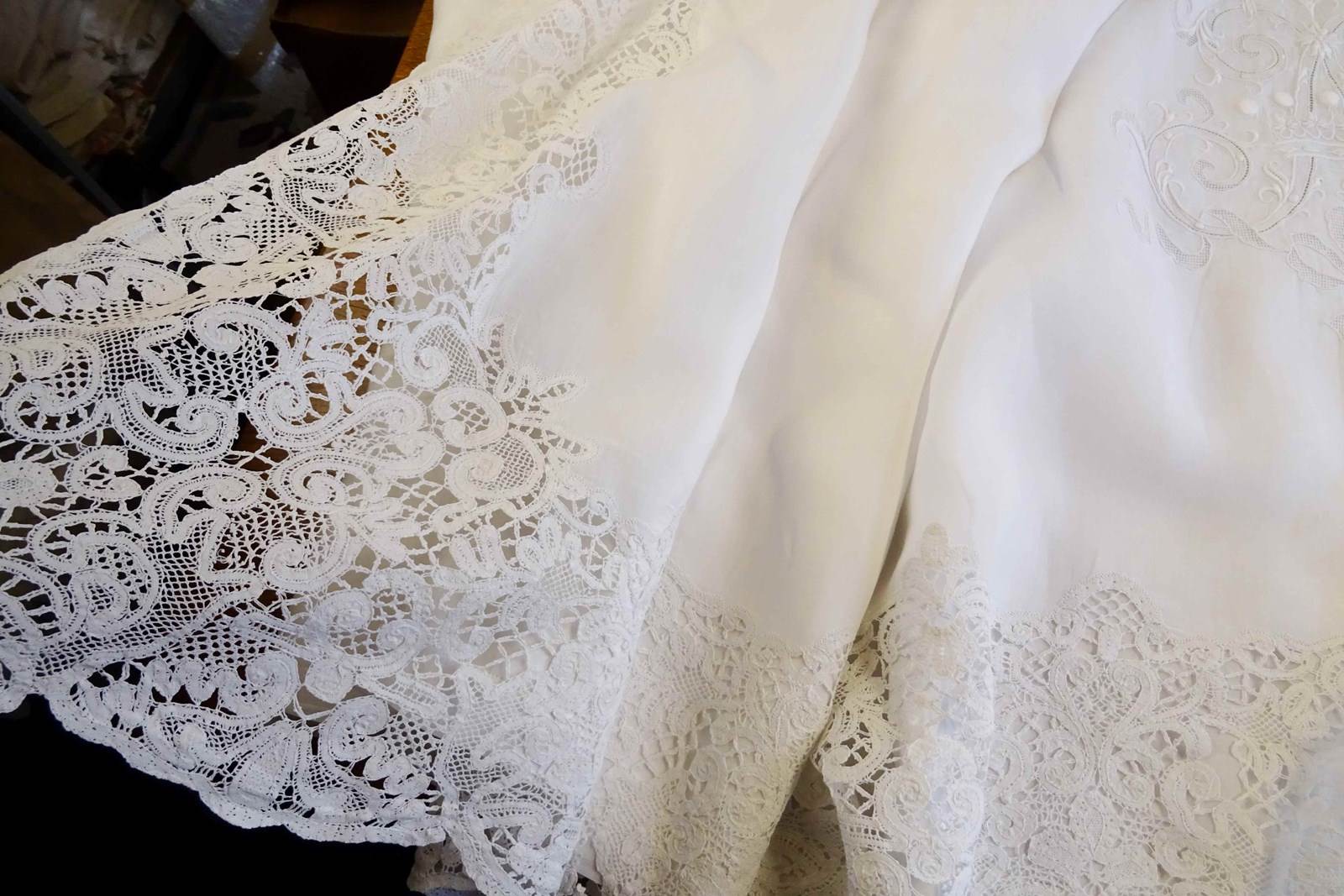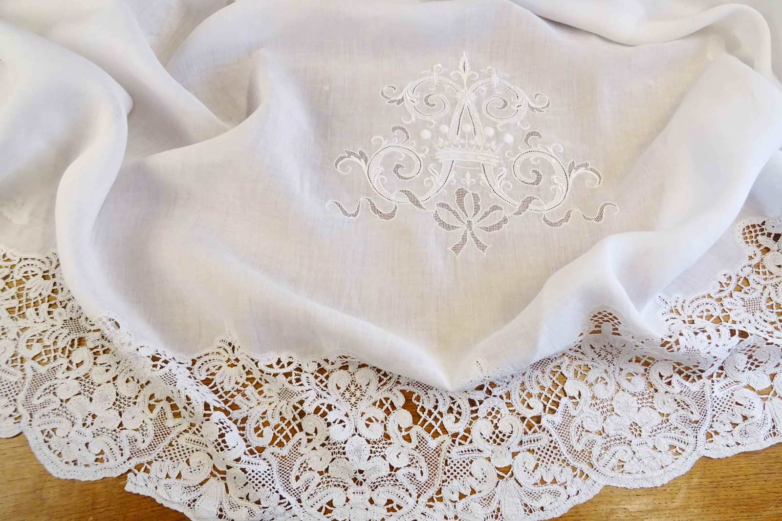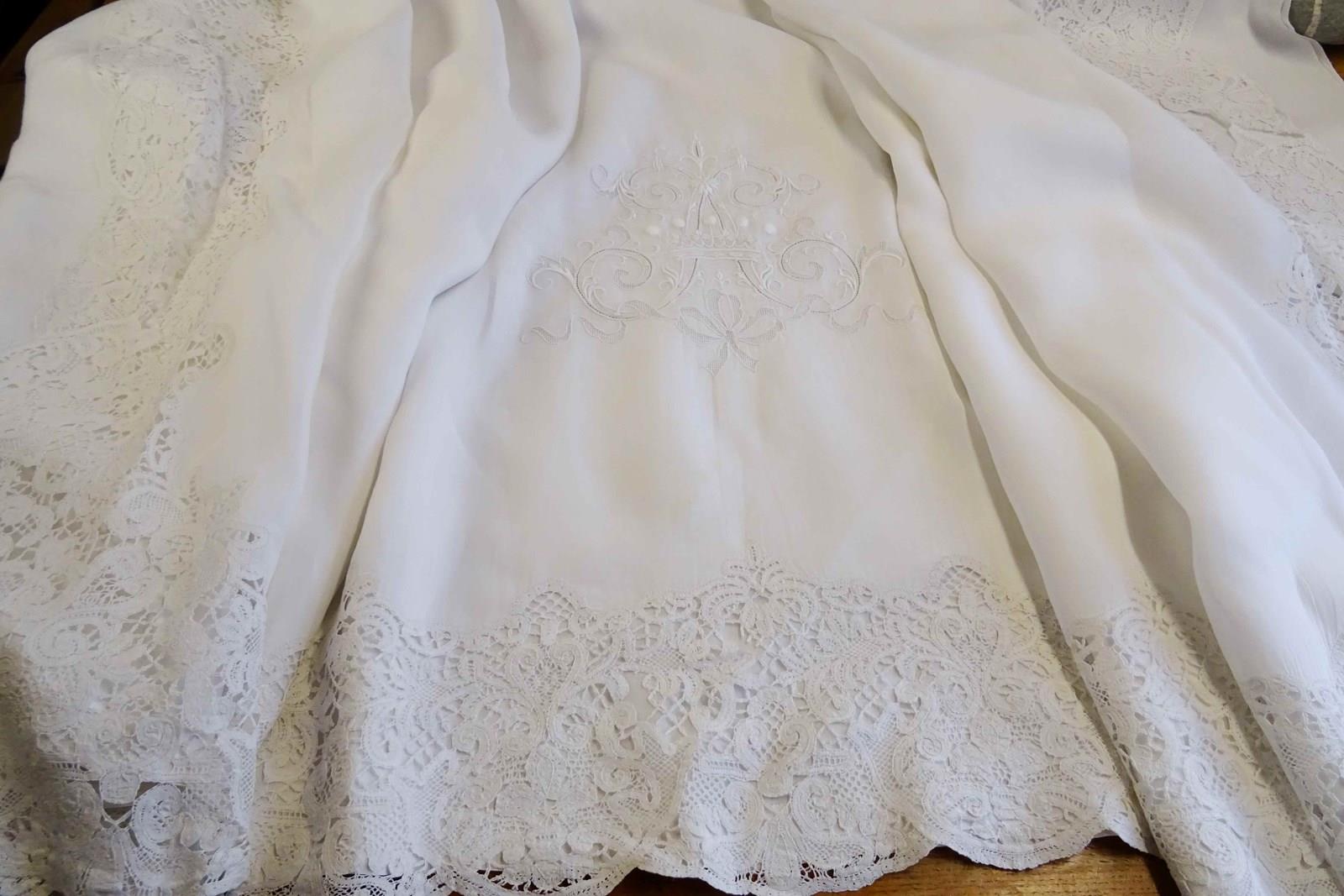 This sheet will have been so very expensive when it was new, it is quite the creation and it is absolutely enormous. A very fine top quality pure white linen with huge intricately worked monogram of the letter A with five point coronet of a vicomte and drawn threadwork ribbon surrounded by a deep lace panel. This is really glamour all the way!