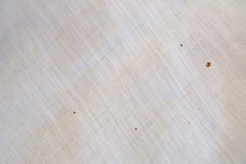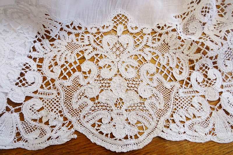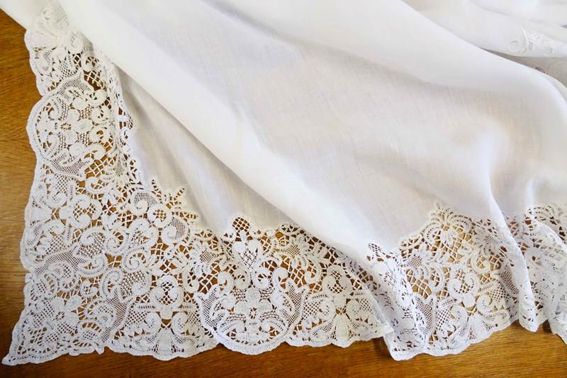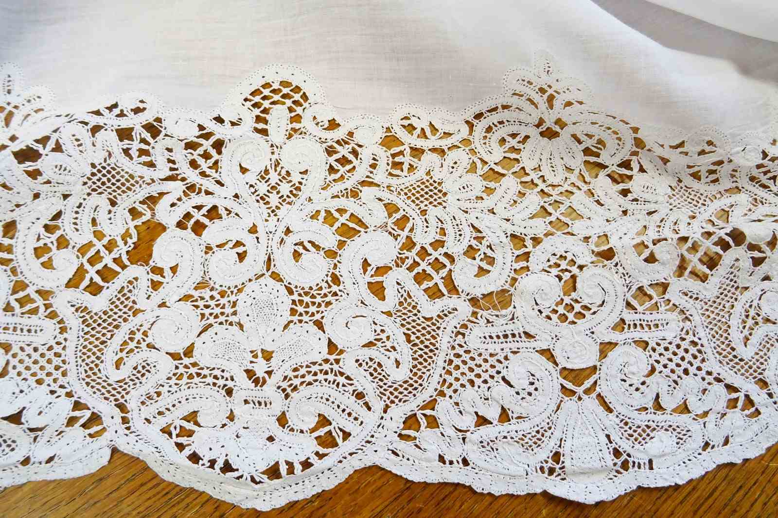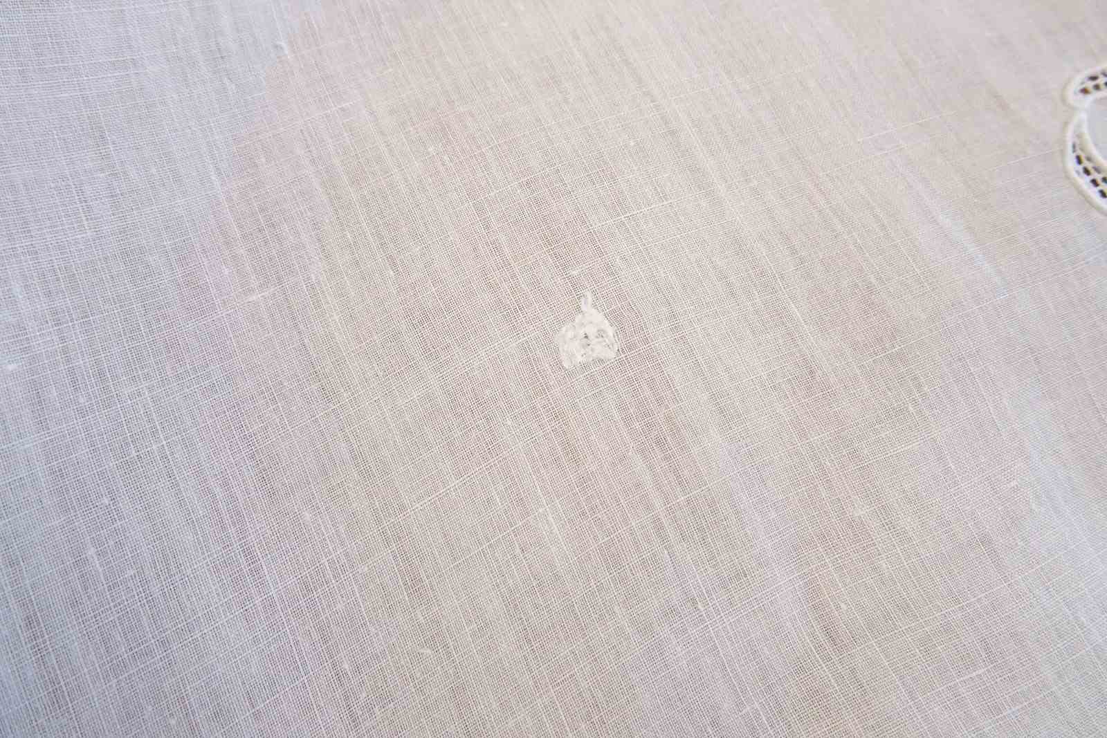 There are two or three small darns and one group of tiny holes and a couple more pin holes but overall the linen does feel strong - with care it could be used for bedding. The fine linen does often have small repairs in it; just part of the life of a vintage piece. Small damaged areas to the lace border. Priced accordingly, of course.