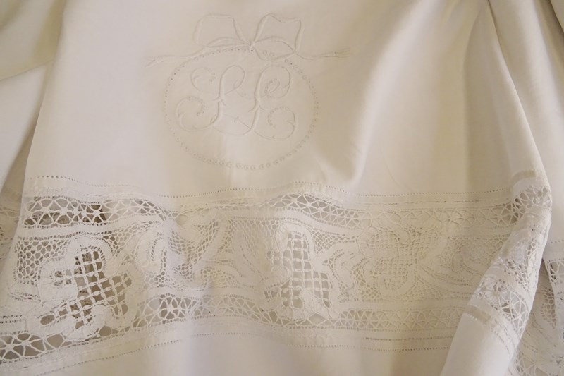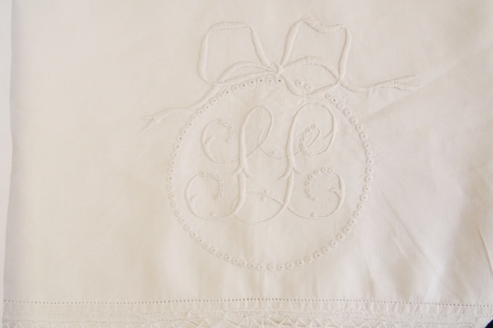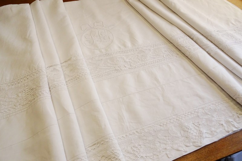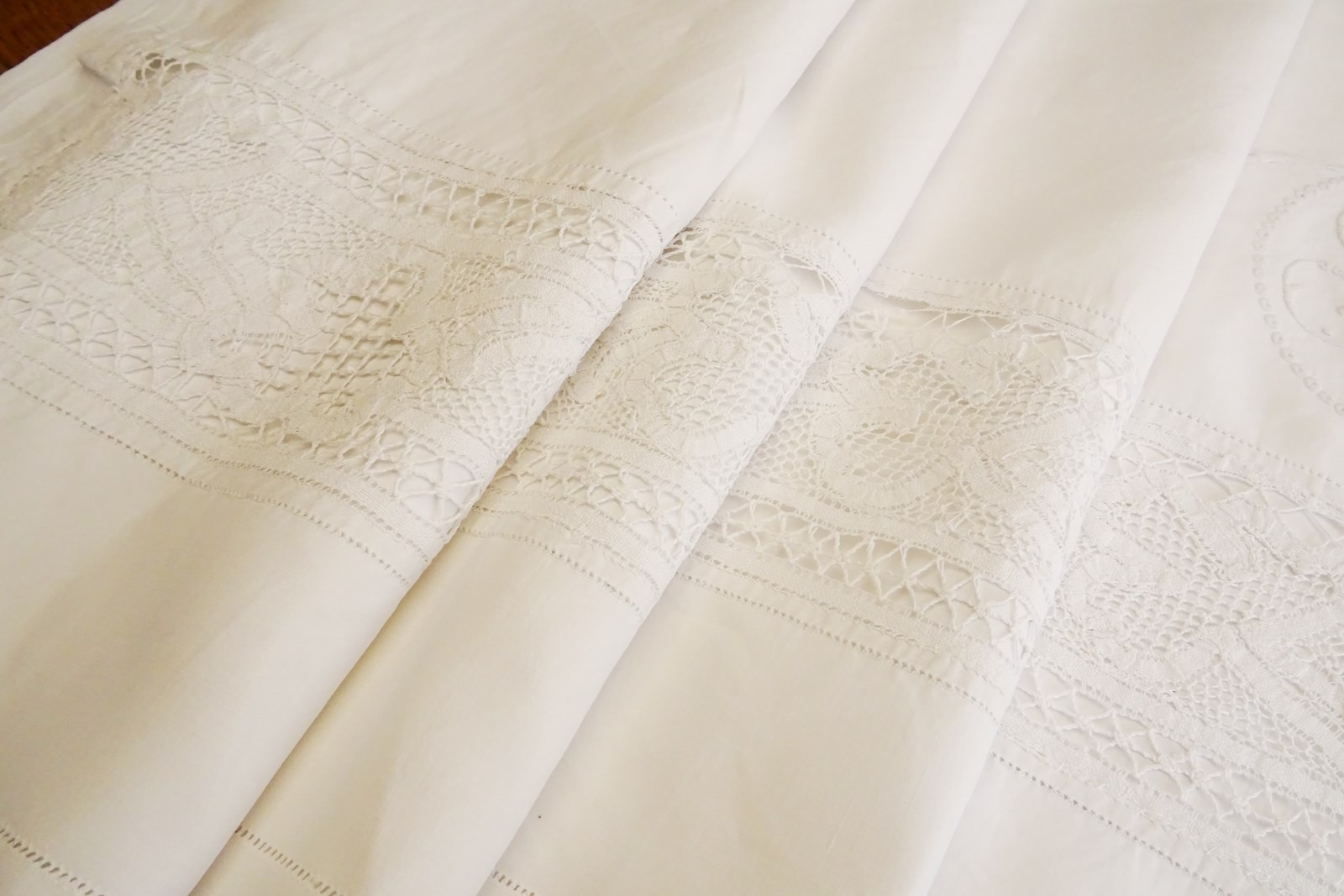 A beautiful white pure linen sheet with wide lace panels below a delightful monogram of the letters JL (SL?YL?) set within a ribbon detail. It's a delightful piece. In very good condition, freshly laundered and ready for use.