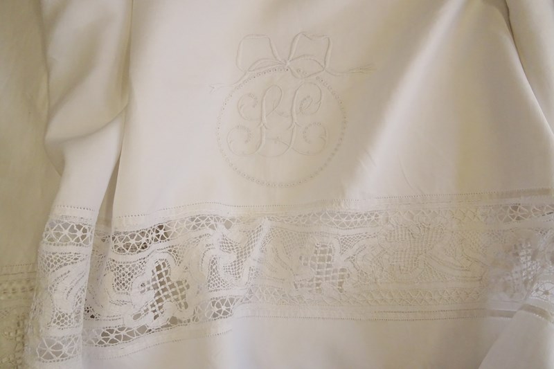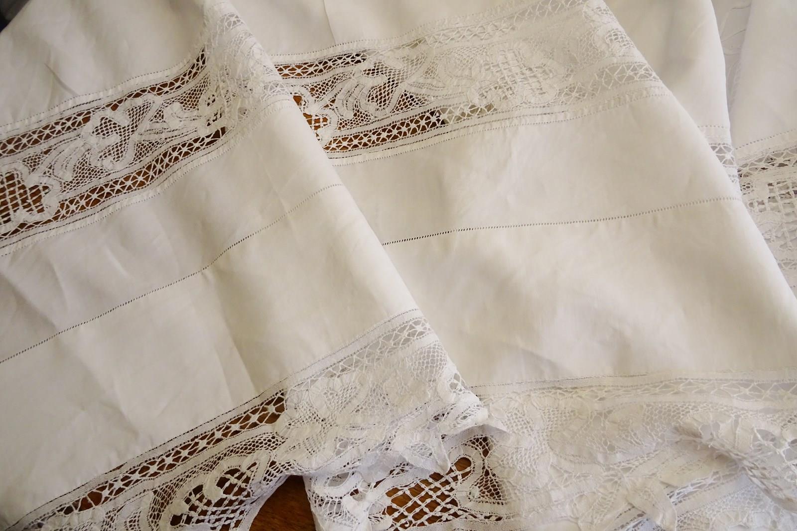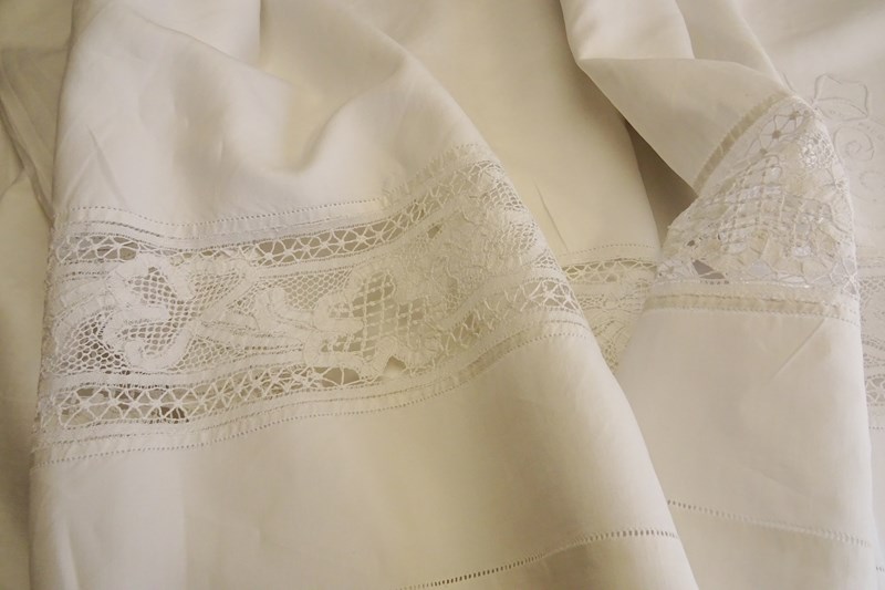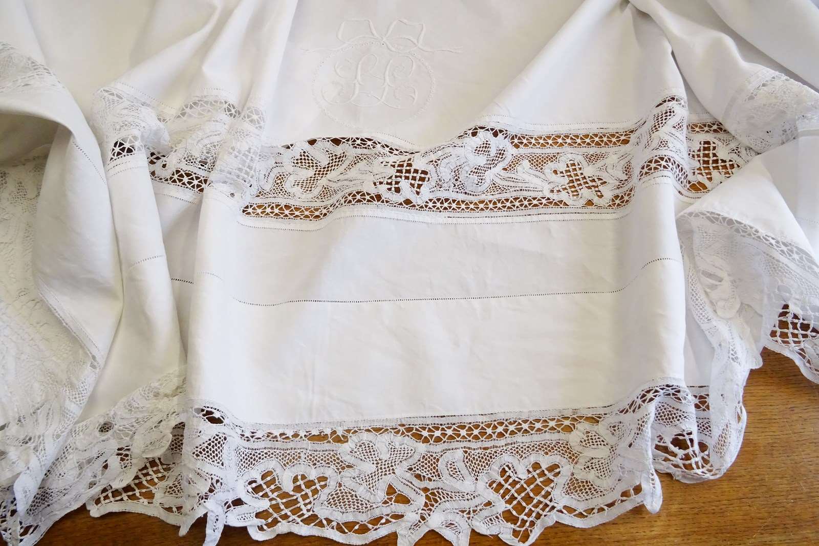 A beautiful white pure linen sheet with wide lace panels below a delightful monogram of the letters JL (SL?YL?) set within a ribbon detail. It's a delightful piece. In very good condition, freshly laundered and ready for use.