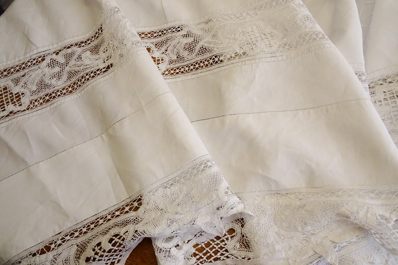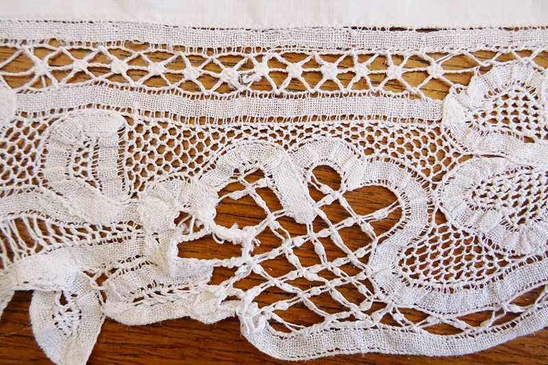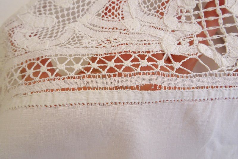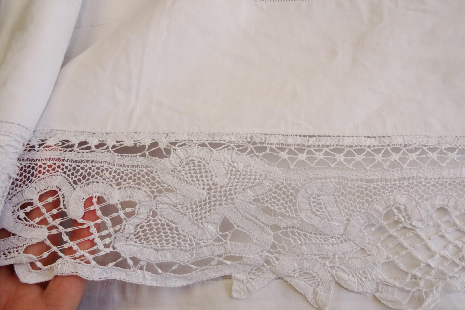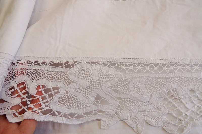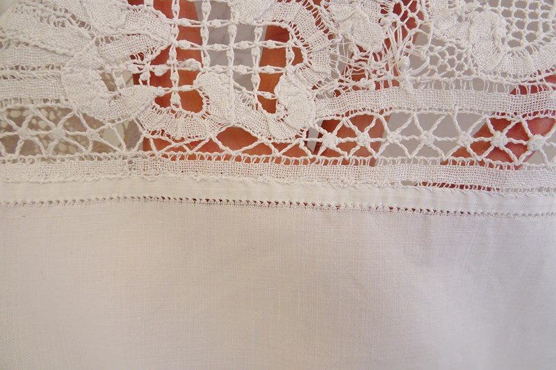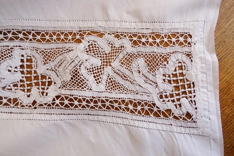 One pin hole, one tiny darn and some repairs and slight wear to the lace. The linen is crisp and this piece is perfectly suitable for use as regular bedding.