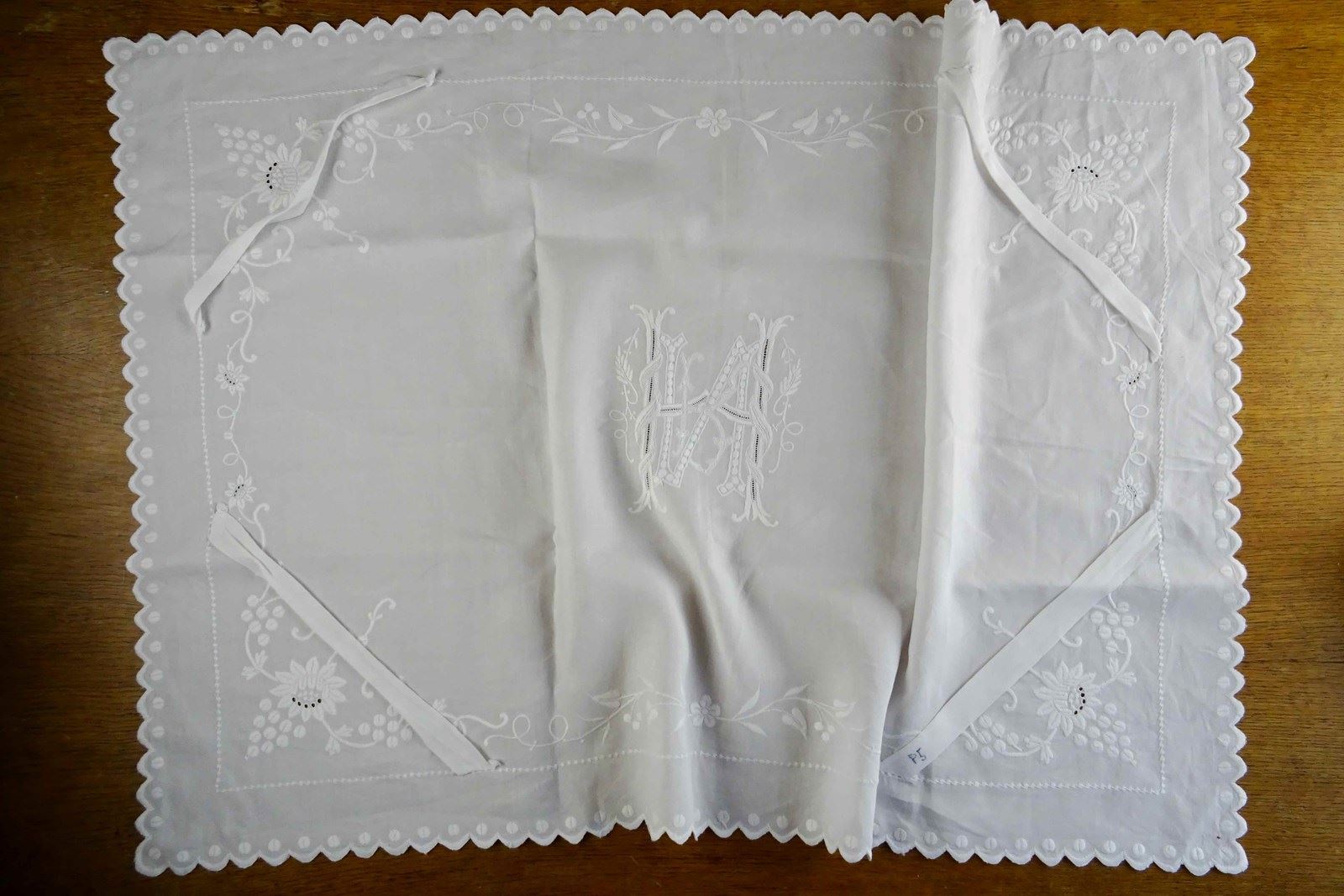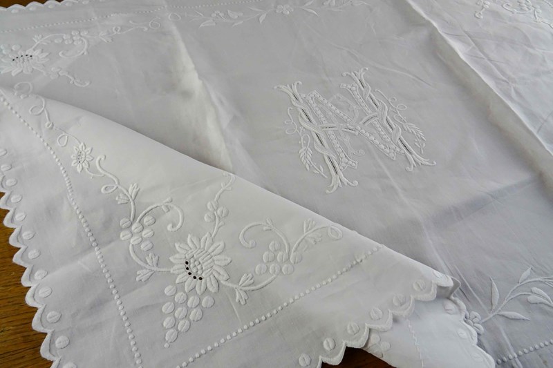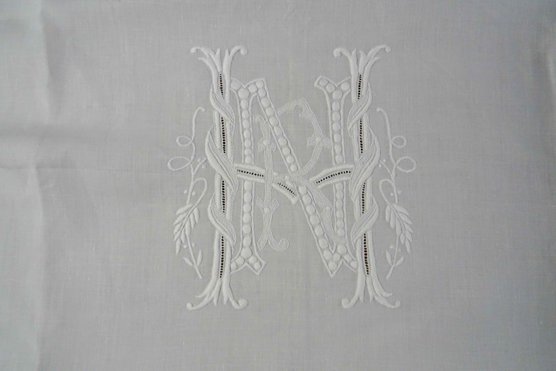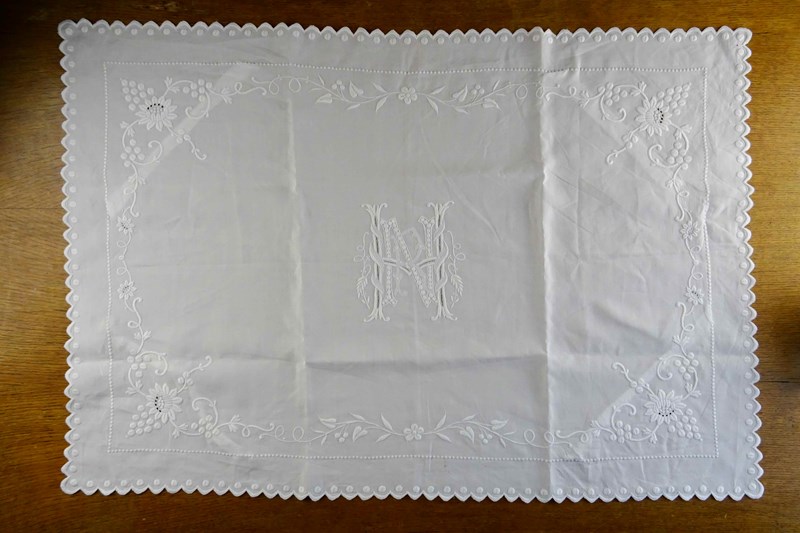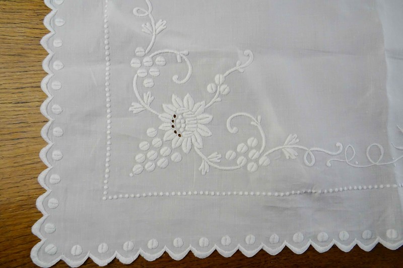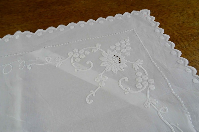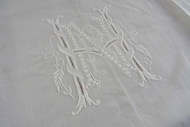 It is a fine white linen hand embroidered pillowcase cover/front piece. I've never seen anything like it before but it was obviously designed to pop over a pillow as a showstopping decoration. I will just let the photos speak for me - all that hand worked decoration is fabulous.