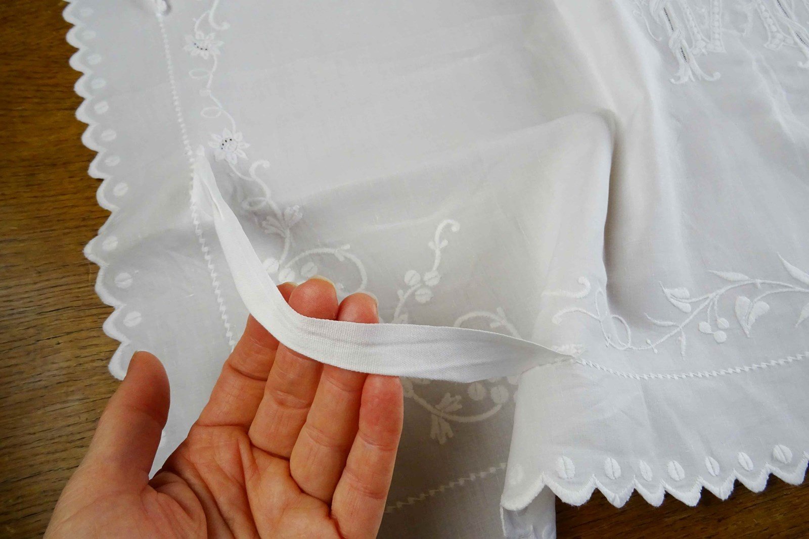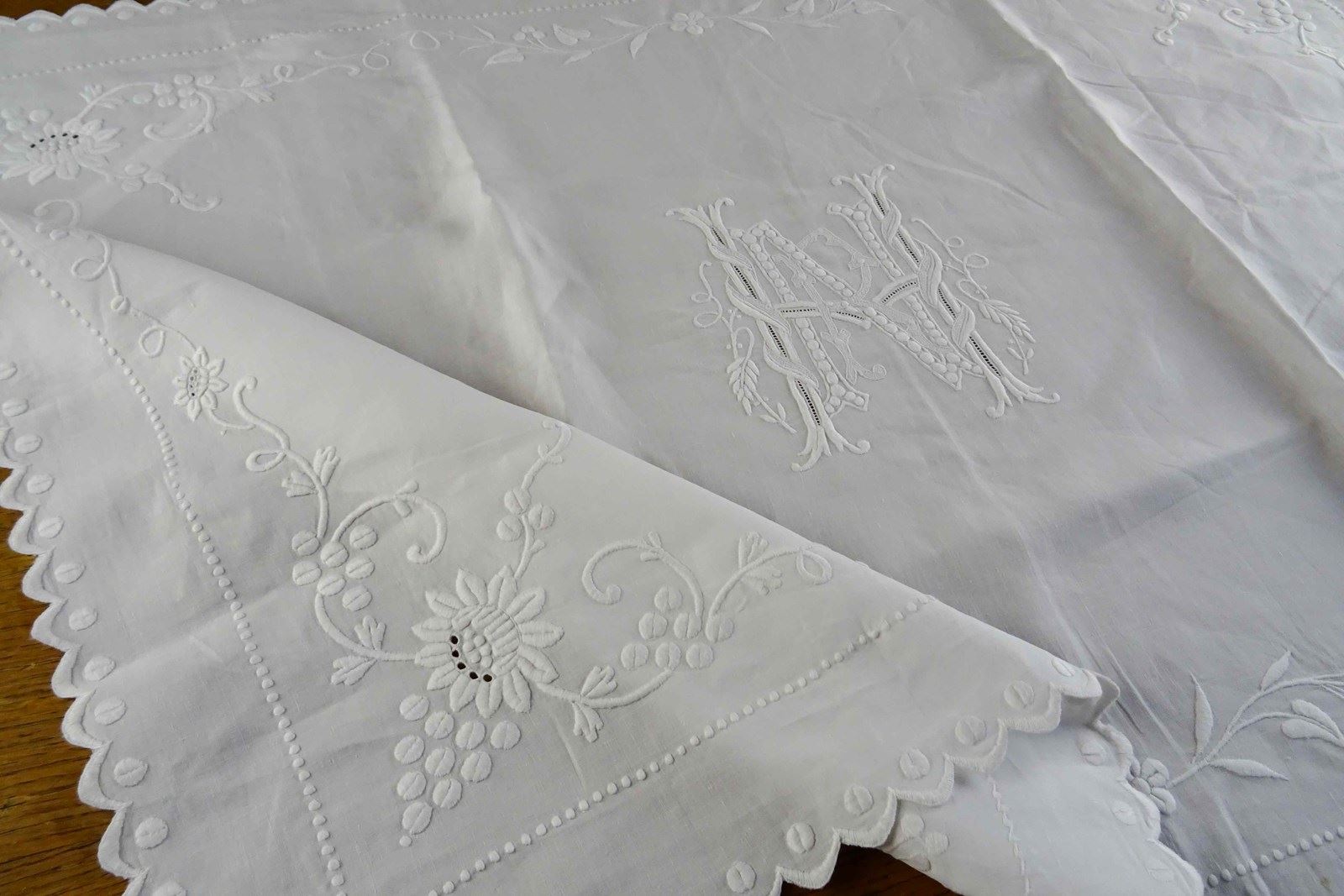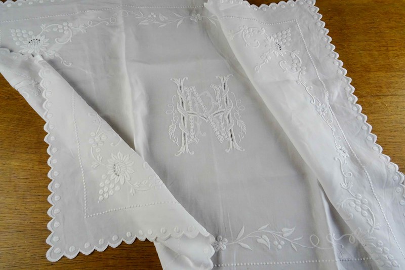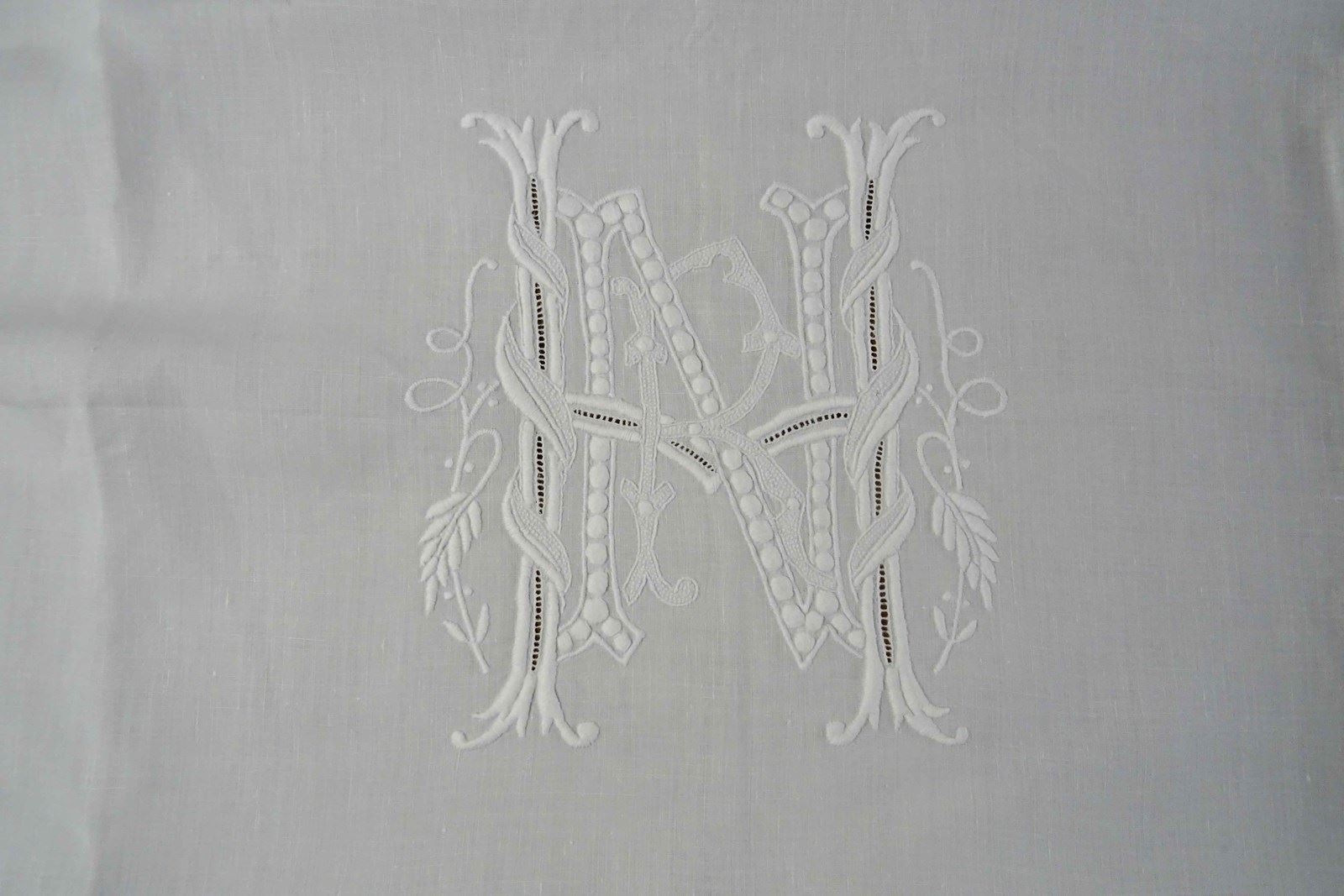 It is a fine white linen hand embroidered pillowcase cover/front piece. I've never seen anything like it before but it was obviously designed to pop over a pillow as a showstopping decoration. I will just let the photos speak for me - all that hand worked decoration is fabulous.