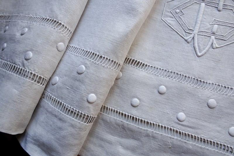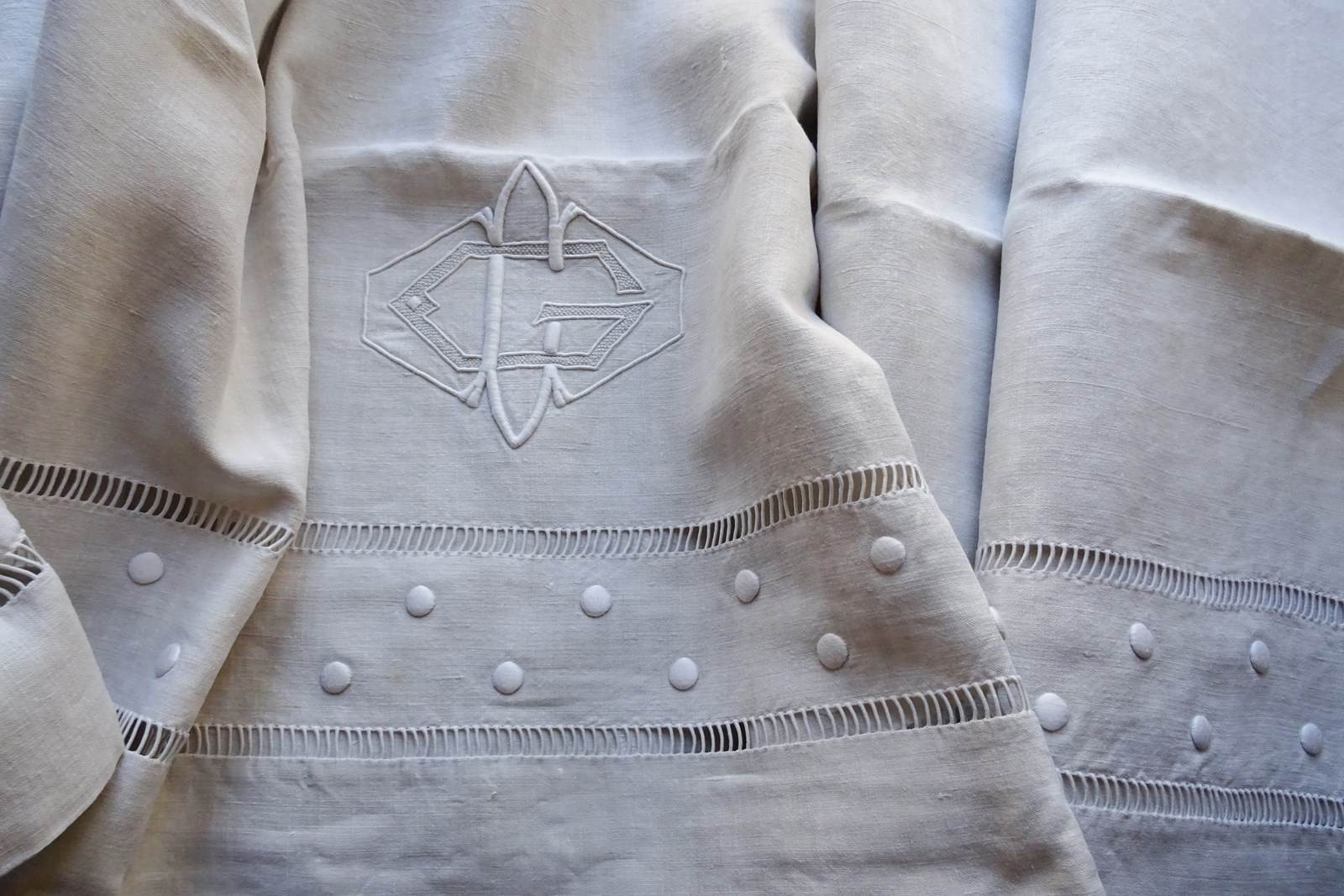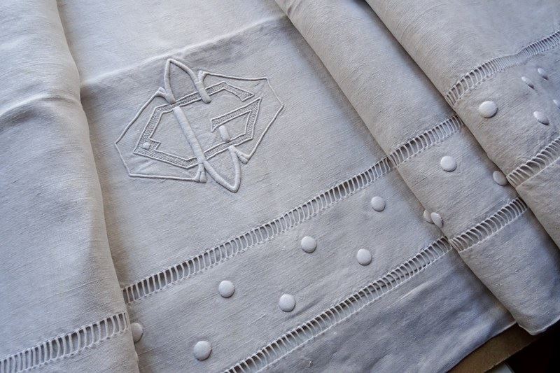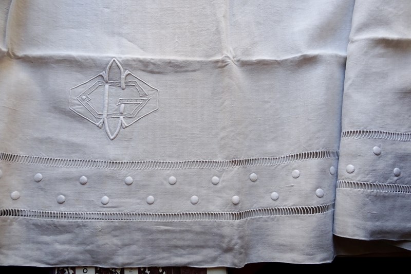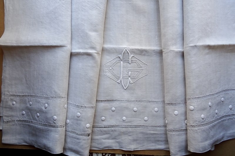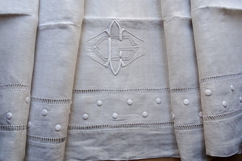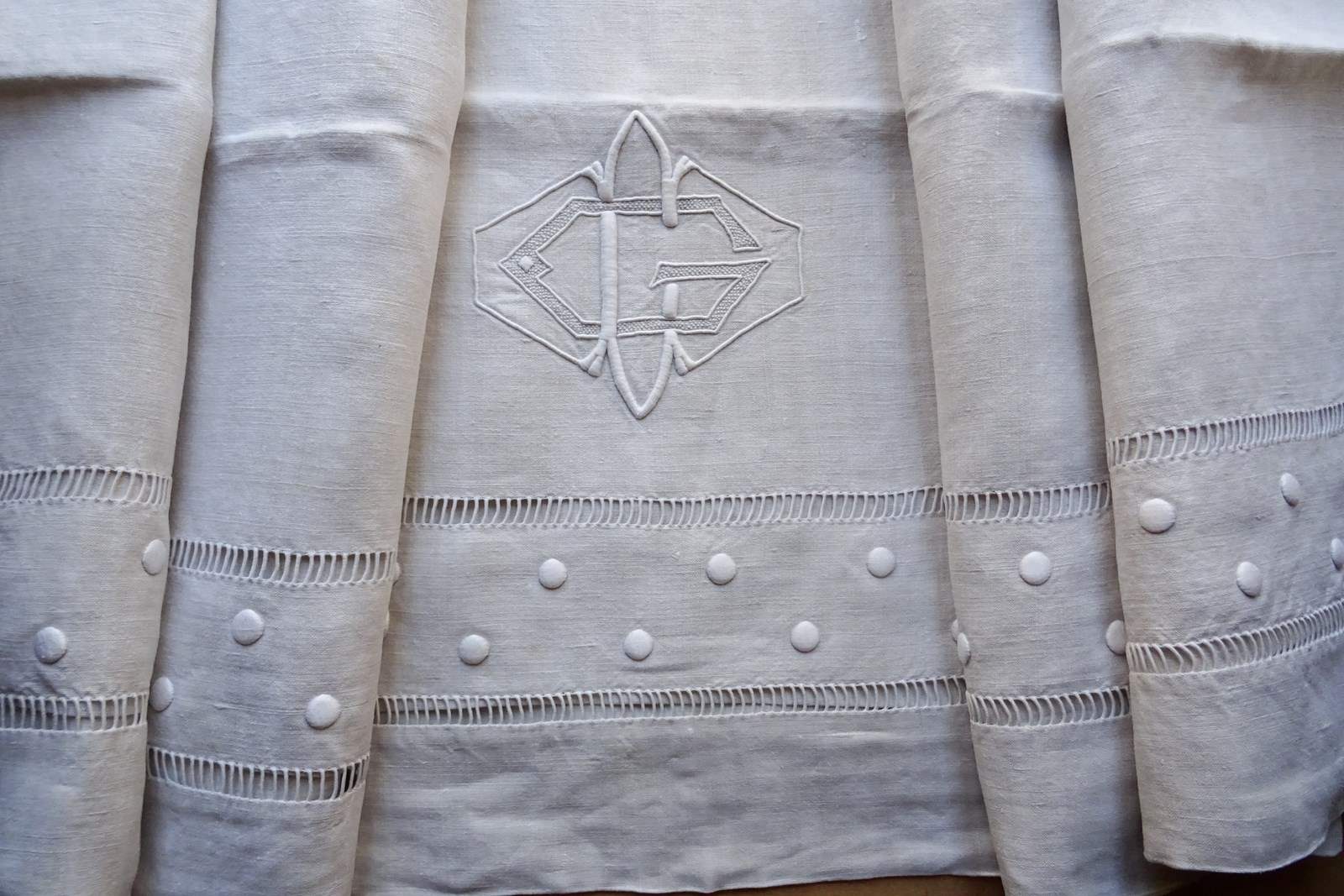 Another fabulous hand embroidered heavy linen sheet. The linen has a real country feel to it but the workmanship is smart - I love a row of padded dots! Central monogram of the letters CG/GC I think. This is one of three that came from the same household in central France.