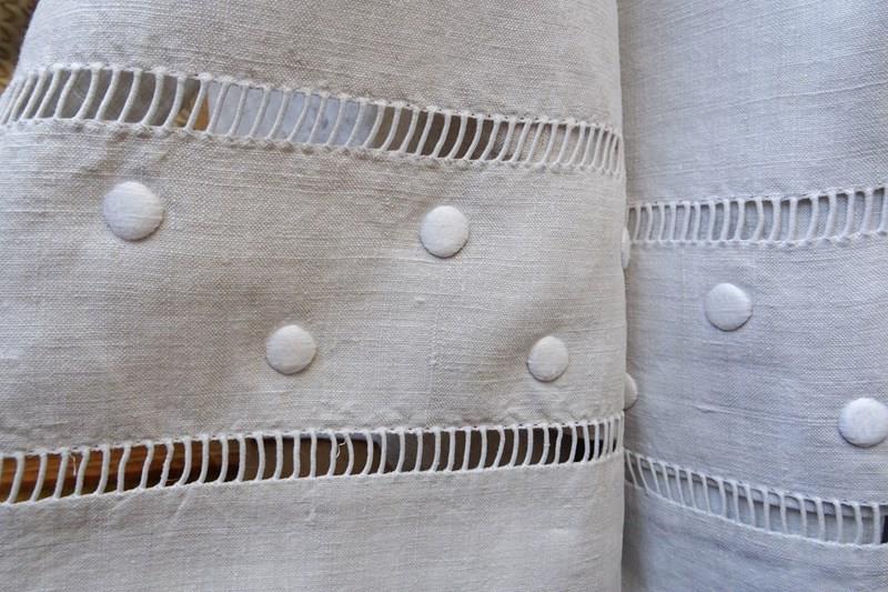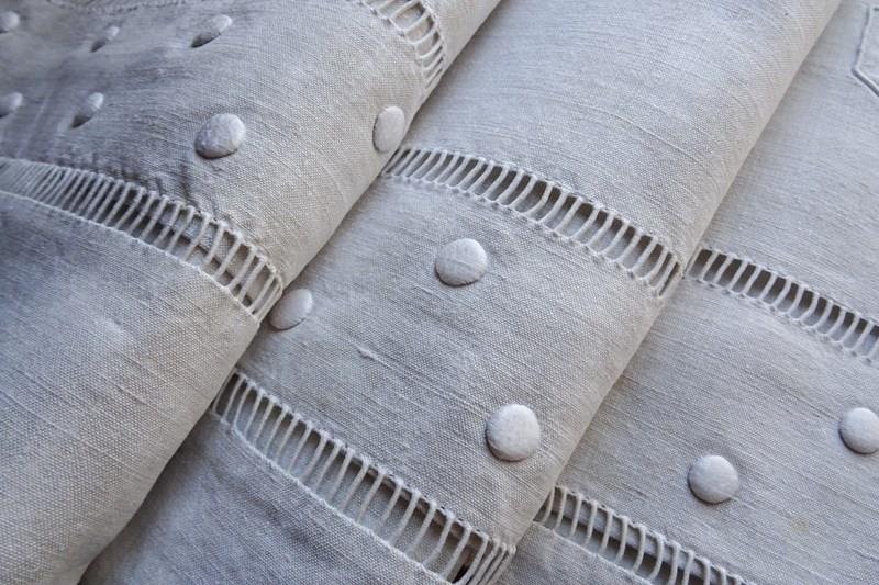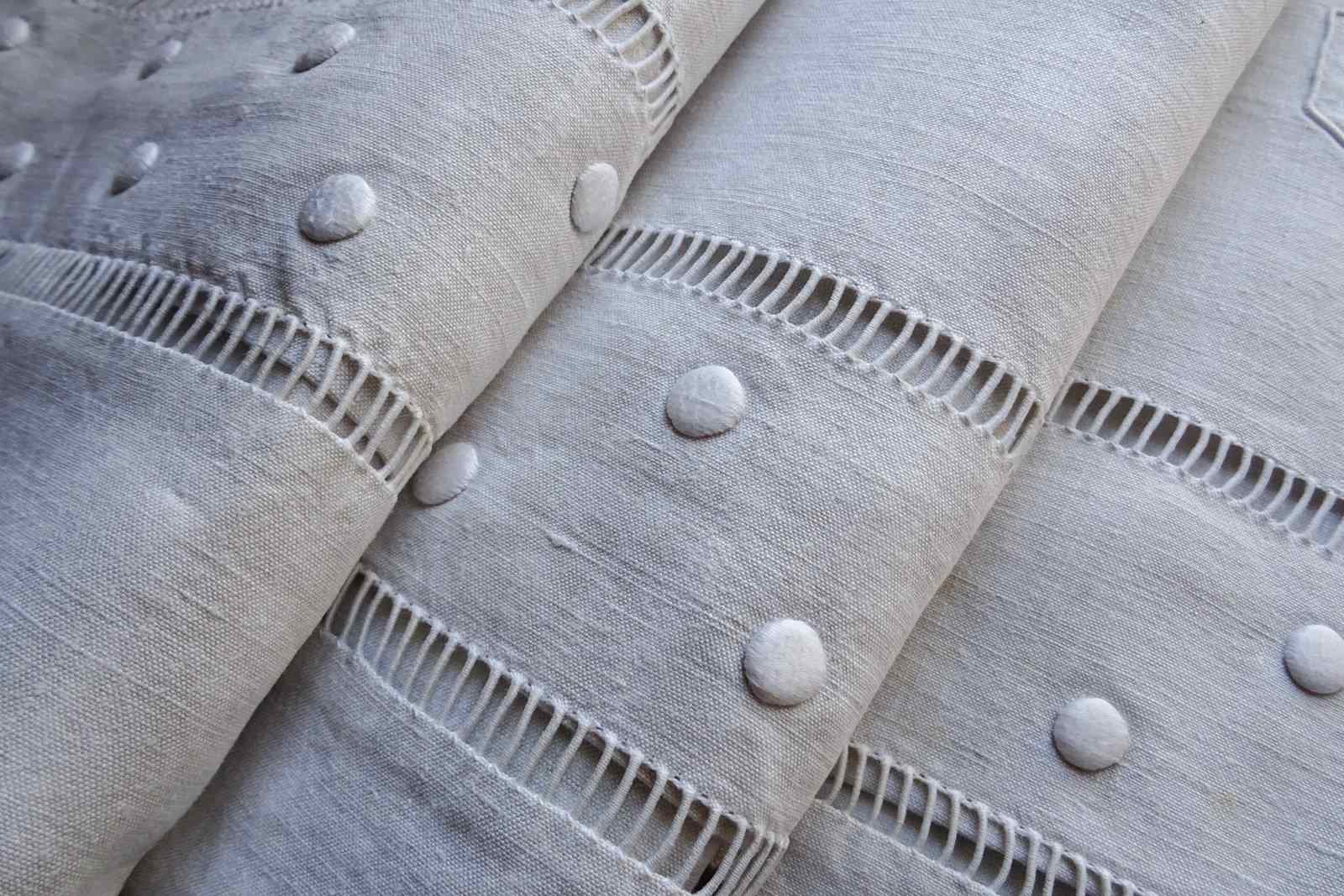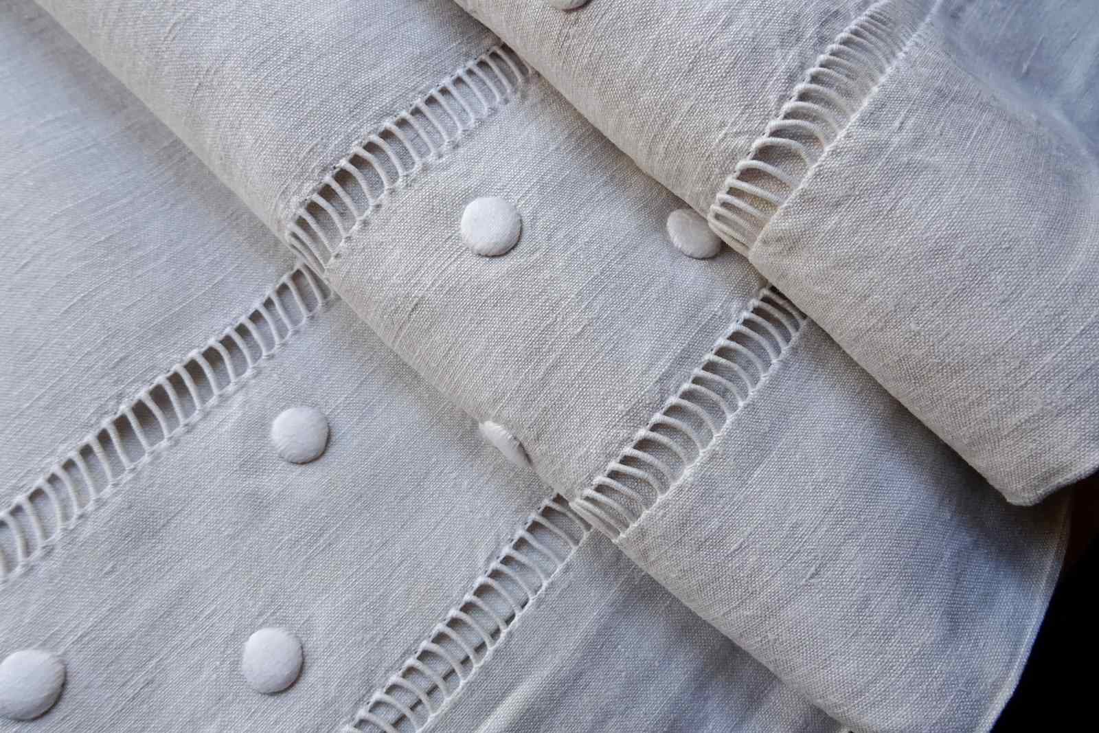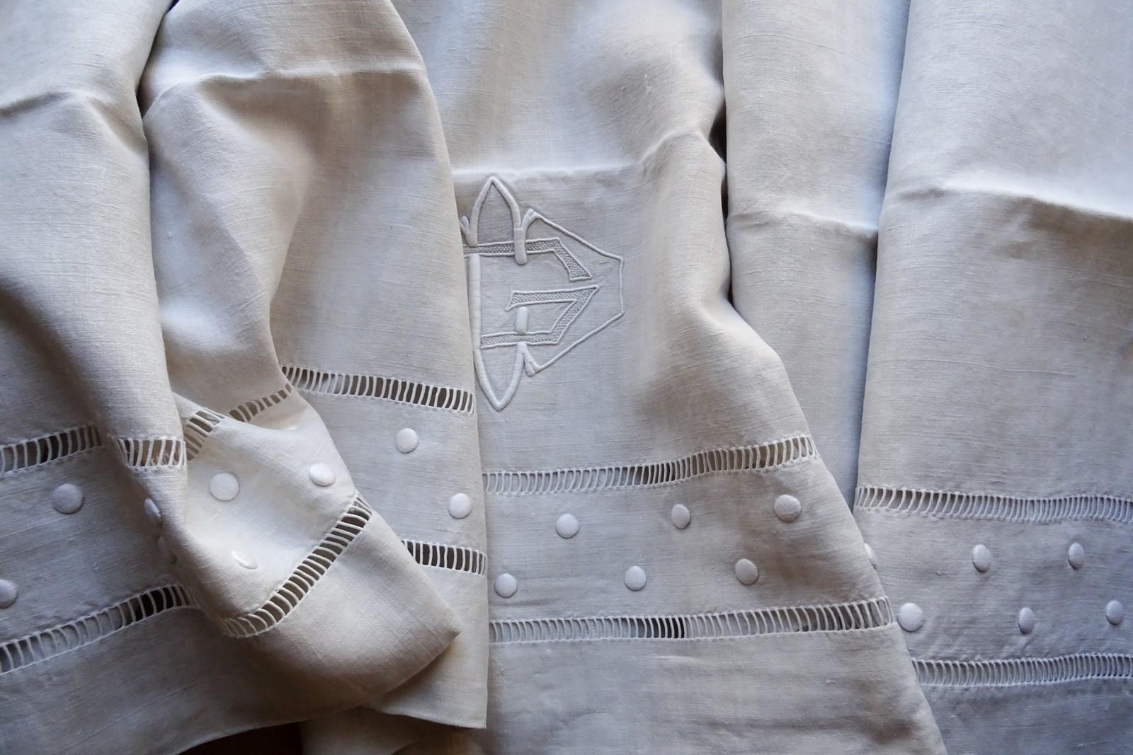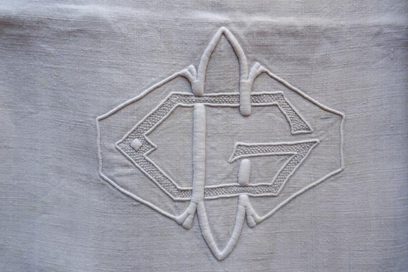 Another fabulous hand embroidered heavy linen sheet. The linen has a real country feel to it but the workmanship is smart - I love a row of padded dots! Central monogram of the letters CG/GC I think. This is one of three that came from the same household in central France.