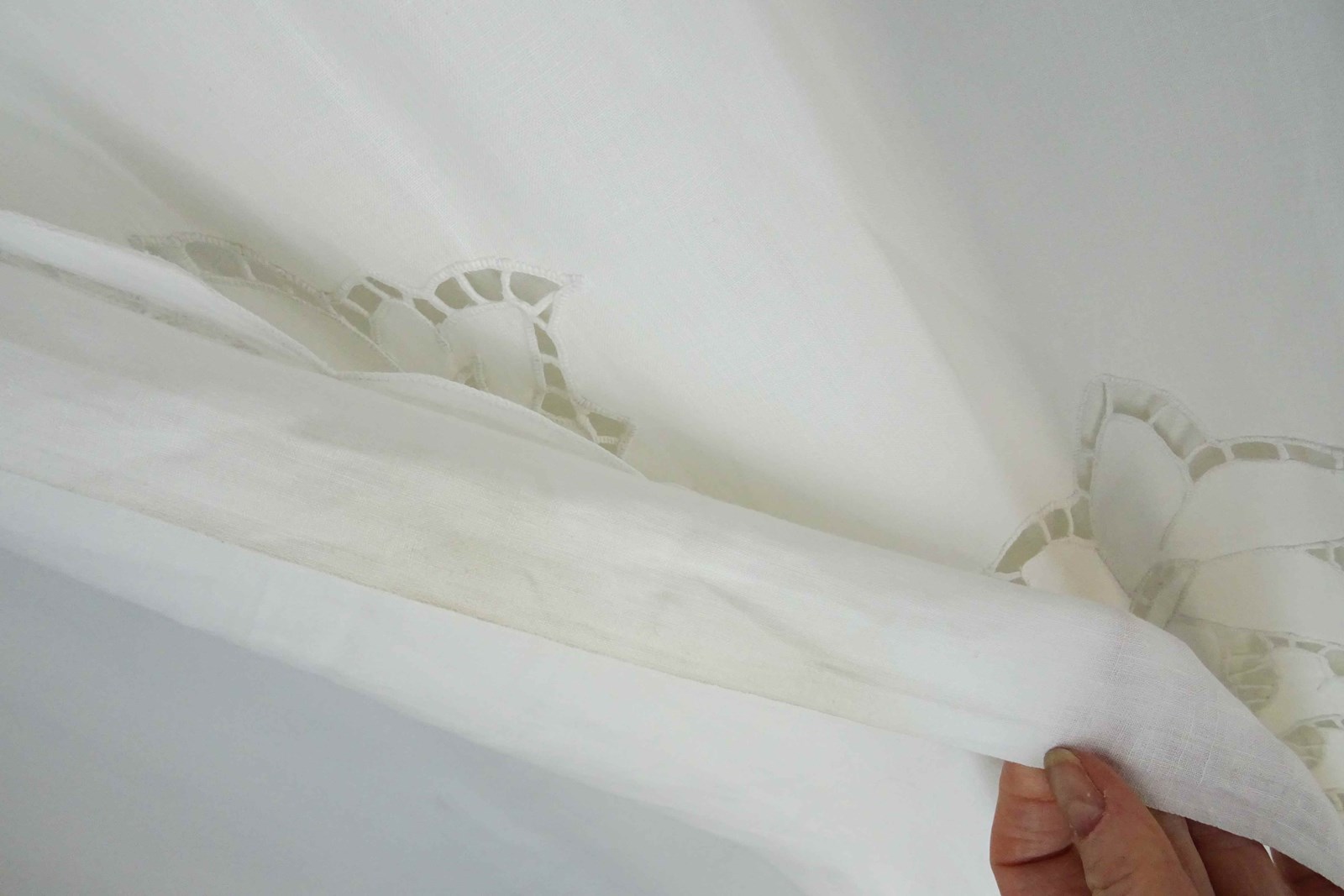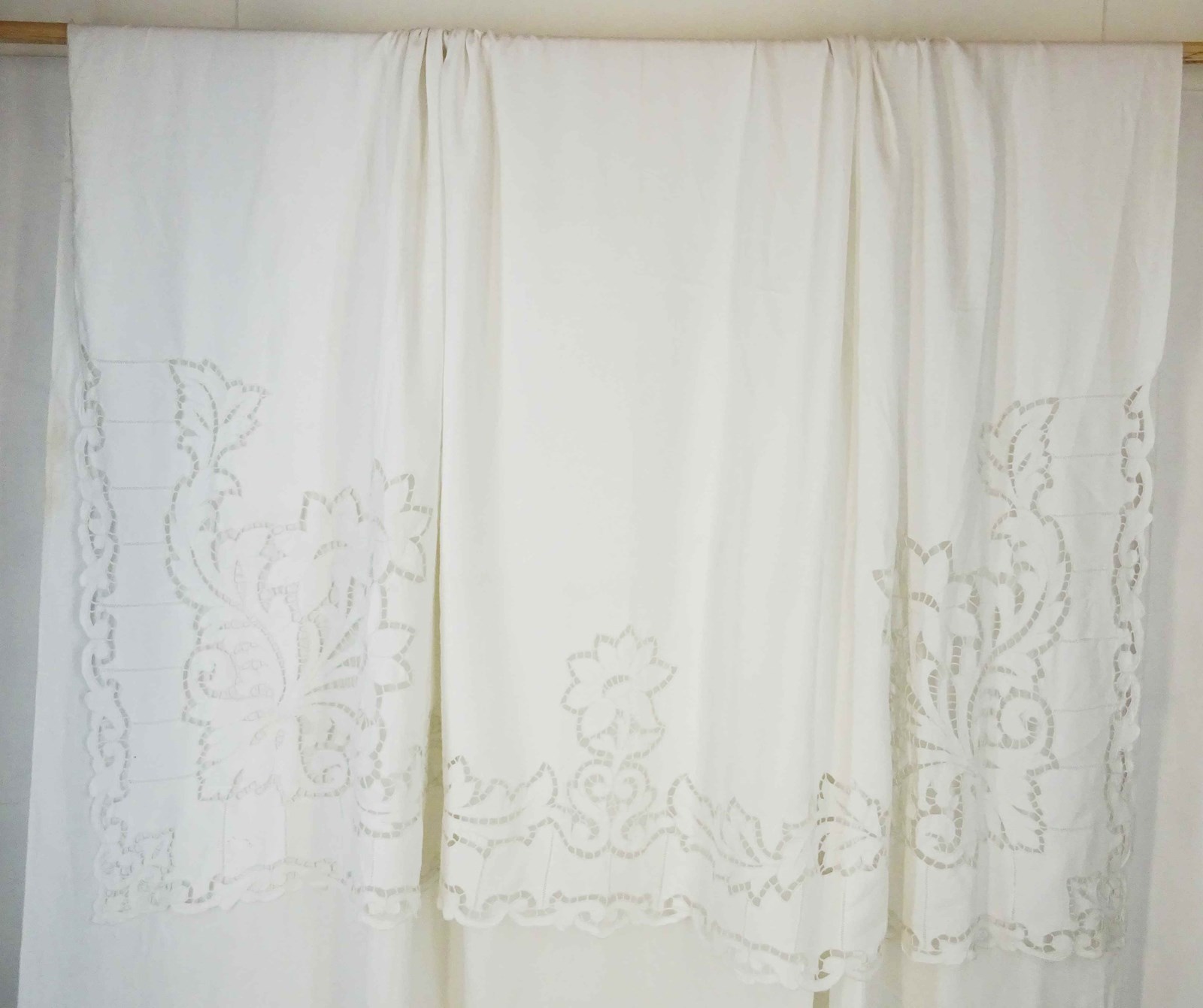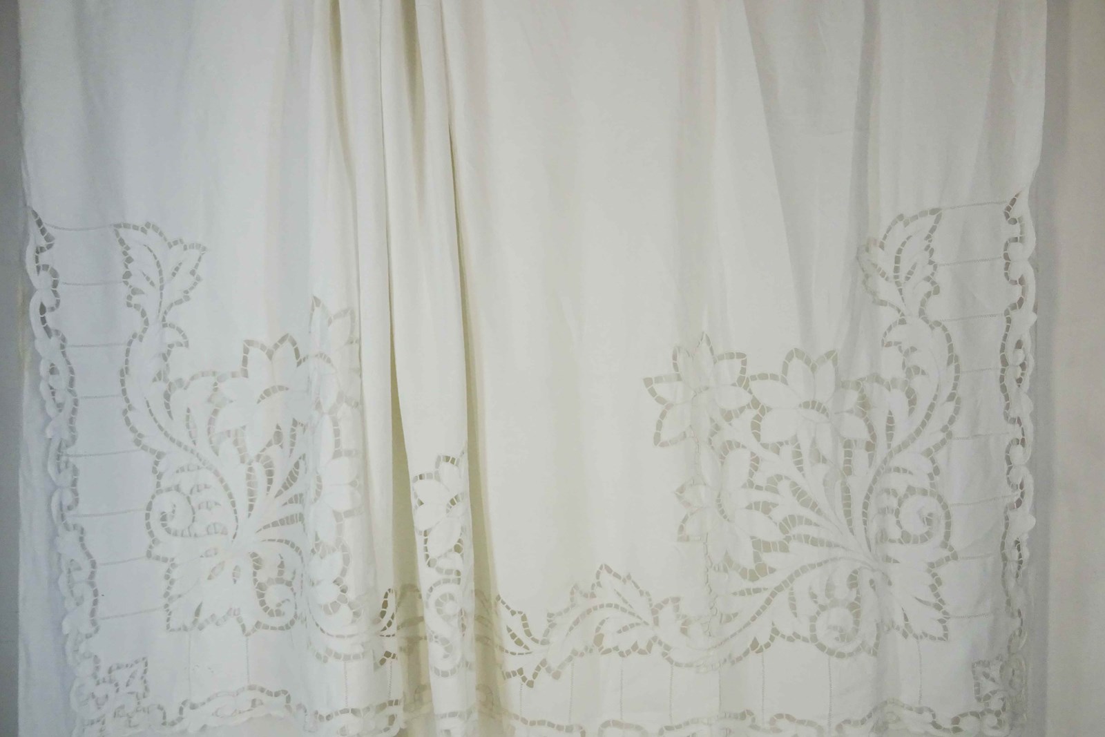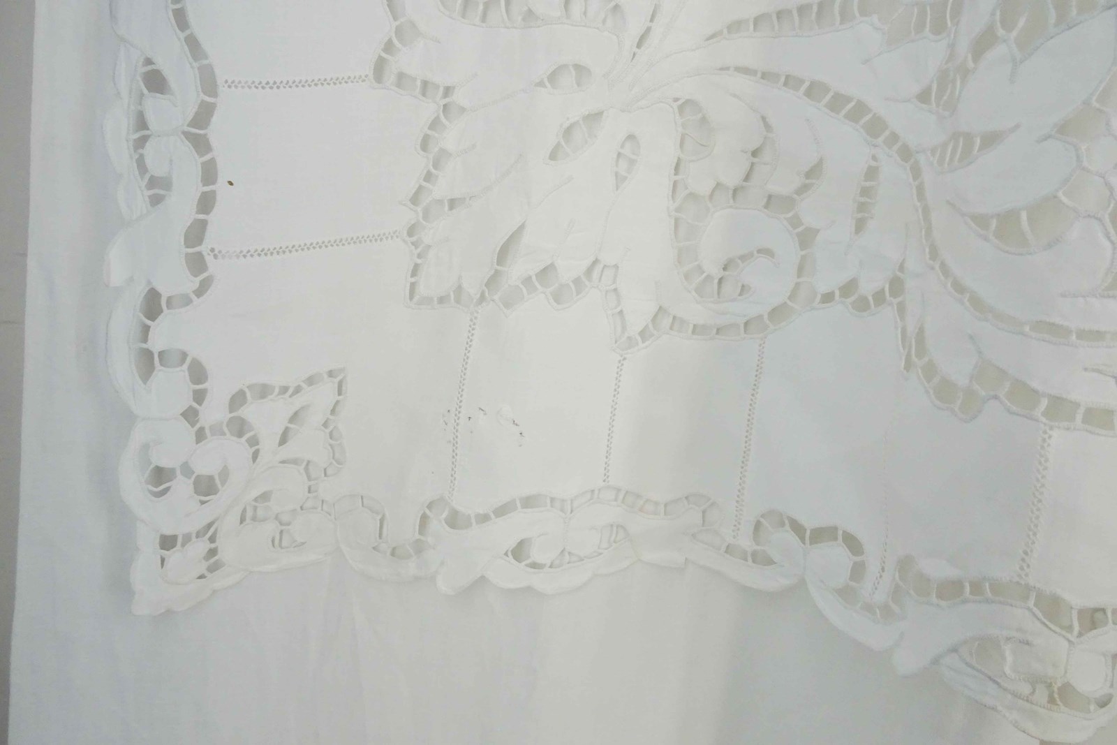 What can I say? You really do not find sheets like this very often these days. This is a highly decorative and huge pure linen sheet with an elaborate deep cutwork border which is of course all stitched by hand.