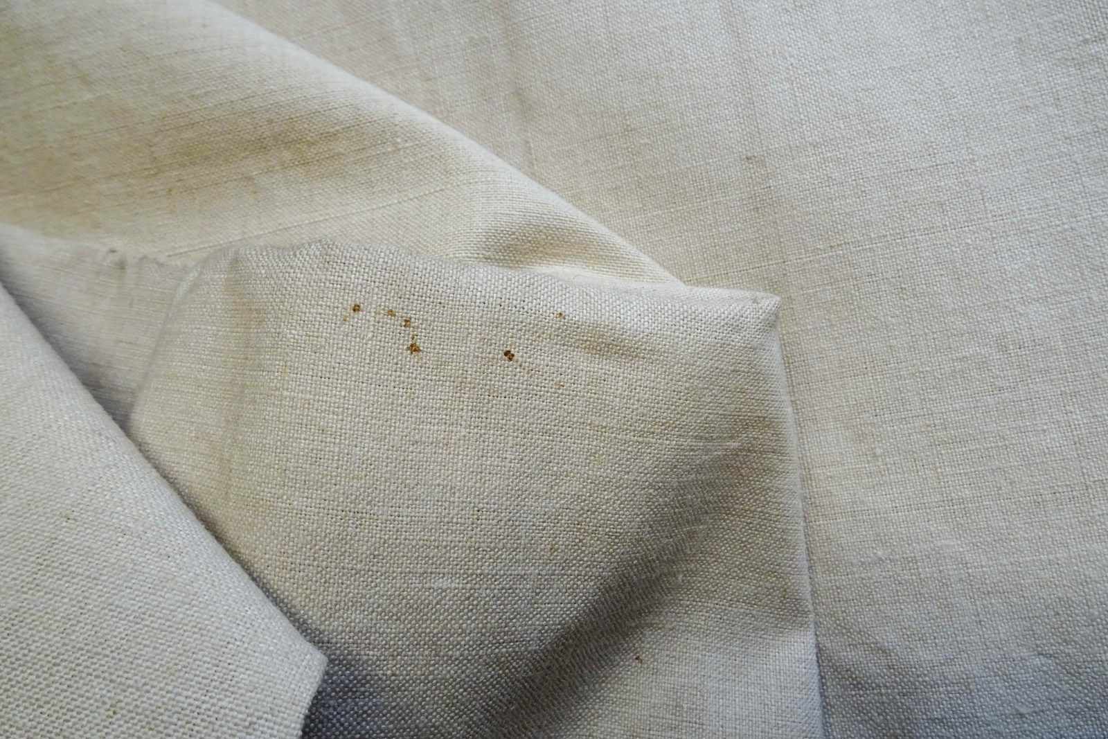 Some marks along the fold lines which you would expect. These should all fade away as the fabric is soaked and washed before use. Also a handful of tiny dot marks which may or may not come out; they don't seem to be rust spots. (I supply my laundry notes with purchase.)