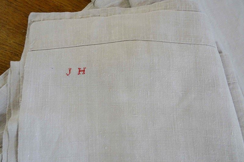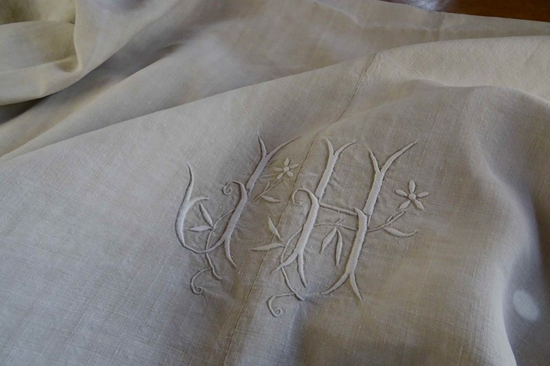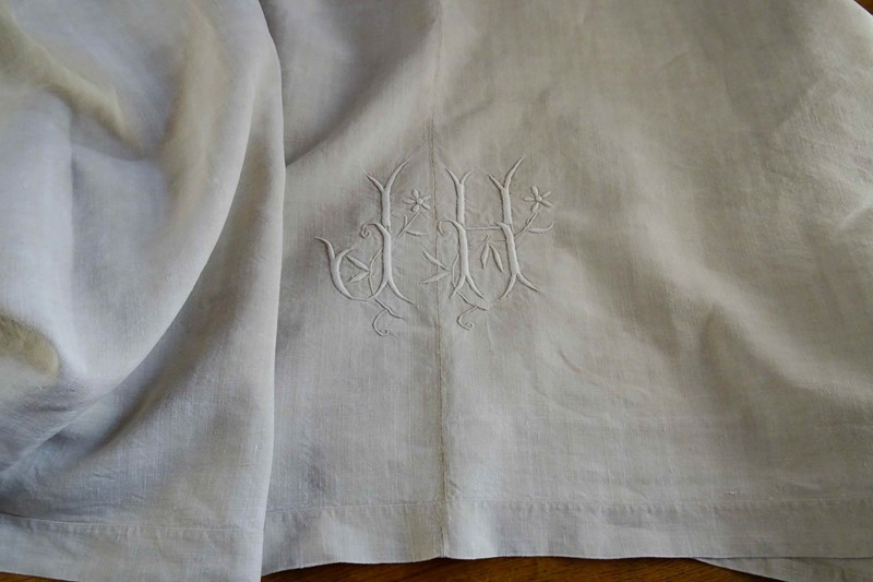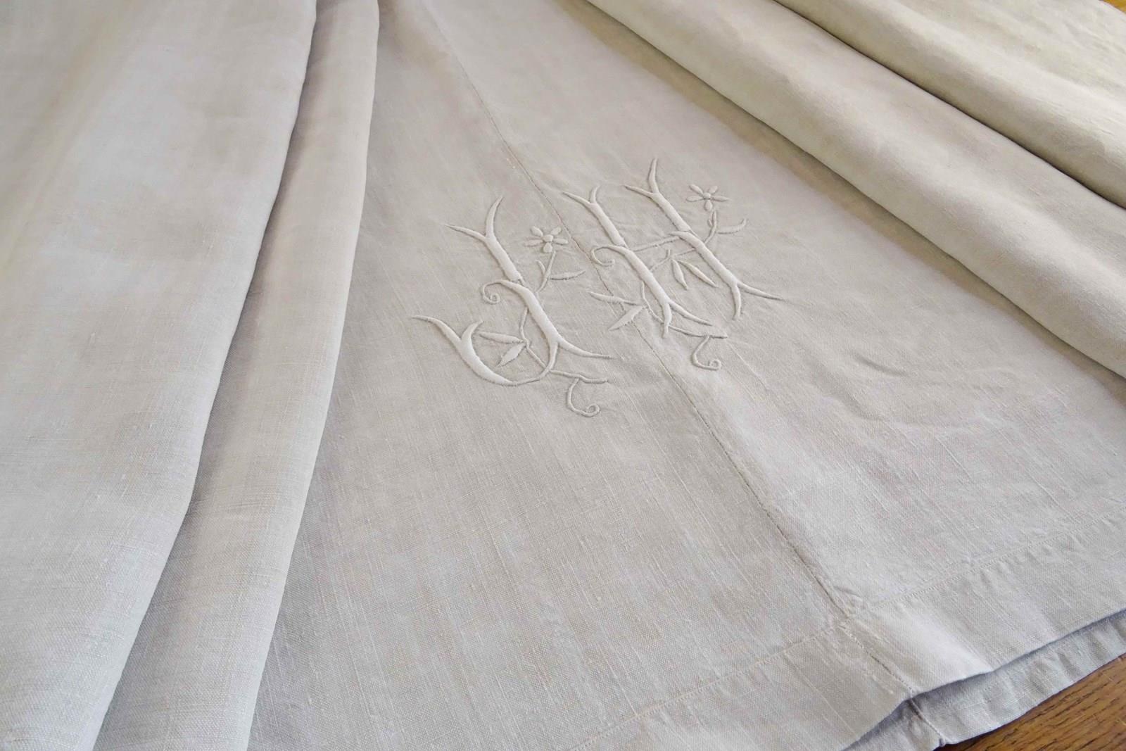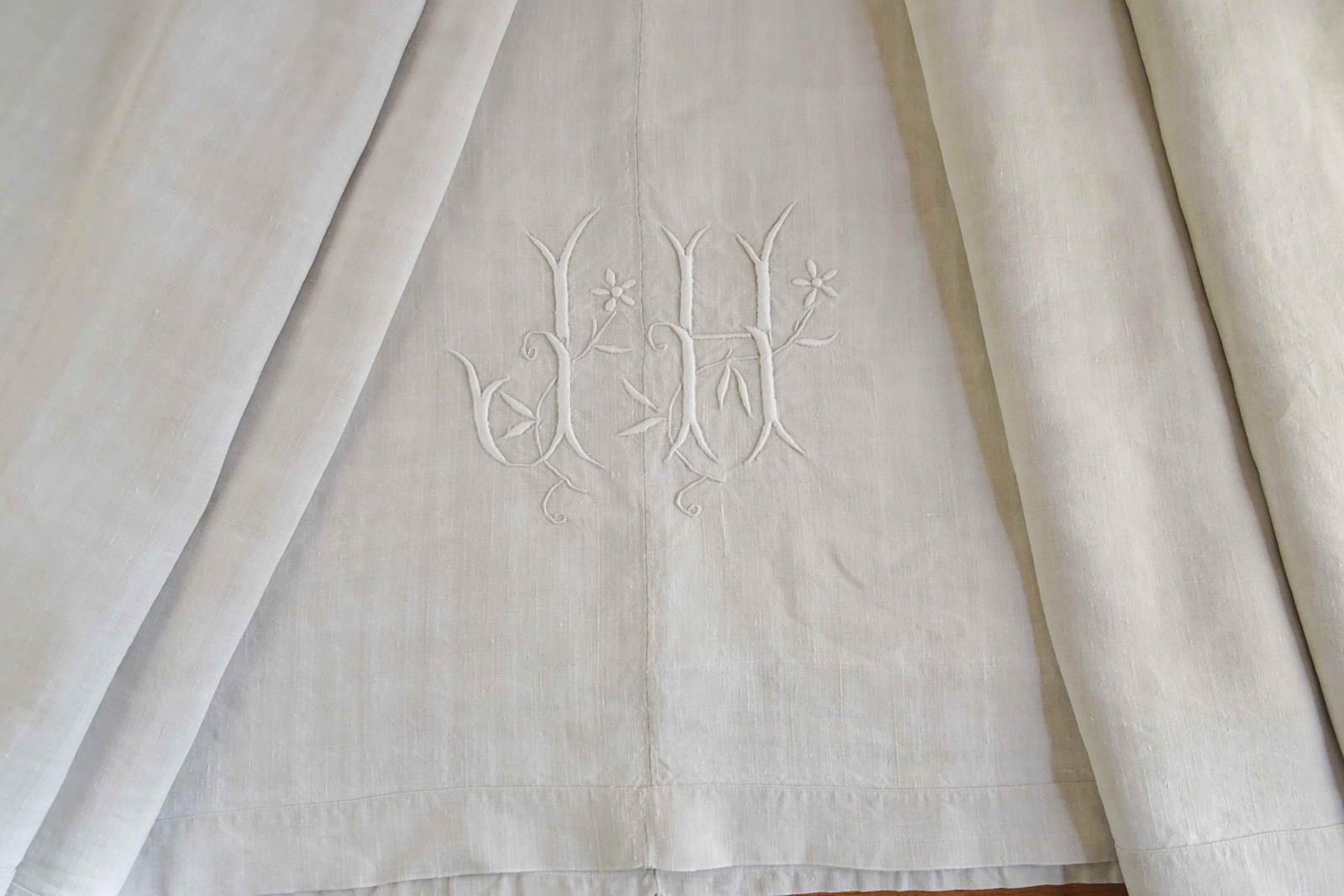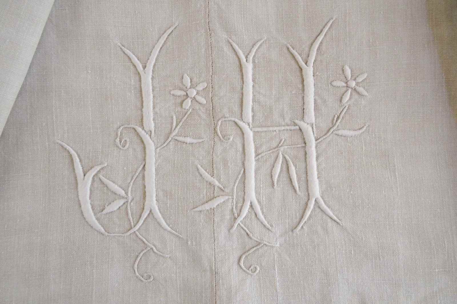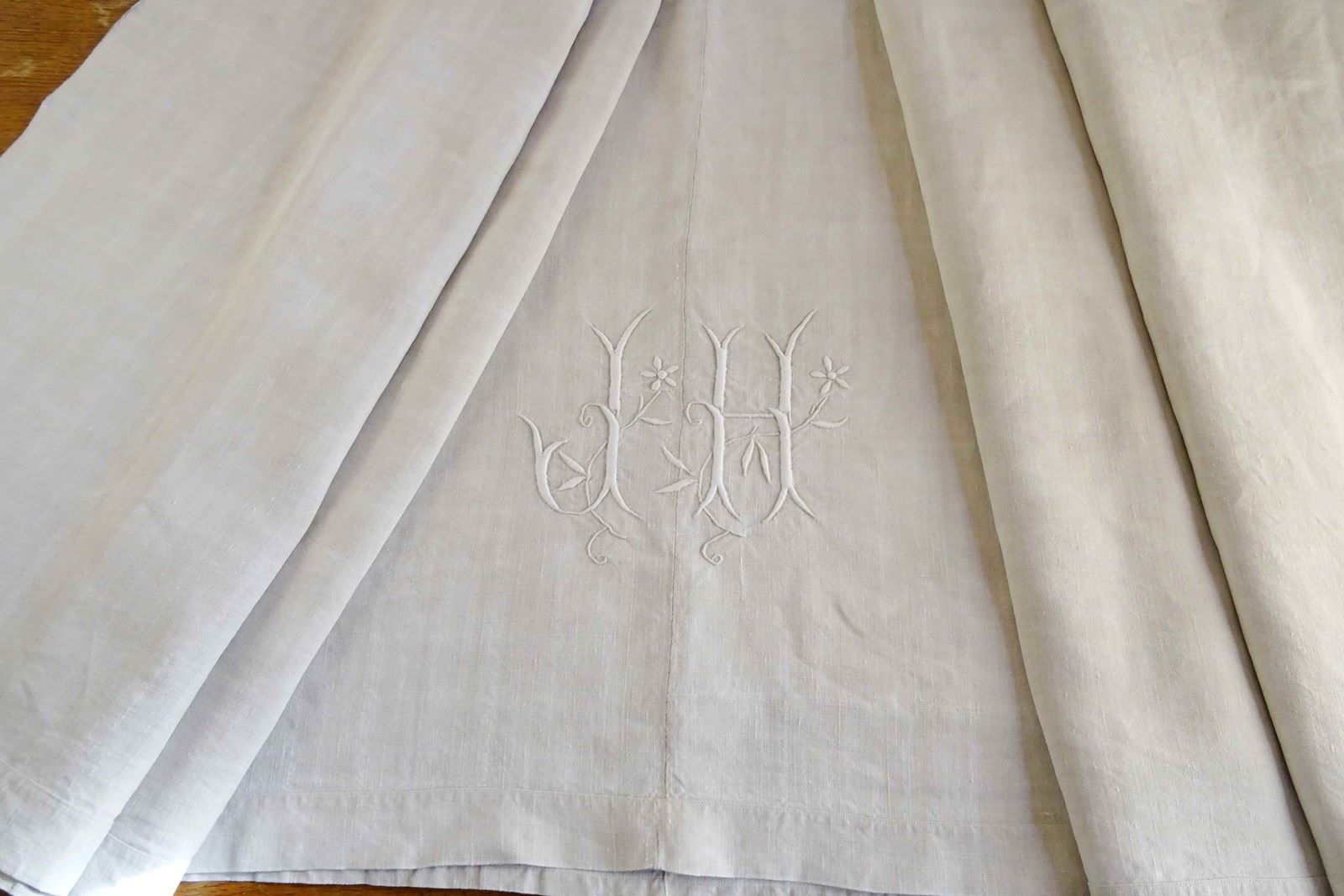 This sheet dates to around 1900-1920 and was woven on a narrow loom, hence the traditional hand stitched centre seam. Simple machine turned hems and a beautiful hand worked large monogram of the letters JH.