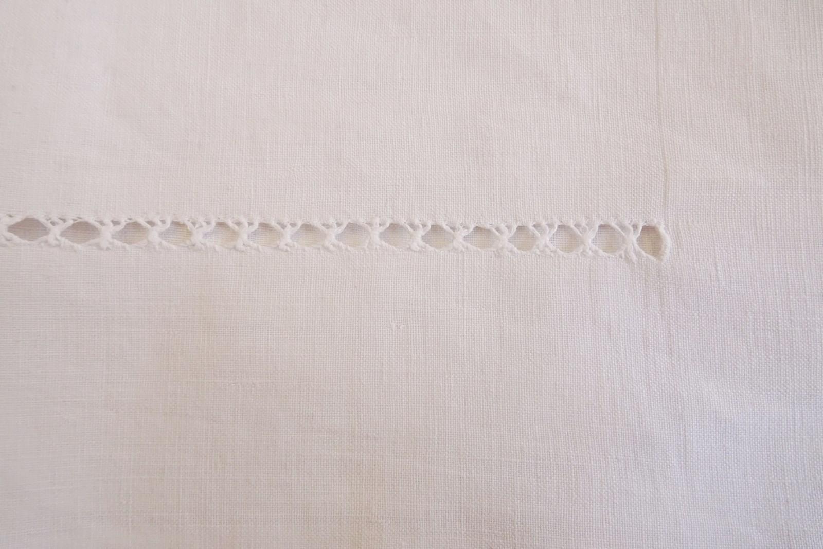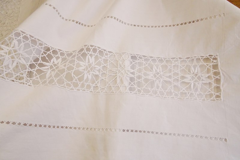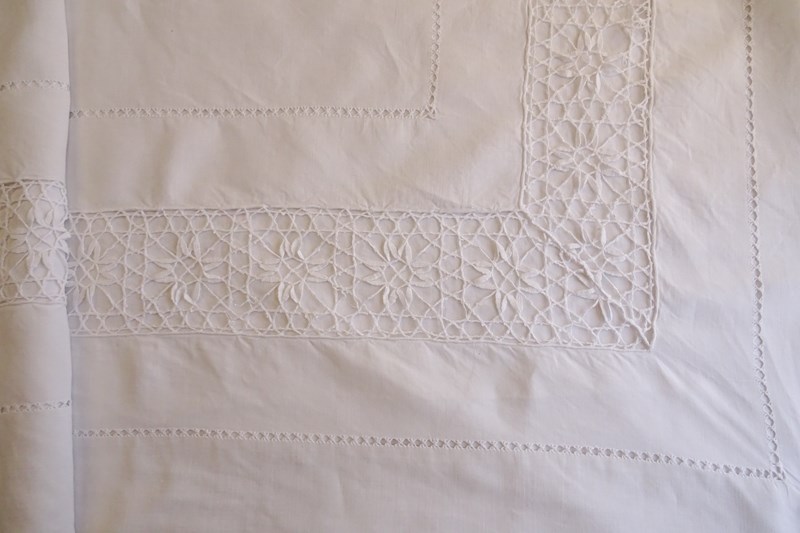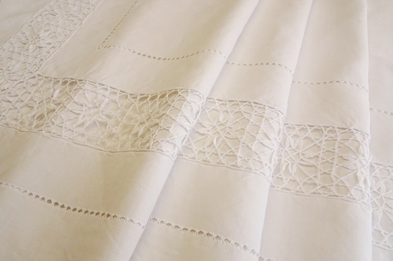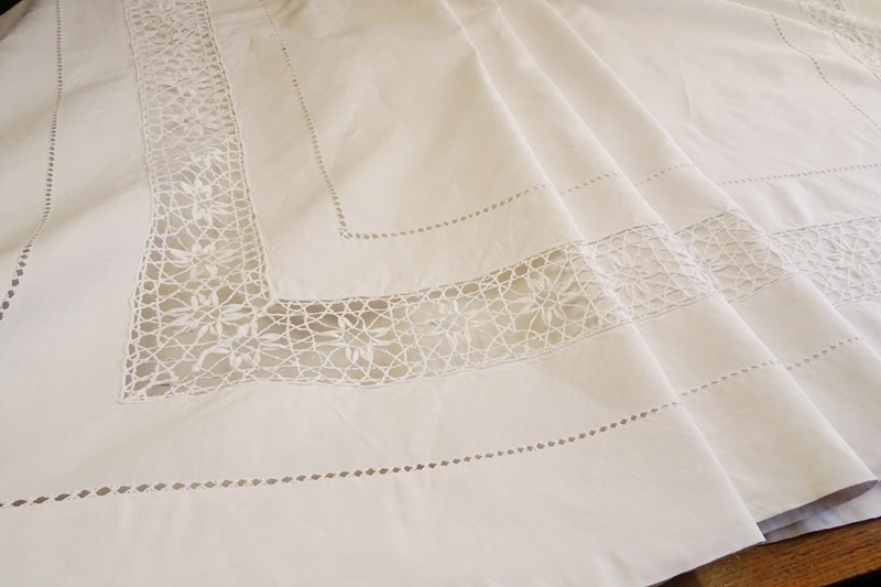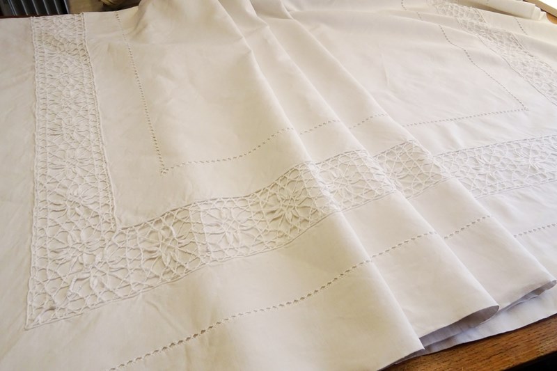 A beautiful very large white pure linen sheet with wide lace panel and drawn thread detail to the very deep return. It's a delightful piece. In very good condition, freshly laundered and ready for use.