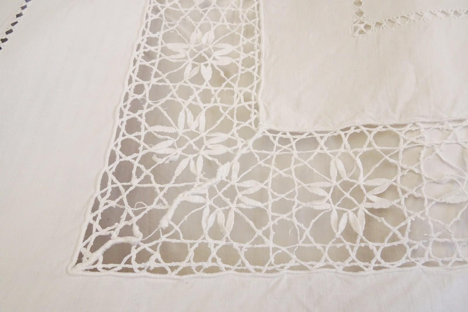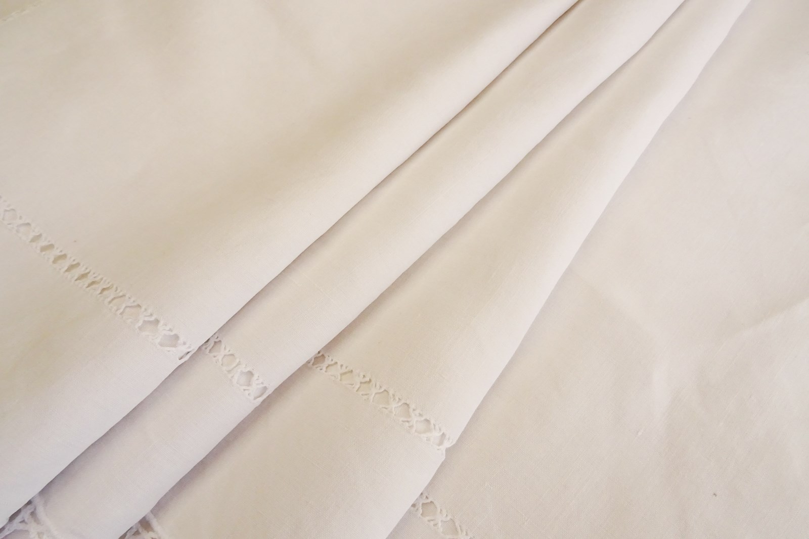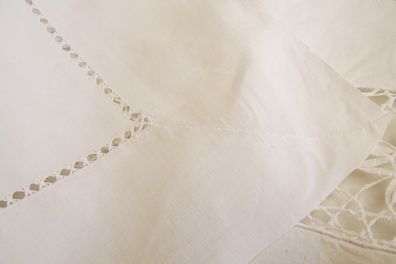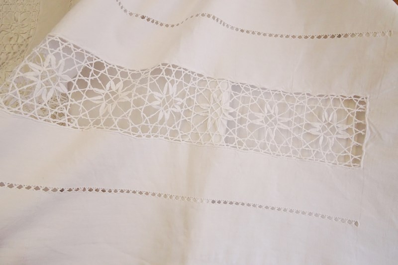 A beautiful very large white pure linen sheet with wide lace panel and drawn thread detail to the very deep return. It's a delightful piece. In very good condition, freshly laundered and ready for use.
