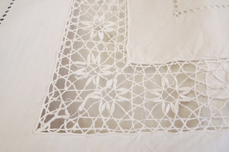 One small hole at the bottom/side of the sheet and a couple of pin holes and a weave imperfection or two, all very minimal things. As far as I can see, that is all, I don't think there is any damage to the lace. The linen is sturdy and this piece is perfectly suitable for use as regular bedding.